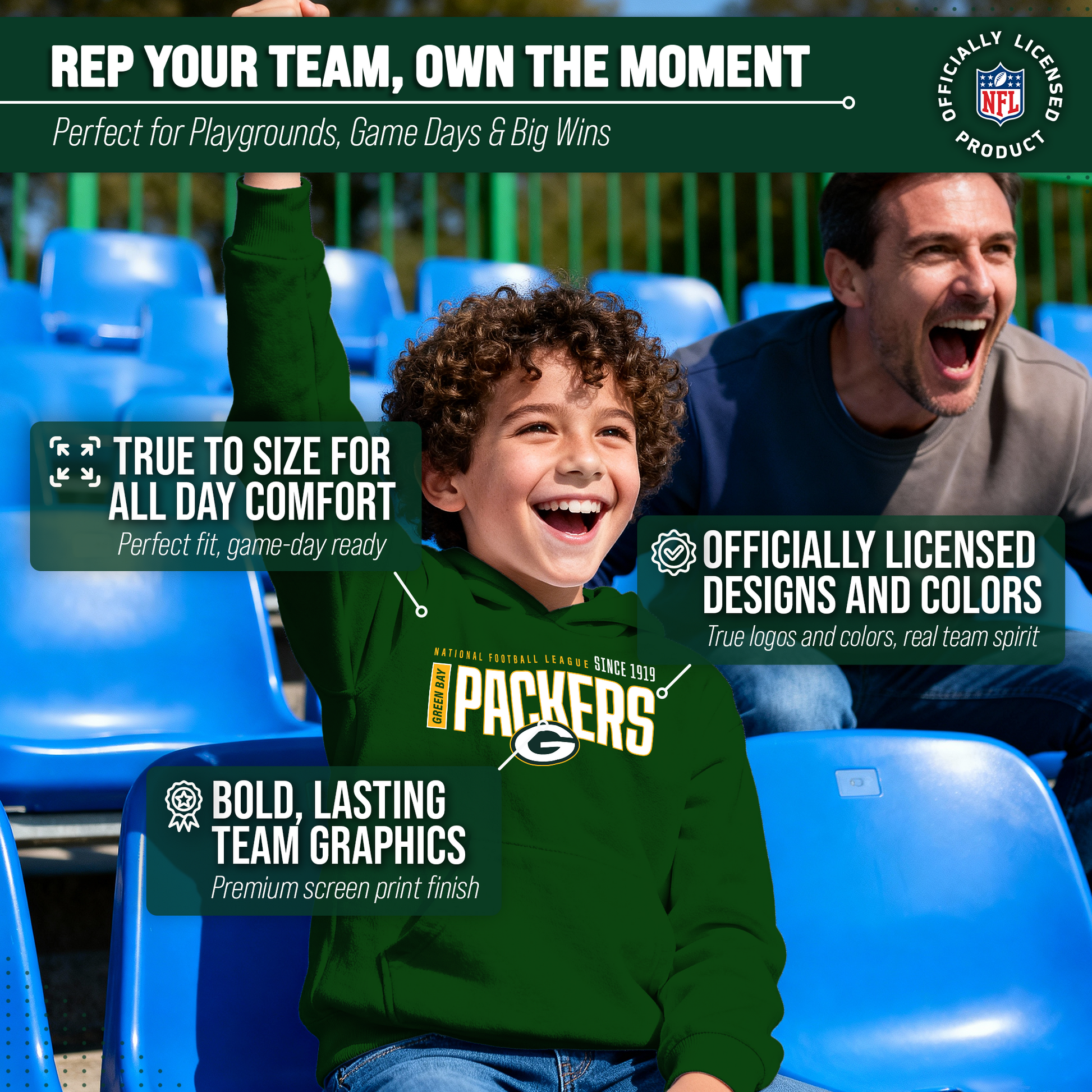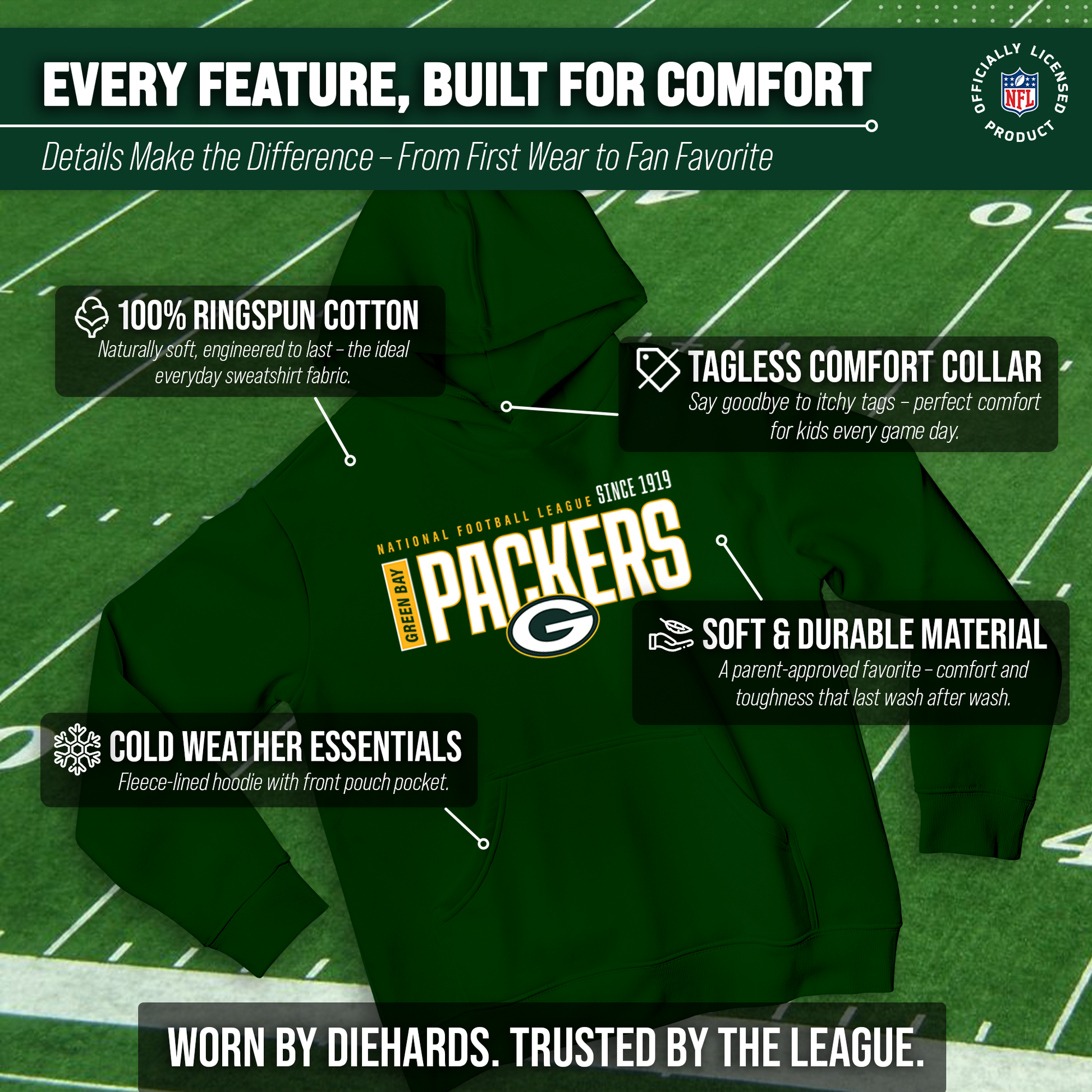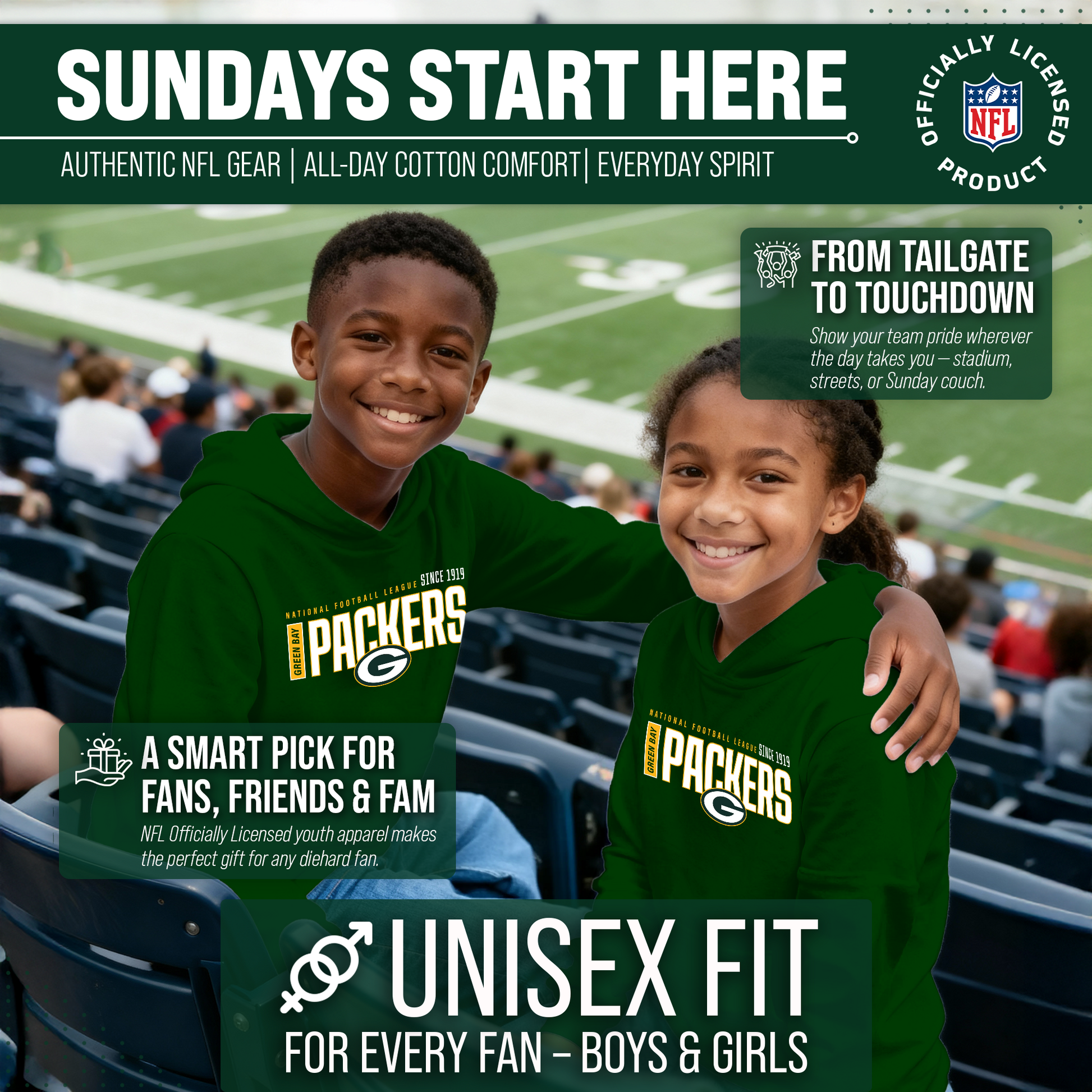 Hey there, young sports fans! Get ready to show off your team spirit with the Team Fan Apparel Green Bay Packers Youth Modern Endzone Football Fleece Hooded Sweatshirt! Made from a soft and cozy cotton polyester fleece, this sweatshirt is perfect for staying warm on game day or any day. The unisex design makes it suitable for both boys and girls, and its tag-less feature ensures ultimate comfort all day long. Featuring an original modern endzone design that proudly displays your team's colors and logos, this youth hoodie will be turning heads everywhere it's worn. The front pouch pocket and fleece hood will keep you warm on those cold game days as you cheer on your Packers! Just pull it on and go! So whether you're at the stadium or hanging out with friends, make sure you're representing your team in style with our NFL youth apparel. Printed and designed in the USA, have confidence your sweatshirt will last! Order now and get your future pro geared up to be the next super fan!
