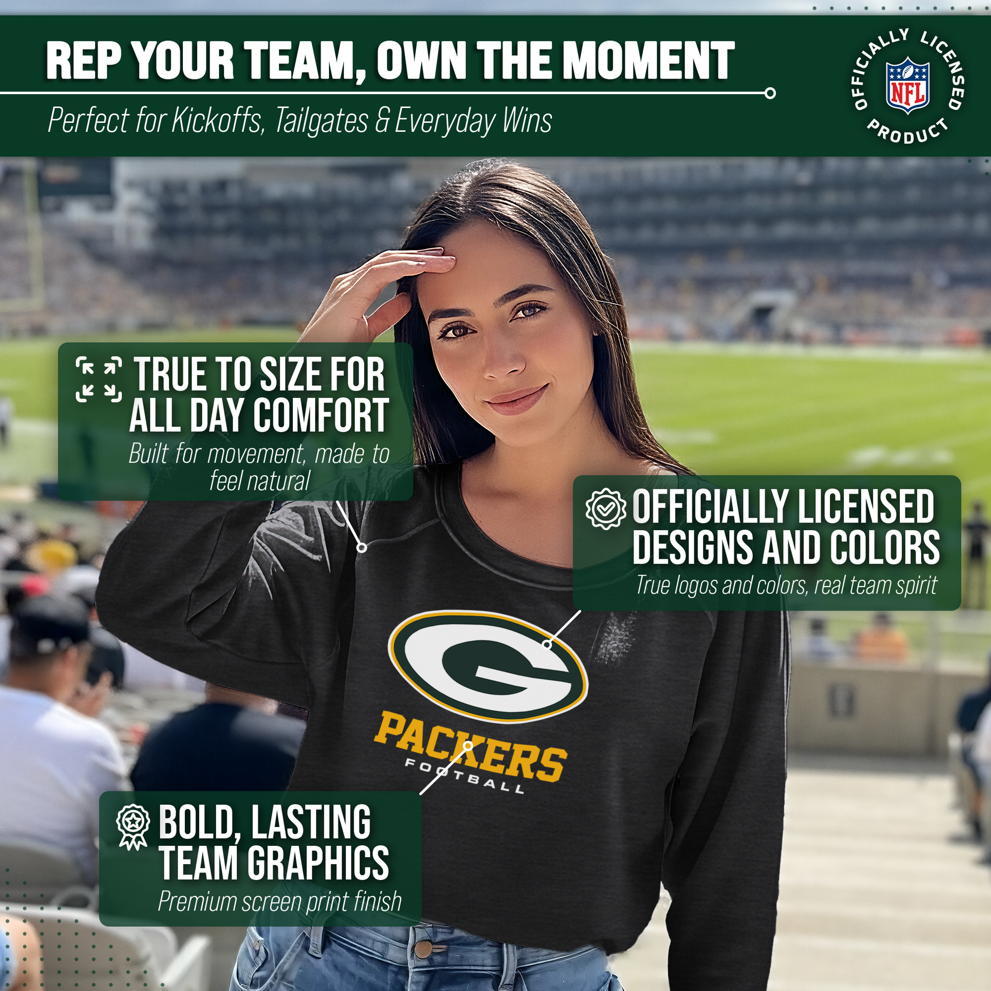 Green Bay Packers Women's NFL Ultimate Fan Logo Slouchy Crewneck -Tagless Fleece Lightweight Pullover - Charcoal