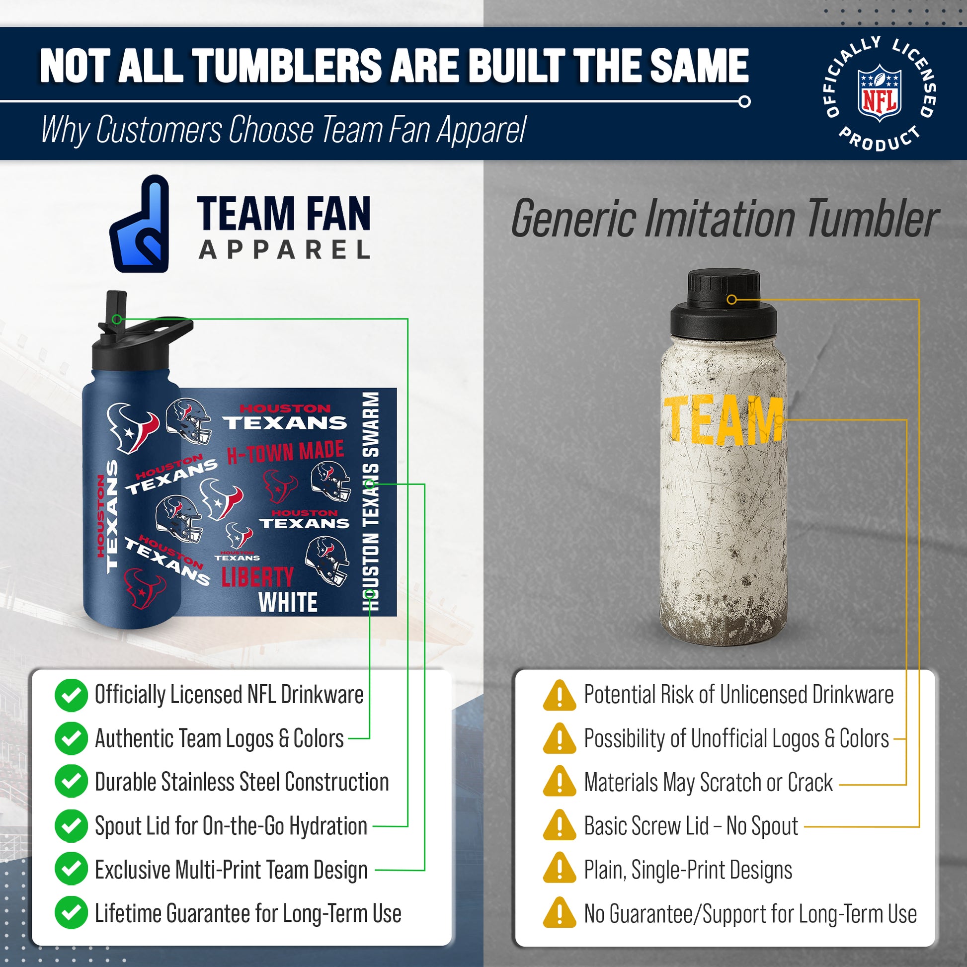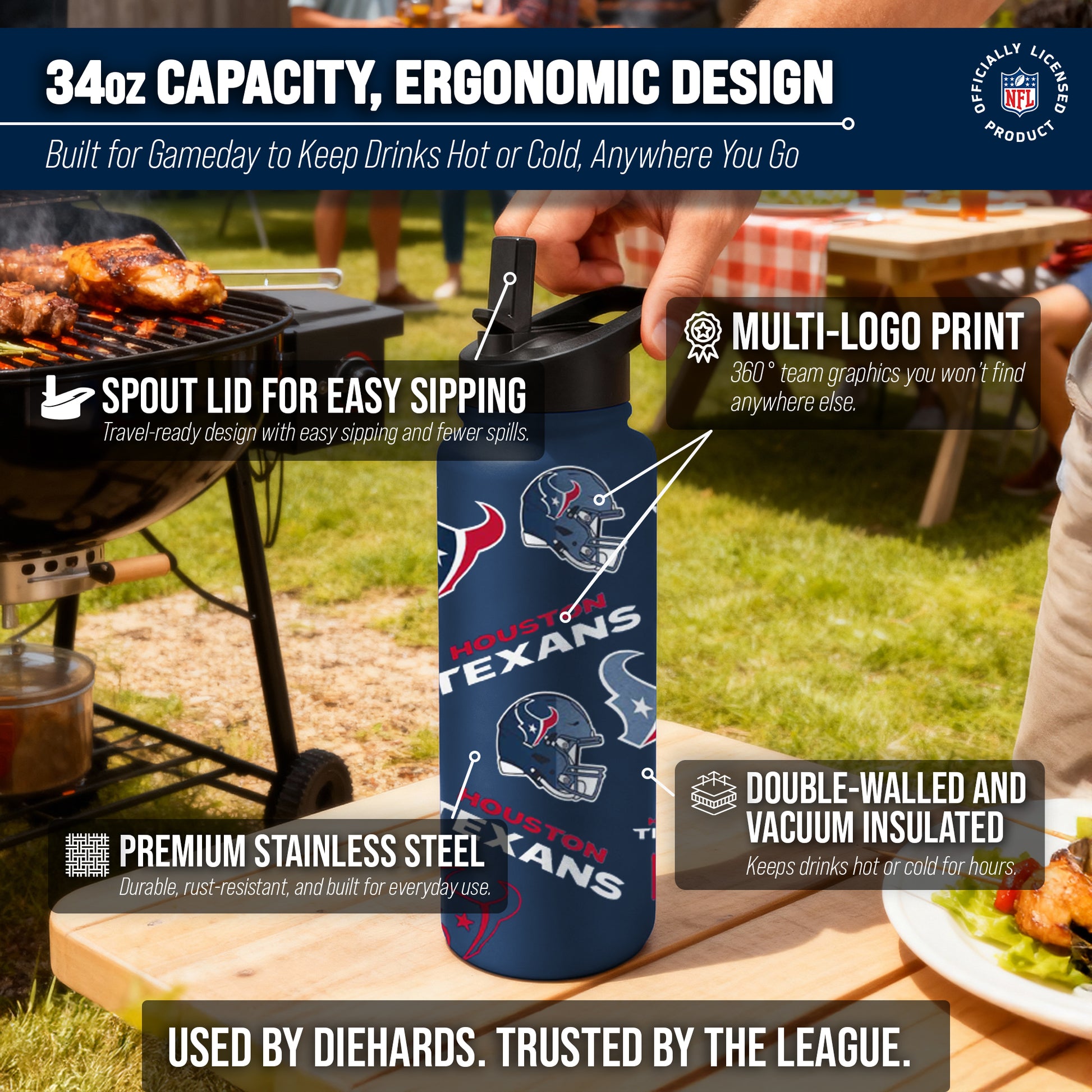 Keep Your Houston Texans Team Spirit and Drinks Handy On-the-Go with the NFL Native Quencher Water Bottle! Whether you're heading to the gym or tailgating at the game, this 34oz Texans water bottle is the perfect companion for any fan. Made from durable stainless steel, it's designed to keep your drinks hot or cold for hours. The no-leak dual option lid allows you to sip through a straw or drink straight from the spout. But it's not just for water! This versatile bottle can also hold your favorite coffee, tea, & more. With its insulated design, your beverages will stay at their desired temperature until you're ready for them. Featuring your team's logo & colors, this water bottle proudly displays your loyalty while keeping you hydrated. And when it's time for a refill, simply take off the lid and fill up again. Cheers to staying hydrated in style with the Houston Texans Water Bottle! Hand wash only! Great for yourself or any fan in your life, especially for on-the-go and travel!