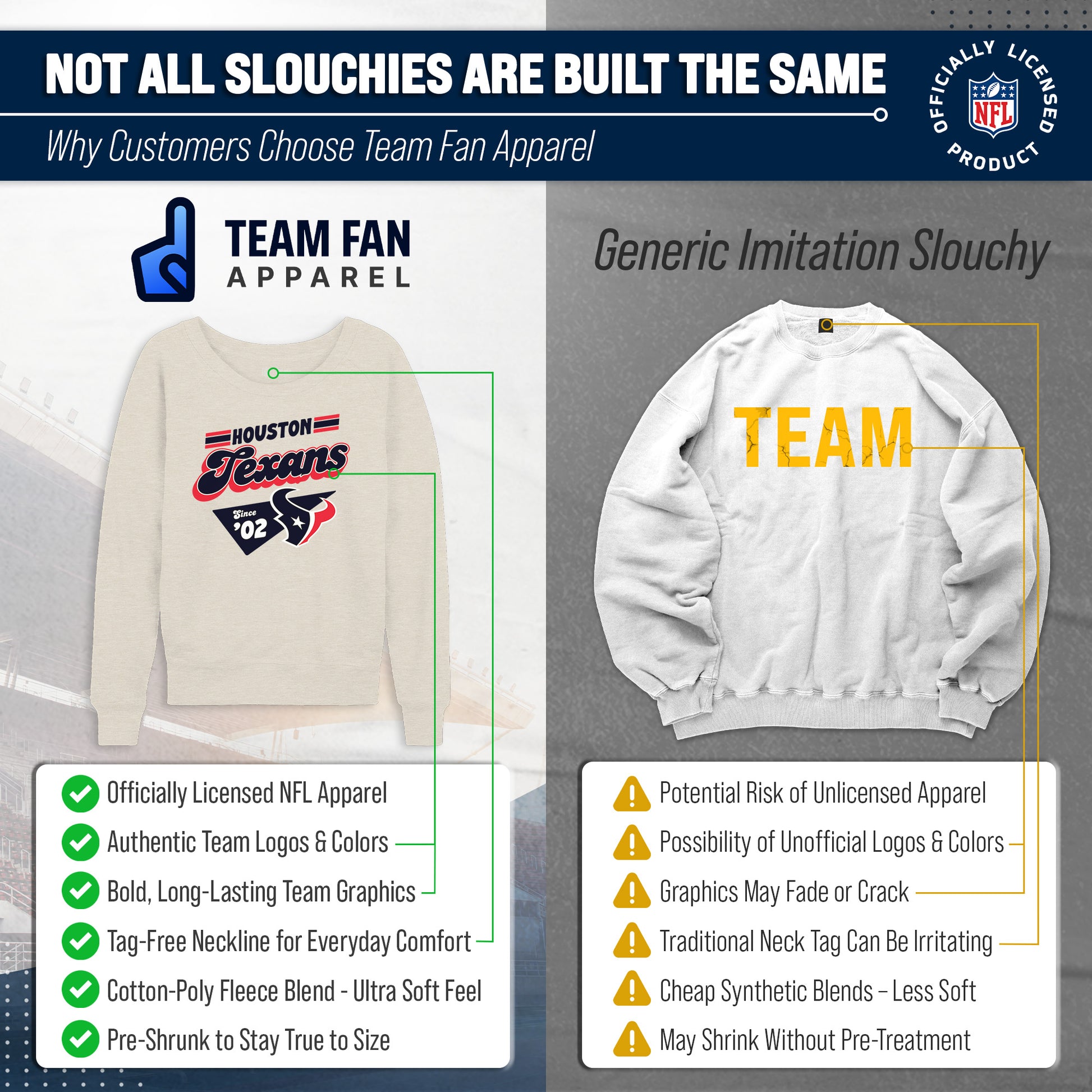 Hey there, fellow lady football fans! Show off your team pride in style with our Team Fan Apparel Houston Texans NFL Women's Vinntage Charm Slouchy Crewneck Fleece Pullover. Made with extra soft cotton polyester fleece material, this long sleeve pullover sweatshirt will keep you warm and cozy on game day or any chilly day. With a tagless design, you won't have to worry about any annoying tags distracting you from cheering on your team. Featuring a 90's design and relaxed fit, this pullover adds a touch of fashion to your game day wardrobe. Available in a range of women's sizes, it's the perfect addition to any fan's closet. Whether you're headed to the stadium or watching from home, stay cool and stylish with this must-have piece of Texans apparel. Don't let snow or cold weather dampen your team spirit - grab one for yourself or as a gift for the ultimate football-loving lady in your life! Go Texans!