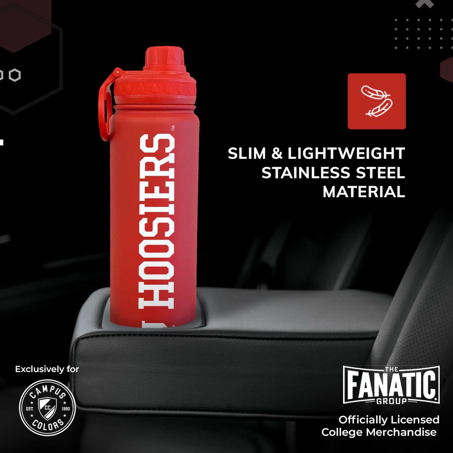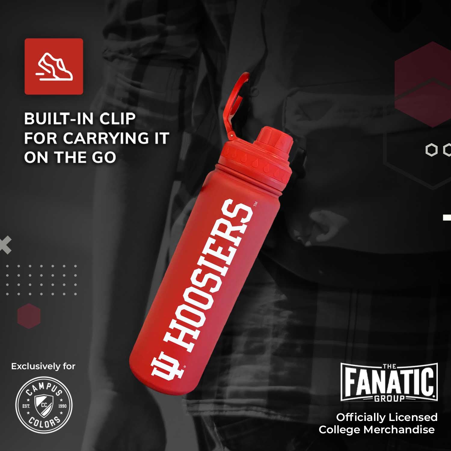 This officially licensed 24oz Indiana water bottle is the best accessory for any Indiana Hoosiers fan. You can use this water bottle 24 oz for water, sports drink, or even to keep your coffee hot. Our vacuum sealed sport bottle ensures that your drinks stay hot or cold for hours. You can bring this bottle along to sport games, hikes, or tailgates on game day. This sport water bottle 24 oz is a slim bottle that fits in most car cup holders for convenience. This stainless sports water bottle features an easy flow spout for the best drinking experience. The twist on cap features an easy drinking spout to make sipping a breeze. The bottle's lid twists on and off to reveal an easy drinking mouthpiece. The convenience of our double walled water bottles make them perfect for sports and everyday life! Show off your school spirit with this Indiana Hoosiers water bottle. This durable stainless sports water bottle make the perfect Indiana Hoosiers accessories for any activity. Our water bottle with clip for backpack is perfect for student campus life and busy alumni activities. Our vacuum sealed water bottles feature a built in handle. The easy grab bottle allows you to sip your water without spilling it on yourself while playing sports or walking to class. The college water bottle is coated in silicone for added grip and softer finish, and the exterior is sweat free so the Indiana water bottle won't drip on you. This insulated water bottle is the perfect birthday or Christmas gift for fans who love to collect Indiana stuff. Pair with other Indiana novelties or apparel for the ultimate Hoosiers gift for women and men. Indiana gear is great as birthday gifts for college students, alumni, and sport fans. With our Indiana Hoosiers water bottle, fans can show team pride and stay hydrated all day and every day!