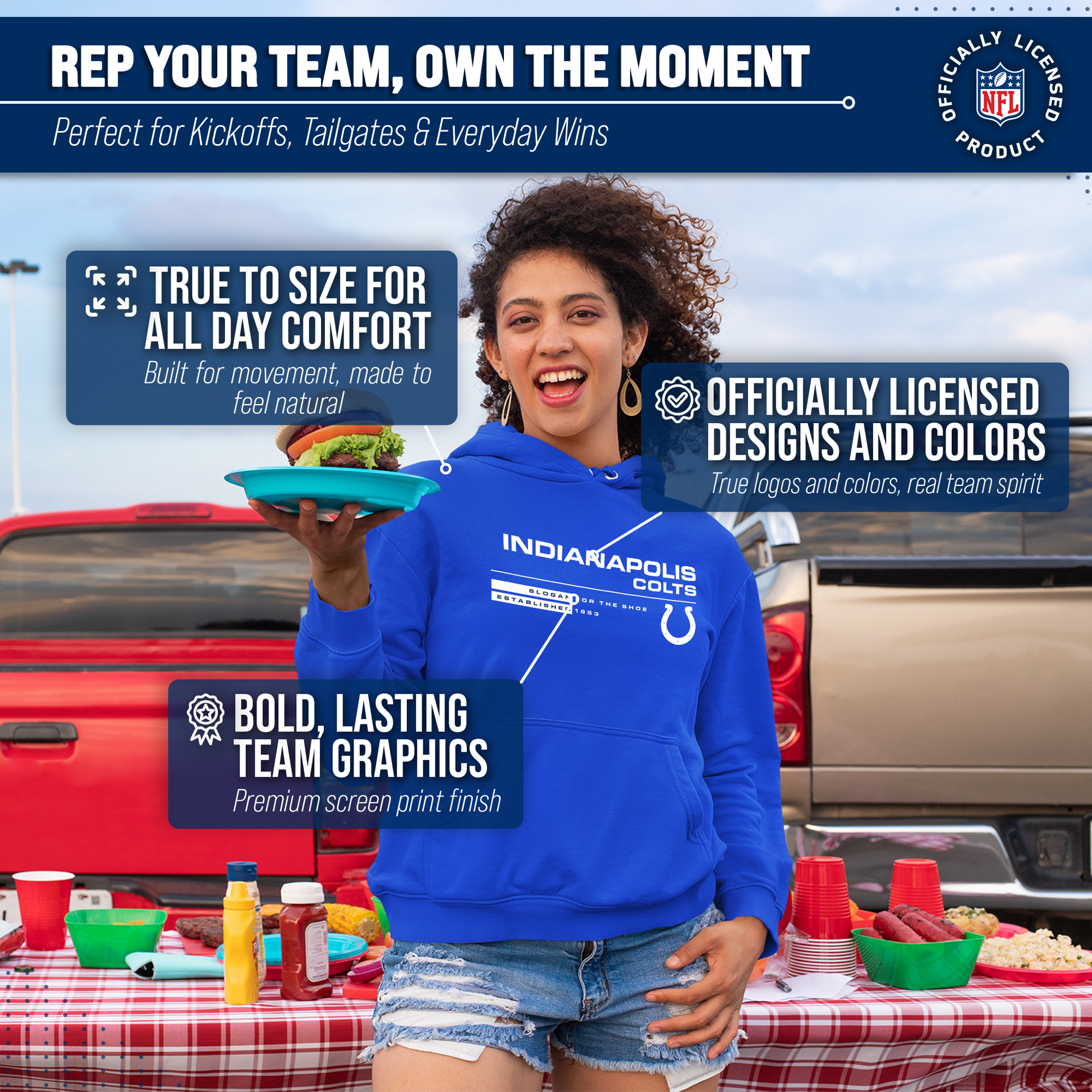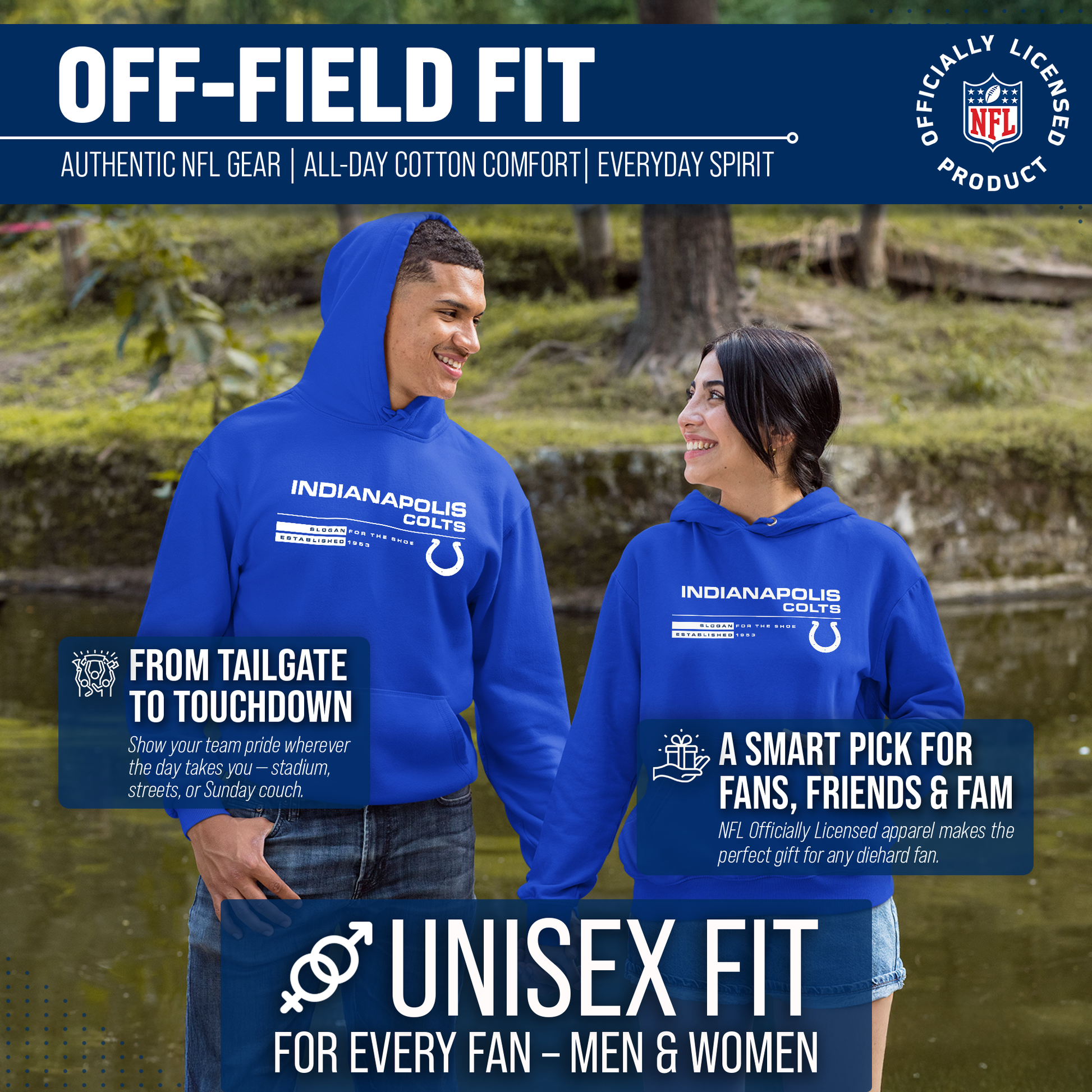 Score with Team Fan Apparel, the ultimate destination for officially licensed NFL apparel for men and women. We use only the highest quality screen printing techniques to bring you the most comfortable, durable, and stylish clothing possible. Go ahead and show your team pride at the big game or any time! This premium hooded sweatshirt fits both male and female adults and comes in small, medium, large, XL, and XXL. So needless to say, it fits Indianapolis Colts fans of all types! Maybe you aren't a Colts fan but you know someone who is? Don't worry! This high-quality sweatshirt is soft, lightweight but cozy, breathable and a GREAT gift for any birthday, anniversary, or Christmas gift; Father's Day, Mother's day, you name it! The front pouch pocket, drawstring hood, and soft fleece will keep you warm and keep your fandom hot! So, if you want to stand out as the #1 fan at the next big game, tailgate or watch party, you're going to want to be wearing one of these stat sheet hooded sweatshirts