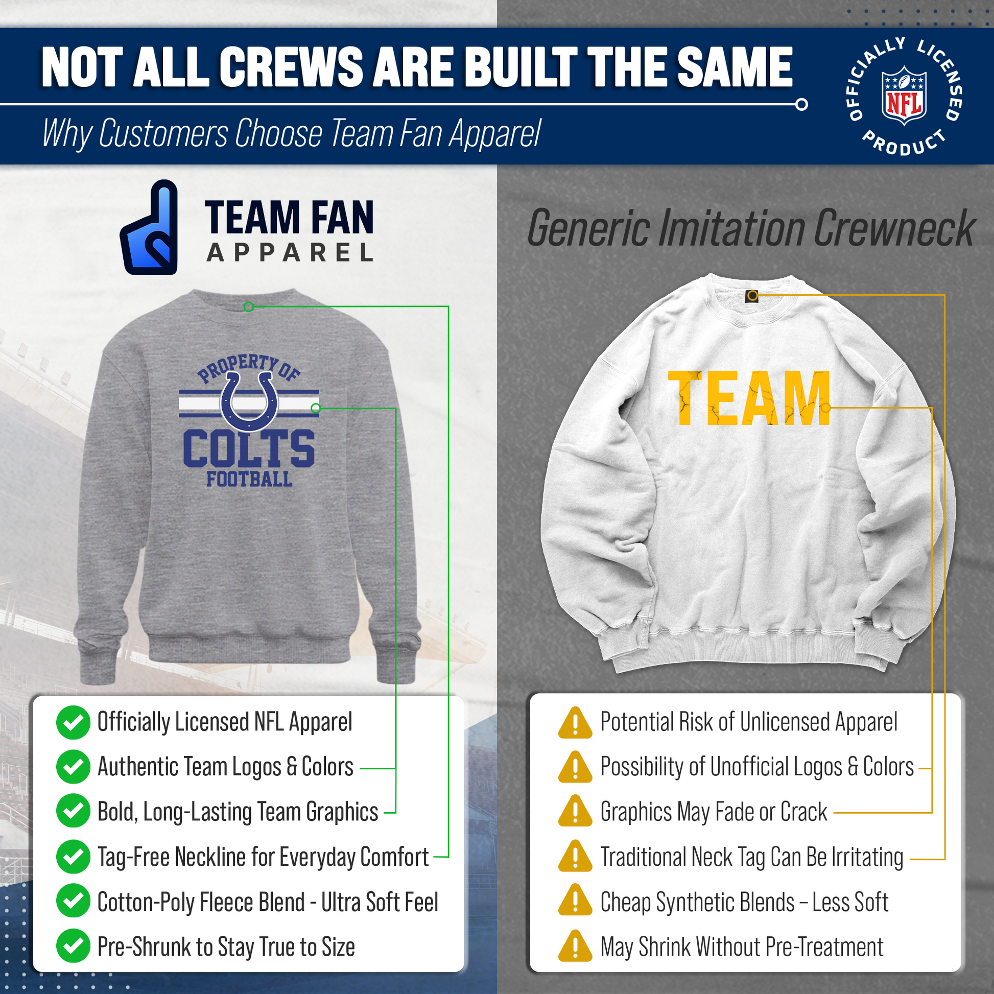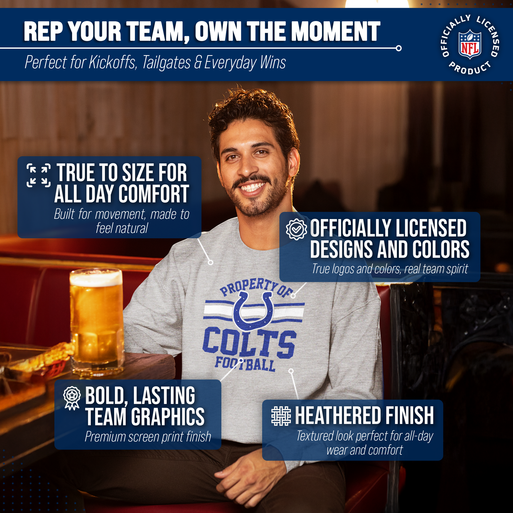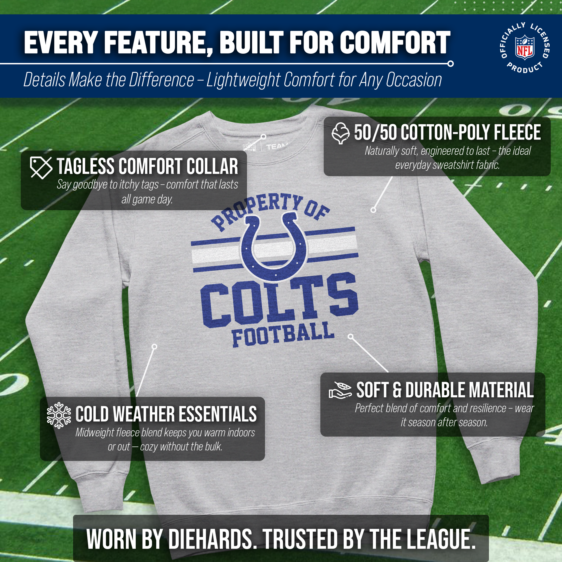 This Property of Indianapolis Colts pullover crewneck sweatshirt is a cold-weather friendly jacket made from 50% ringspun cotton and 50% polyester. Our mens and womens football sweater is super comfortable, runs true to size, and is great for showing your team pride all year long. This comfy crewneck features the official Property of graphics will stay crisp and wear after wear and year after year. All colors and fonts are officially licensed and are of the highest of quality. These crew neck sweatshirts are made with air jet yarn for a softer feel and reduced pilling. This tagless Indianapolis crewneck sweatshirt is perfect for tailgates, games, and showing off your team spirit. Our pullover crewnecks are ideal Colts gifts for men and women football fans. The unisex fit of our Indianapolis crewneck is ideal for both men and women. This crewneck is essential apparel for protecting yourself from the elements at a football game. The fleece material, ribbed cuffs, and waistband keep all the warmth in, which means there's no need for an extra jacket in the fall months– our crew neck sweaters have you covered. This Property of Indianapolis Colts sweatshirt crewneck pullover is pre-shrunk and is ideal for that tailgate or game day when the temperature drops. Our crewneck pro football sweatshirts for women and men help you gear up and get ready to cheer the Colts to victory.