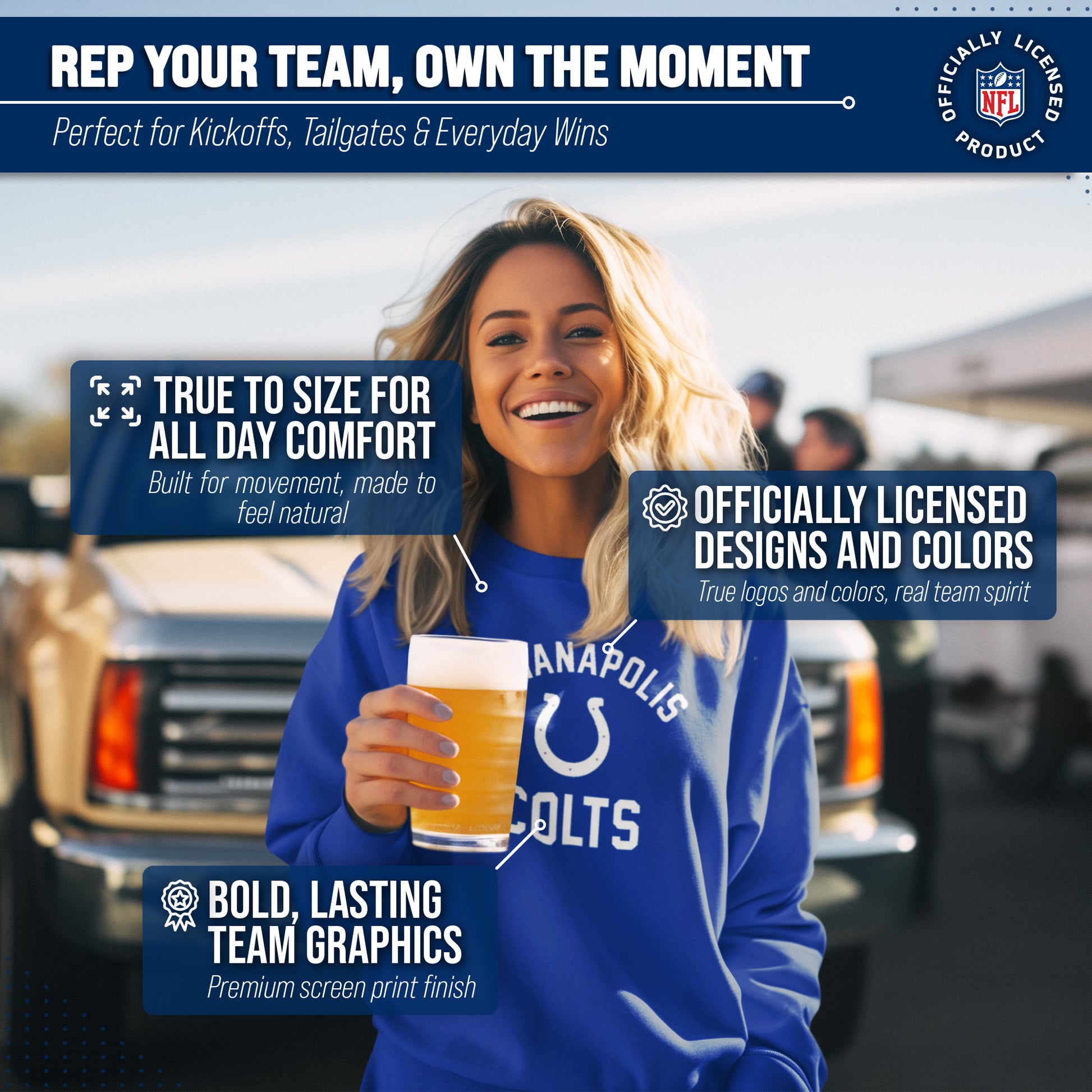 This adult Gameday Indianapolis Colts football crewneck is the ideal sweatshirt to wear on gameday. Our crewneck sweatshirt is comfortable, runs true to size, and is great for showing team pride all year long! This is the perfect Indianapolis sweatshirt for both men and women. Our Indianapolis Colts team colored crewneck sweatshirts are the perfect fan apparel for tailgates and sports games. The lightweight crewneck pullover is made of air jet yarn for a softer feel and reduced pilling, which means your crewneck sweatshirt will look new for years to come. You don't have to worry about the Indianapolis graphics fading on your crewneck, either. The pullovers are made with thermal printed graphics that are high definition, true team color, and resist fading! This Indianapolis sweatshirt is ideal for warm or cold weather, which means you can wear it not only all football season, but all year long! Our pro football crewneck sweatshirt features 1x1 rib with spandex for enhanced stretch and recovery. This Indianapolis crewneck sweatshirt has double-needle stitching at shoulders, armholes, neck, waistband, and cuffs. Our comfortable crewneck pullover is made from a cotton poly fleece blend. This tagless sweatshirt ensures the most comfortable fit for men and women. The classic fit of this sweatshirt makes this Indianapolis Colts crewneck that perfect pullover for Indianapolis men and women fans. Our pro Indianapolis Colts pullover sweatshirts for men and women make the best Indianapolis gift. Indianapolis Colts apparel is the perfect birthday gift for any football fan. This Indianapolis Colts football crewneck sweatshirt is perfect for tailgating, stadium fun, or watching the game at home.