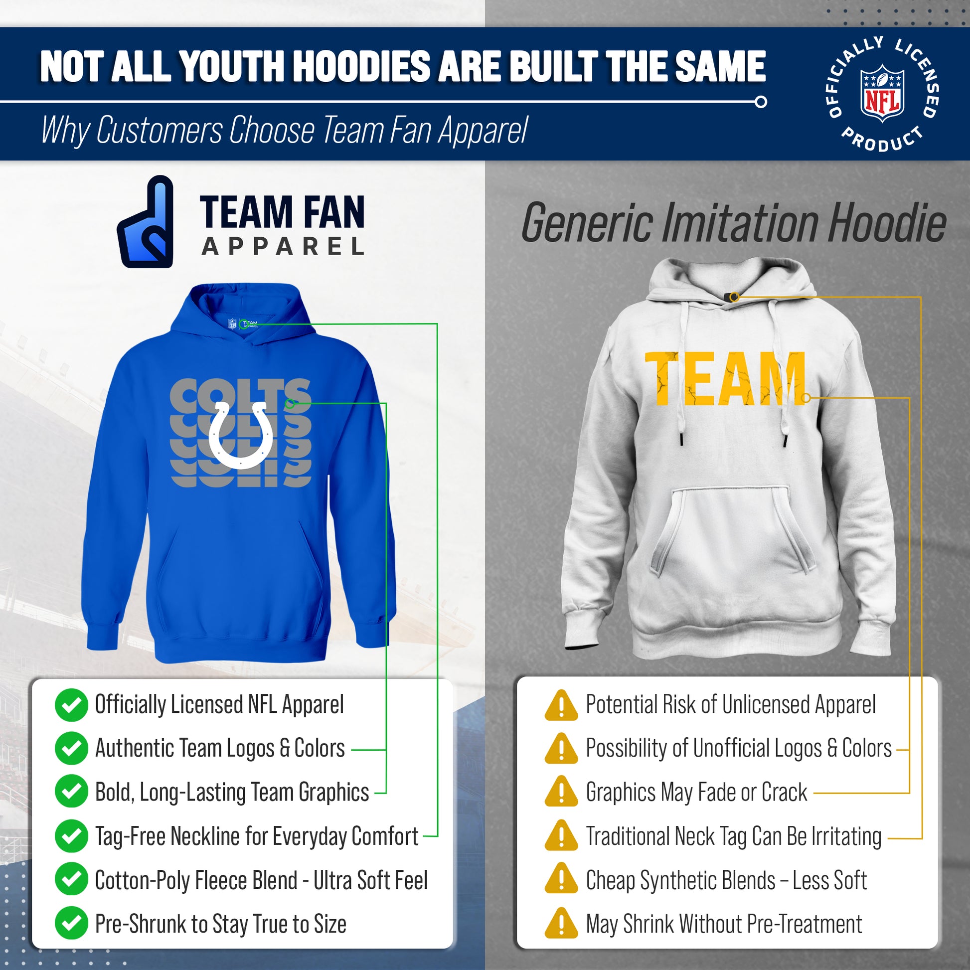 Hey there, young sports fans! Get ready to show off your team spirit with the Team Fan Apparel Indianapolis Colts Youth Repeating Logo Football Fleece Hooded Sweatshirt! Made from a soft and cozy cotton polyester fleece, this sweatshirt is perfect for staying warm on game day or any day. The unisex design makes it suitable for both boys and girls, and its tag-less feature ensures ultimate comfort all day long. Featuring an original repeating logo design that proudly displays your team's colors and logos, this youth hoodie will be turning heads everywhere it's worn. The front pouch pocket will keep you warm on those cold game days as you cheer on your Colts! Just pull it on and go! So whether you're at the stadium or hanging out with friends, make sure you're representing your team in style with our NFL youth apparel. Printed and designed in the USA, have confidence your sweatshirt will last! Order now and get your future pro geared up to be the next super fan!