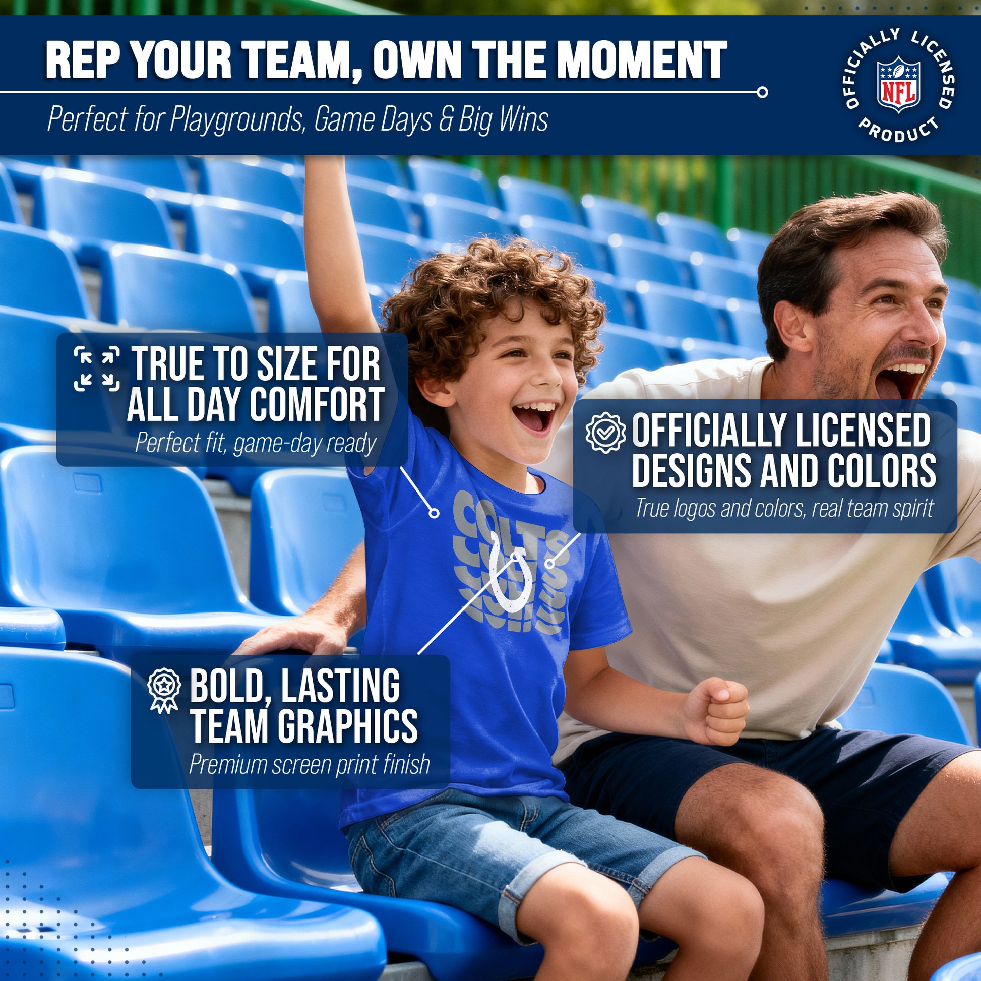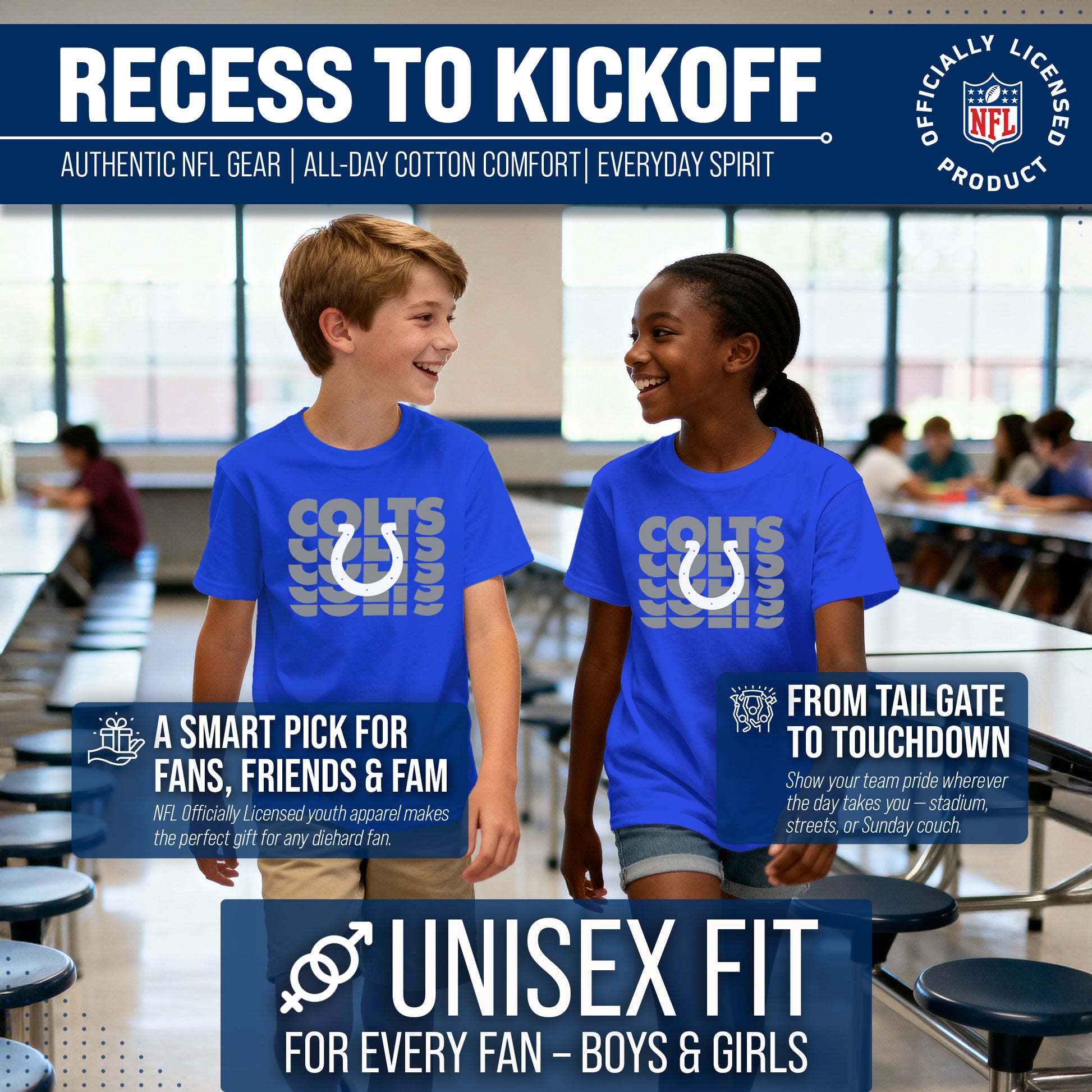 Indianapolis Colts NFL Youth Repeating Logo Football T-Shirt Unisex Tag Free Comfortable - Royal