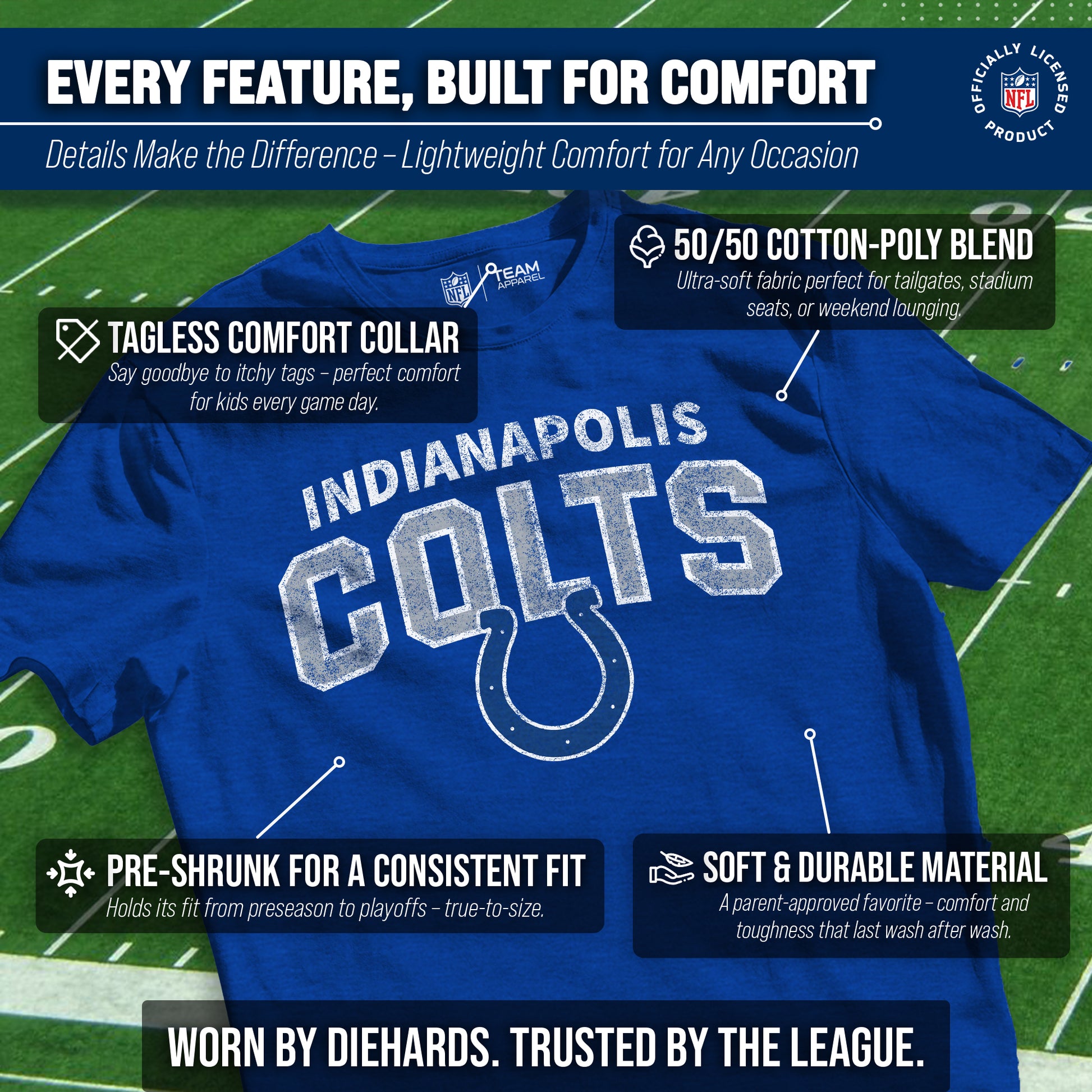 Indianapolis Colts NFL Youth Starting Fresh Tee- Pro Football Tag-Less T-Shirt For Boys & Girls - Royal