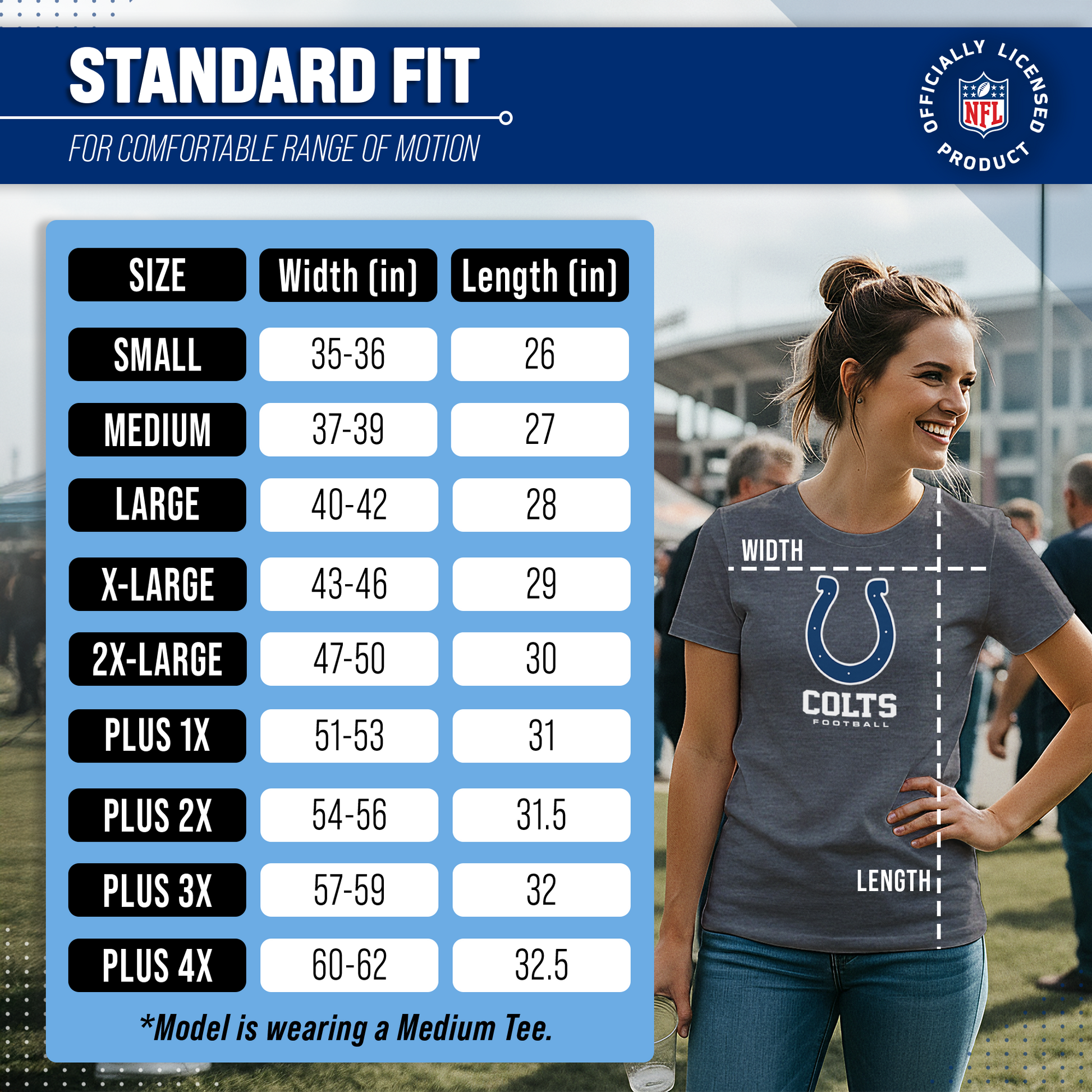 Score with Team Fan Apparel, the ultimate destination for officially licensed NFL apparel for men and women. We use only the highest-quality screen printing techniques to bring you the most comfortable, durable, and stylish clothing possible. Go ahead and show your team pride at the big game or any time! This premium womens t-shirt comes in small, medium, large, XL, and XXL. So needless to say, it fits Indianapolis Colts fans of all types! Maybe you aren't a Colts fan but you know someone who is? Don't worry! This high-quality t-shirt is soft, lightweight, breathable, and a GREAT gift for any birthday, anniversary, Mother's day, Valentine's day, or Christmas gift! So, if you want to stand out as the #1 female fan at the next big game or watch party, you're going to want to be wearing one of these Indianapolis Colts Women's Big Logo t-shirts.