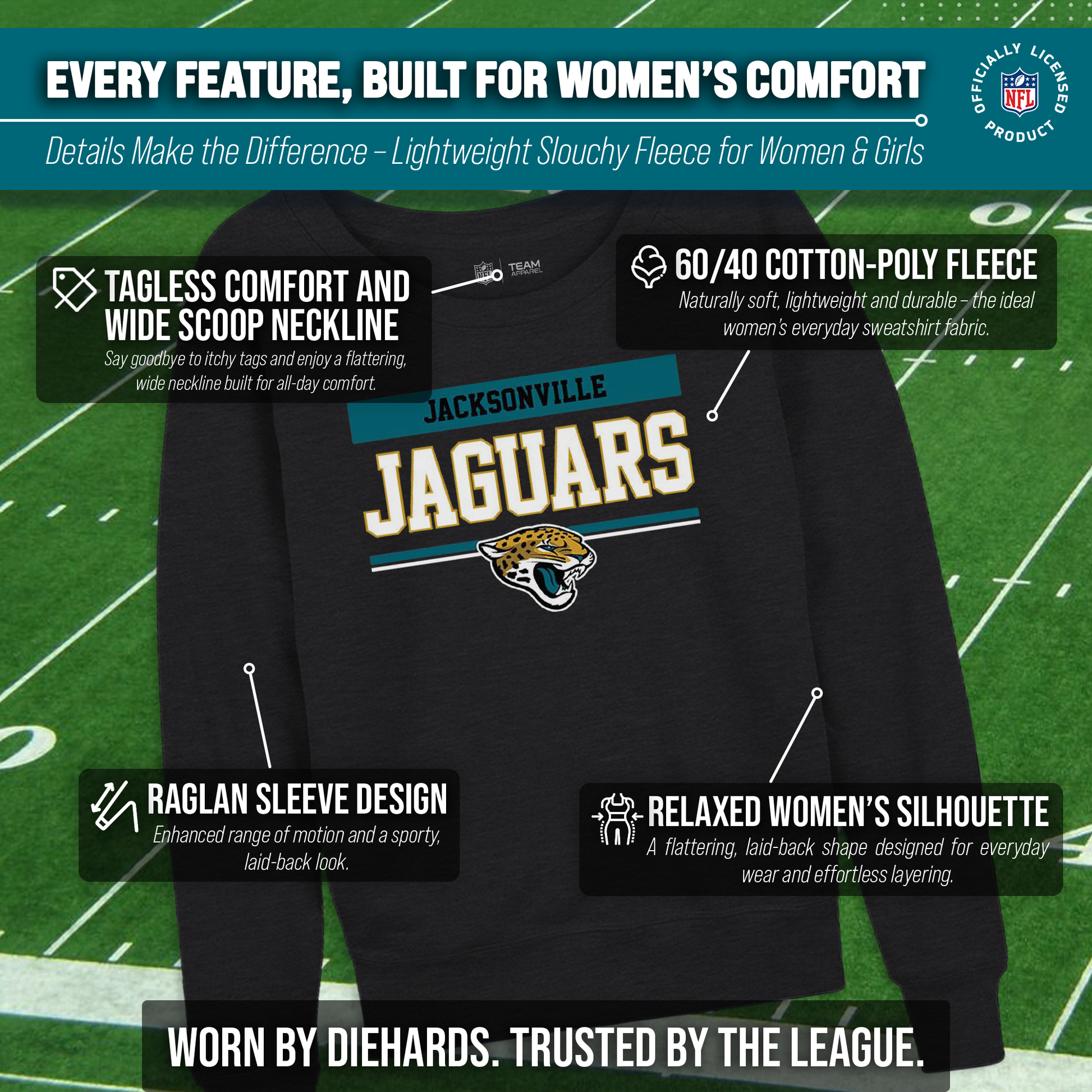 Our officially licensed womens Jacksonville Jaguars long sleeve charcoal crew neck pullover is super comfortable, has an oversized fit, and is great for showing off your Jacksonville pride. The high-quality thermal printed logo and wordmark will look fresh after years of wear, making it a great alternative to wearing a Jacksonville Jaguars womens jersey. Our womens long sleeve slouchy crewneck has a relaxed fit for a casual, comfortable look. The long sleeve Jacksonville crew will look great with shorts at tailgates in warmer months, or with jeans or leggings when it gets cooler. Layer it with a hoodie or even a Jacksonville football jersey when the weather gets cold. Available in plus sizes up to 3XL, this is a Jacksonville Jaguars pullover that women who are plus size or straight size will feel comfortable in. If you're looking to give the gift of ladies Jacksonville apparel, our long sleeved Jacksonville Jaguars Slouchy Crew is the perfect gift. Officially licensed to ensure no counterfeit designs or colors, these Jacksonville crews for women are perfect for super fans. Made from a cotton poly blend to keep you comfortable, the womens raglan long sleeve Gameday Slouchy Crew will definitely become one of your favorite pieces of Jacksonville Jaguars apparel.
