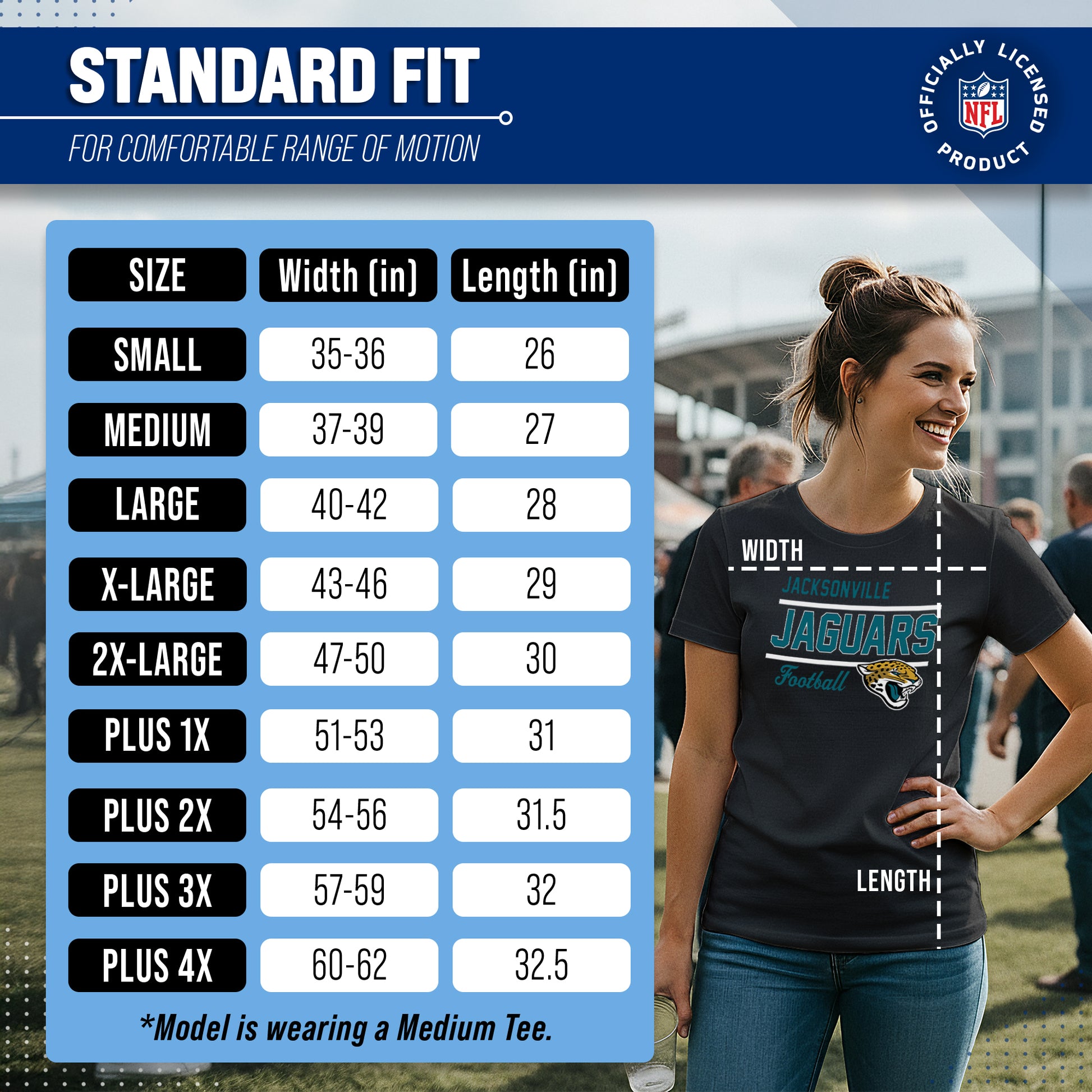 Our officially licensed Jaguars shirt is super comfortable, runs true to size, and is great for showing off your Jacksonville Jaguars pride. The high-quality thermal printed logo will look fresh after years of wear, making it a great alternative to your womens Jacksonville Jaguars jersey. Our Gameday t-shirt has a relaxed yet contoured fit for a casual yet feminine look. The short sleeve shirt is perfect with shorts for tailgates in warmer months, or with jeans or leggings and a sweater during colder months. Available in plus sizes, our Jaguars shirts for women plus size or straight size will make anyone feel comfortable enough to show off their love for the Jacksonville Jaguars. If you're looking to give team t shirts for women as a gifts, our Gameday tshirt is the Jacksonville shirt women will love. Officially licensed to ensure no counterfeit designs or colors, our Jacksonville Jaguars womens shirts are great for superfans. 100% ringspun and made from a blend of cotton and polyester], designed to keep you cool and comfortable all year long. The womens gameday football t shirt will definitely become one of your favorite tops.