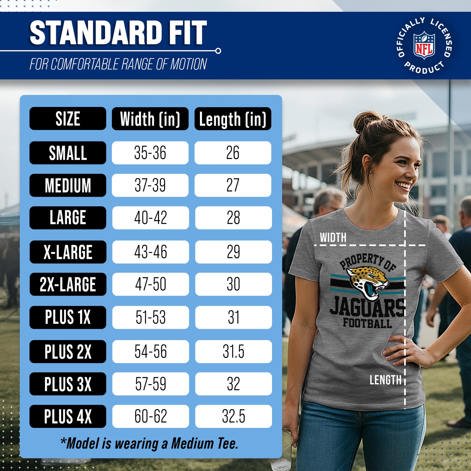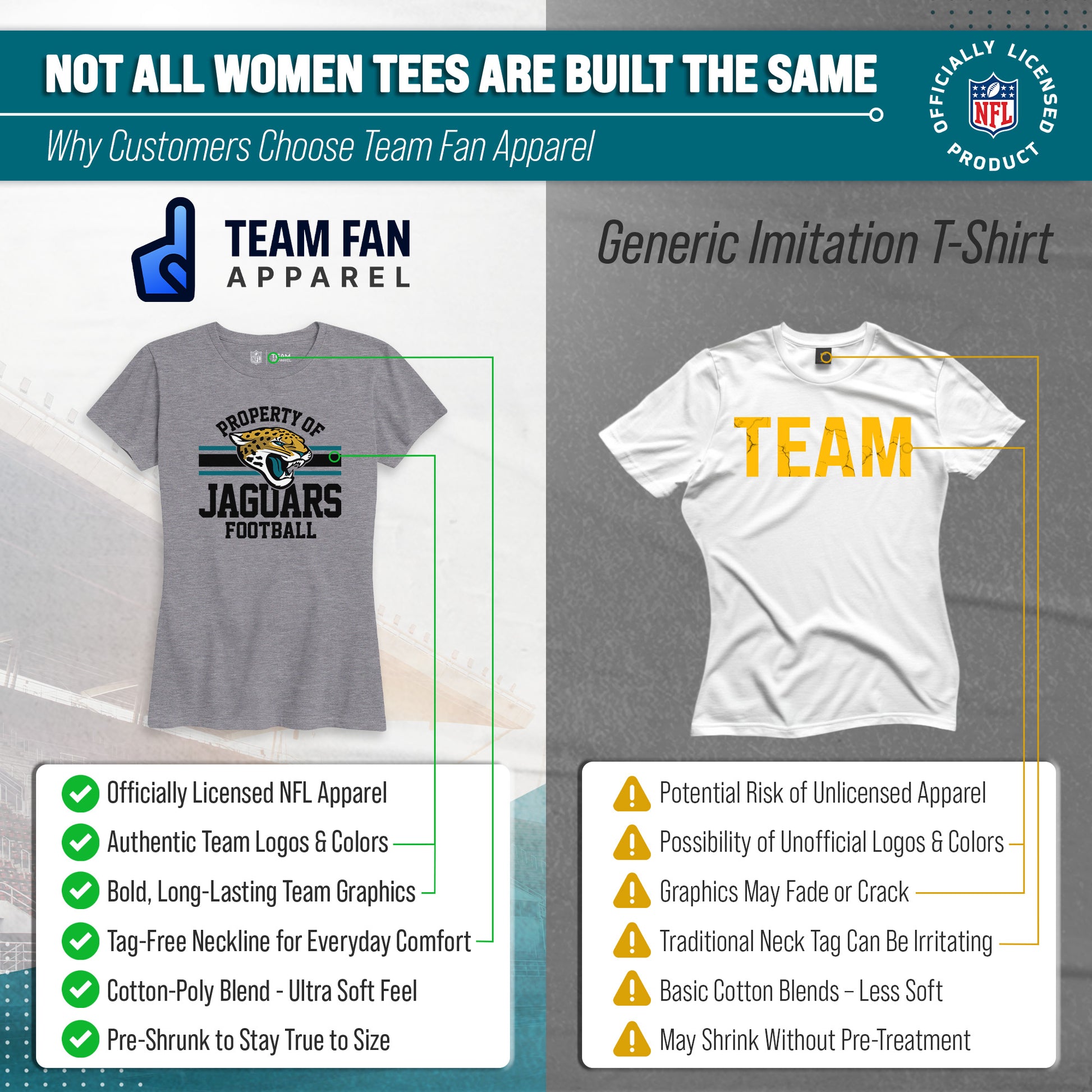 Our officially licensed Property of Jacksonville Jaguars shirt for women is super comfortable, runs true to size, and is great for showing off your Jaguars pride. Stand out in the crowd with our womens Property of Jacksonville Jaguars tshirts! The high-quality thermal printed logo will look fresh after years of wear, making it a great alternative to your womens Jacksonville Jaguars jersey. Our womens football t-shirt has a relaxed yet contoured fit for a casual yet feminine look. The short sleeve shirt is perfect with shorts for tailgates in warmer months, or with jeans or leggings and a sweater during colder months. Available in plus sizes, our Jacksonville football shirts for women plus size or straight size will make anyone feel comfortable enough to show off their love for the Jacksonville Jaguars team. If you're looking to give team t shirts for women as a gifts, our Property of Jaguars tshirts is the pro football shirt women will love. Officially licensed to ensure no counterfeit designs or colors, our Jacksonville Jaguars womens shirts are great for superfans. Made from a blend of 50% cotton and 50% polyester, this piece of womens Jacksonville apparel is designed to keep you cool and comfortable all year long. The womens football t shirt will definitely become one of your favorite Jacksonville tops.