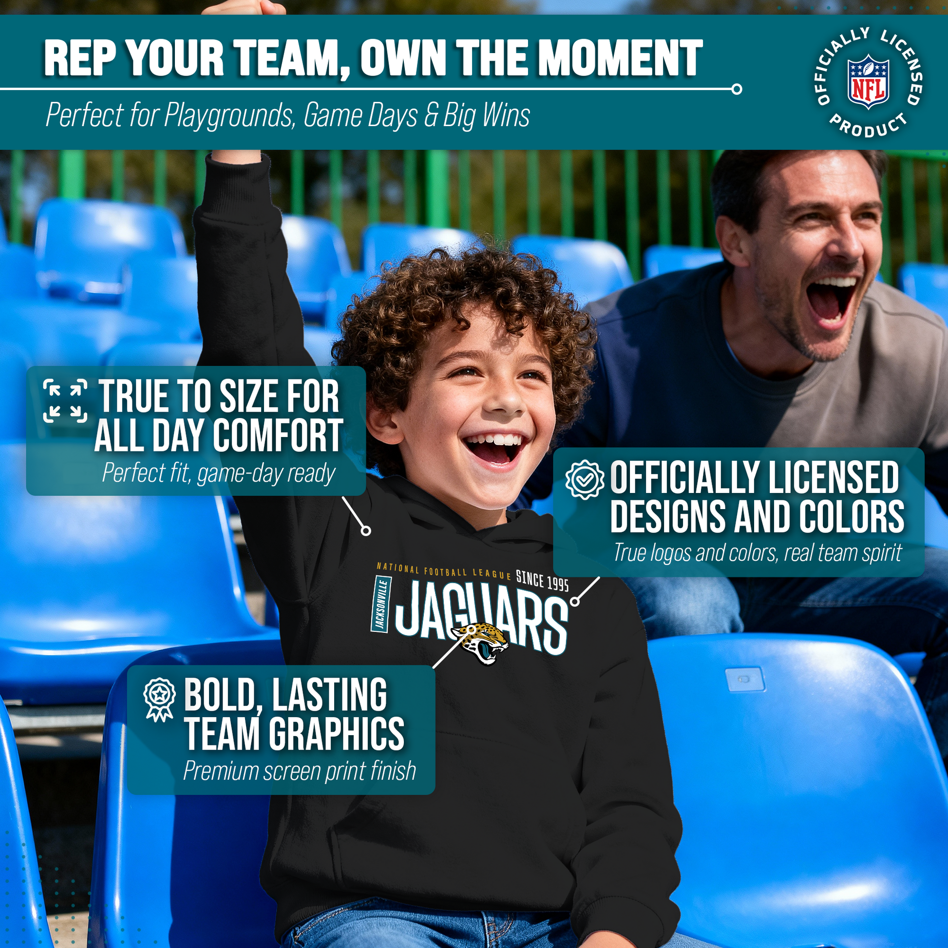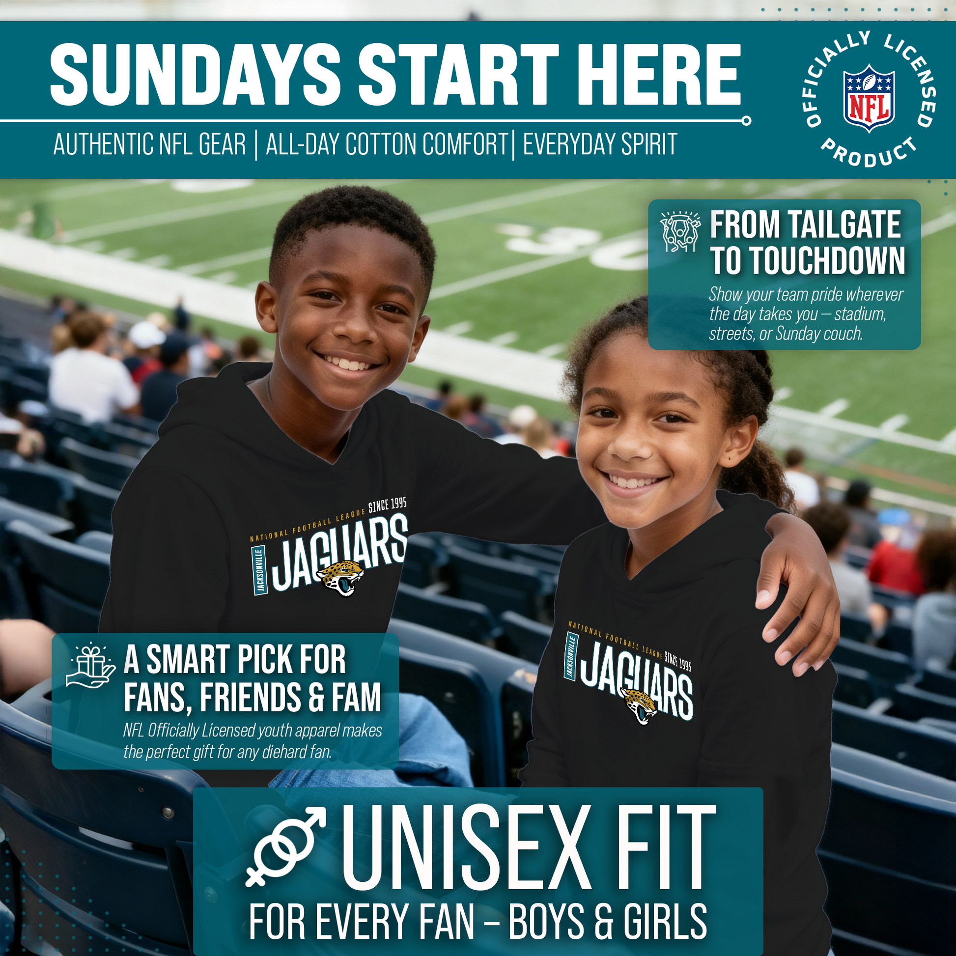 Hey there, young sports fans! Get ready to show off your team spirit with the Team Fan Apparel Jacksonville Jaguars Youth Modern Endzone Football Fleece Hooded Sweatshirt! Made from a soft and cozy cotton polyester fleece, this sweatshirt is perfect for staying warm on game day or any day. The unisex design makes it suitable for both boys and girls, and its tag-less feature ensures ultimate comfort all day long. Featuring an original modern endzone design that proudly displays your team's colors and logos, this youth hoodie will be turning heads everywhere it's worn. The front pouch pocket and fleece hood will keep you warm on those cold game days as you cheer on your Jaguars! Just pull it on and go! So whether you're at the stadium or hanging out with friends, make sure you're representing your team in style with our NFL youth apparel. Printed and designed in the USA, have confidence your sweatshirt will last! Order now and get your future pro geared up to be the next super fan!