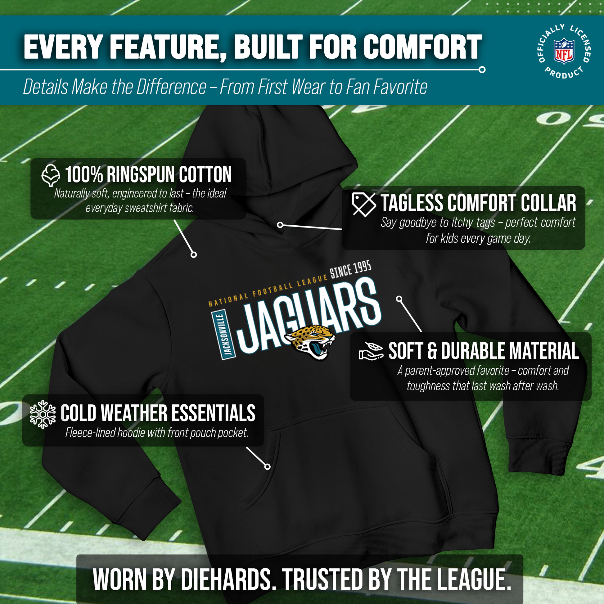 Hey there, young sports fans! Get ready to show off your team spirit with the Team Fan Apparel Jacksonville Jaguars Youth Modern Endzone Football Fleece Hooded Sweatshirt! Made from a soft and cozy cotton polyester fleece, this sweatshirt is perfect for staying warm on game day or any day. The unisex design makes it suitable for both boys and girls, and its tag-less feature ensures ultimate comfort all day long. Featuring an original modern endzone design that proudly displays your team's colors and logos, this youth hoodie will be turning heads everywhere it's worn. The front pouch pocket and fleece hood will keep you warm on those cold game days as you cheer on your Jaguars! Just pull it on and go! So whether you're at the stadium or hanging out with friends, make sure you're representing your team in style with our NFL youth apparel. Printed and designed in the USA, have confidence your sweatshirt will last! Order now and get your future pro geared up to be the next super fan!