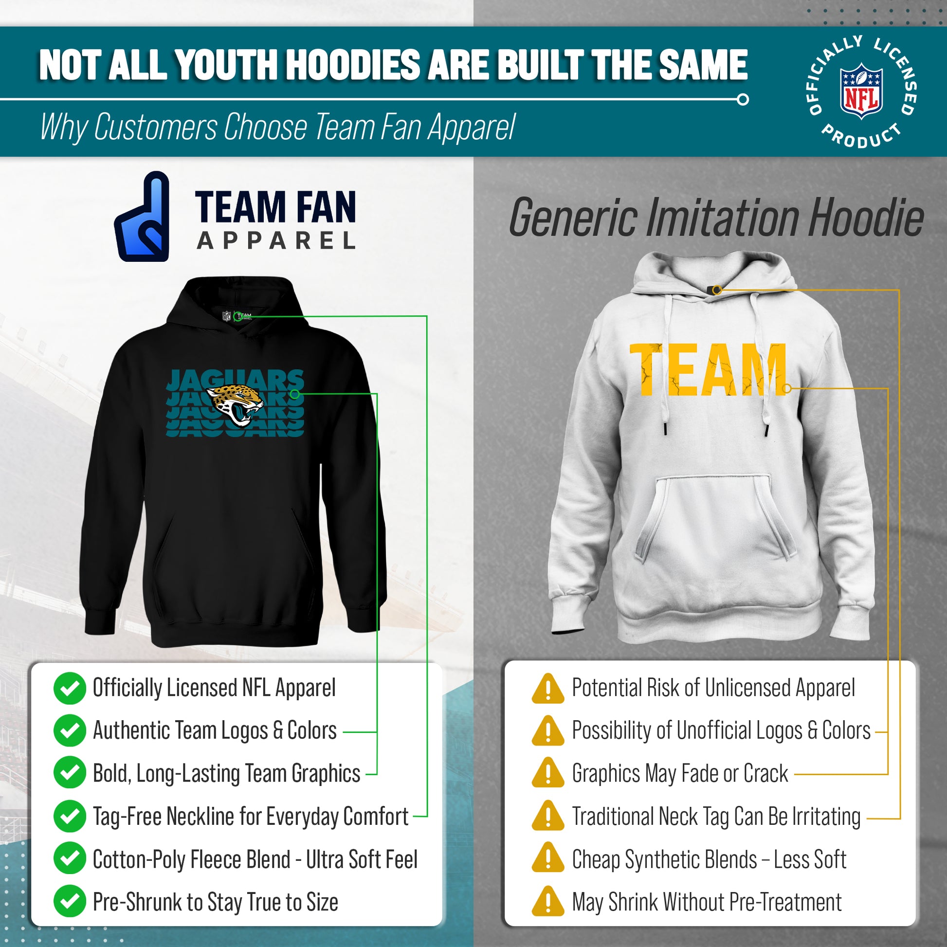 Hey there, young sports fans! Get ready to show off your team spirit with the Team Fan Apparel Jacksonville Jaguars Youth Repeating Logo Football Fleece Hooded Sweatshirt! Made from a soft and cozy cotton polyester fleece, this sweatshirt is perfect for staying warm on game day or any day. The unisex design makes it suitable for both boys and girls, and its tag-less feature ensures ultimate comfort all day long. Featuring an original repeating logo design that proudly displays your team's colors and logos, this youth hoodie will be turning heads everywhere it's worn. The front pouch pocket will keep you warm on those cold game days as you cheer on your Jaguars! Just pull it on and go! So whether you're at the stadium or hanging out with friends, make sure you're representing your team in style with our NFL youth apparel. Printed and designed in the USA, have confidence your sweatshirt will last! Order now and get your future pro geared up to be the next super fan!