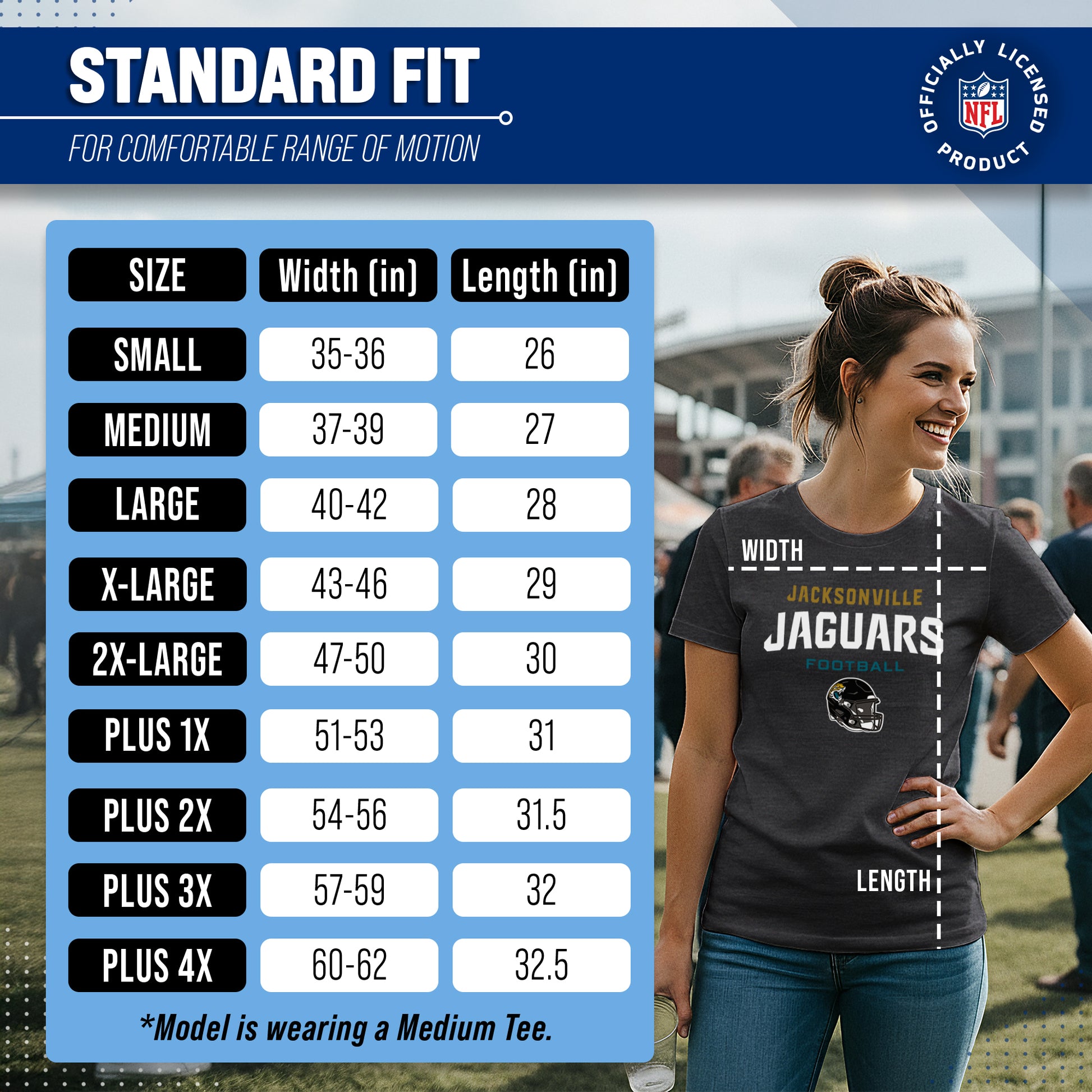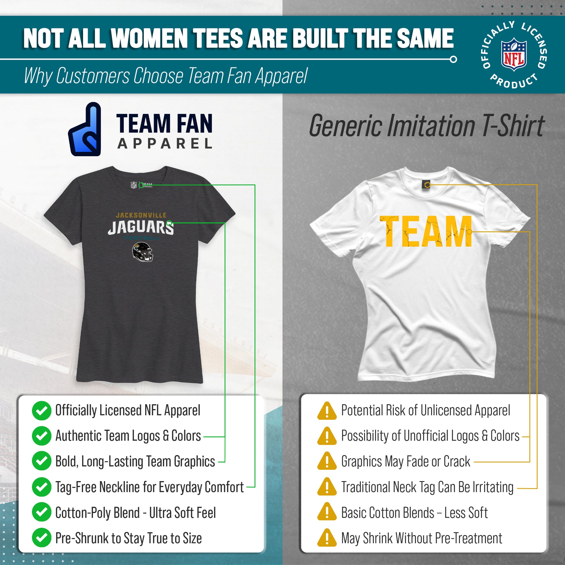 Score with Team Fan Apparel, the ultimate destination for officially licensed NFL apparel for men and women. We use only the highest-quality screen printing techniques to bring you the most comfortable, durable, and stylish clothing possible. Go ahead and show your team pride at the big game or any time! This premium womens t-shirt comes in small, medium, large, XL, and XXL. So needless to say, it fits Jacksonville Jaguars fans of all types! Maybe you aren't a Jaguars fan but you know someone who is? Don't worry! This high-quality t-shirt is soft, lightweight, breathable, and a GREAT gift for any birthday, anniversary, Mother's day, Valentine's day, or Christmas gift! So, if you want to stand out as the #1 female fan at the next big game or watch party, you're going to want to be wearing one of these Jacksonville Jaguars Women's Football Helmet t-shirts.