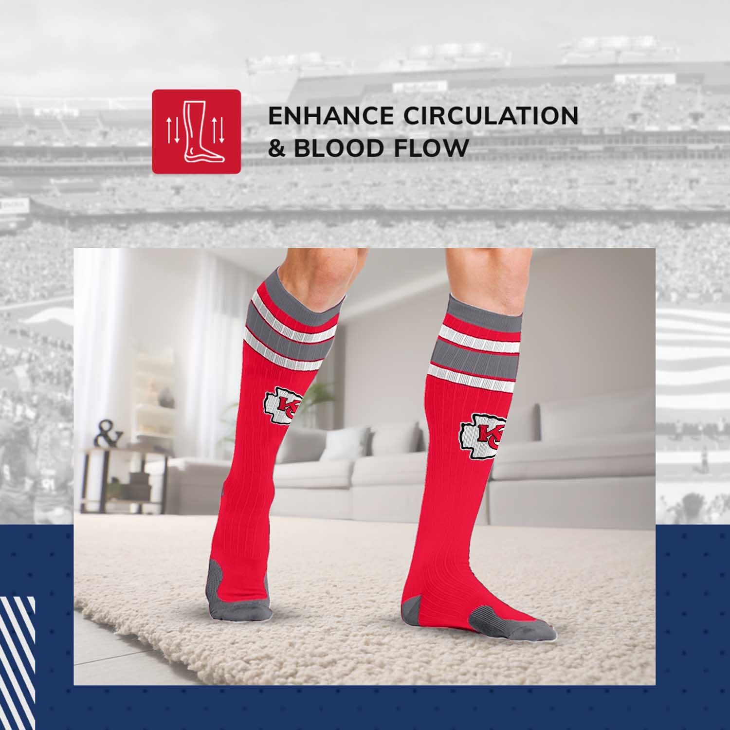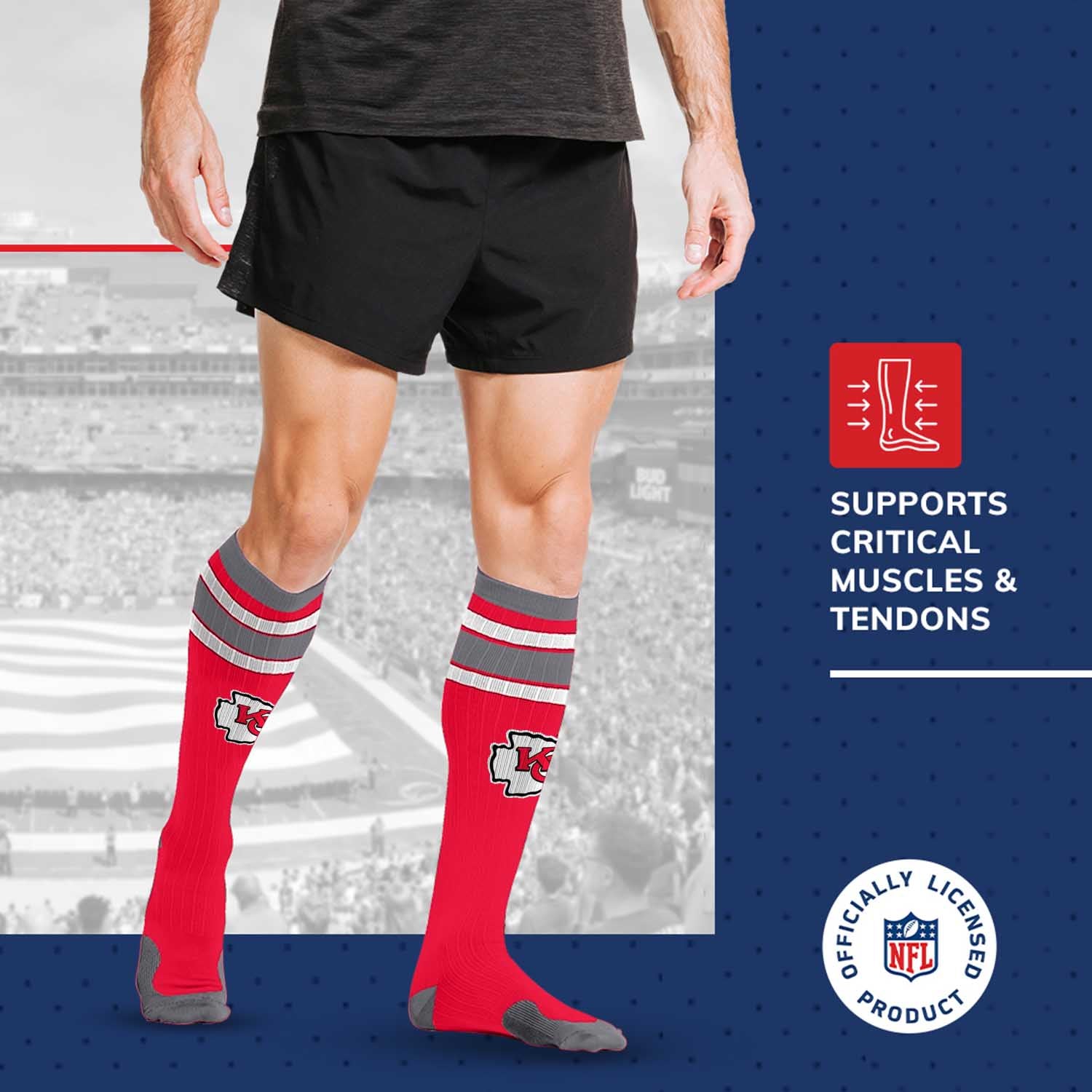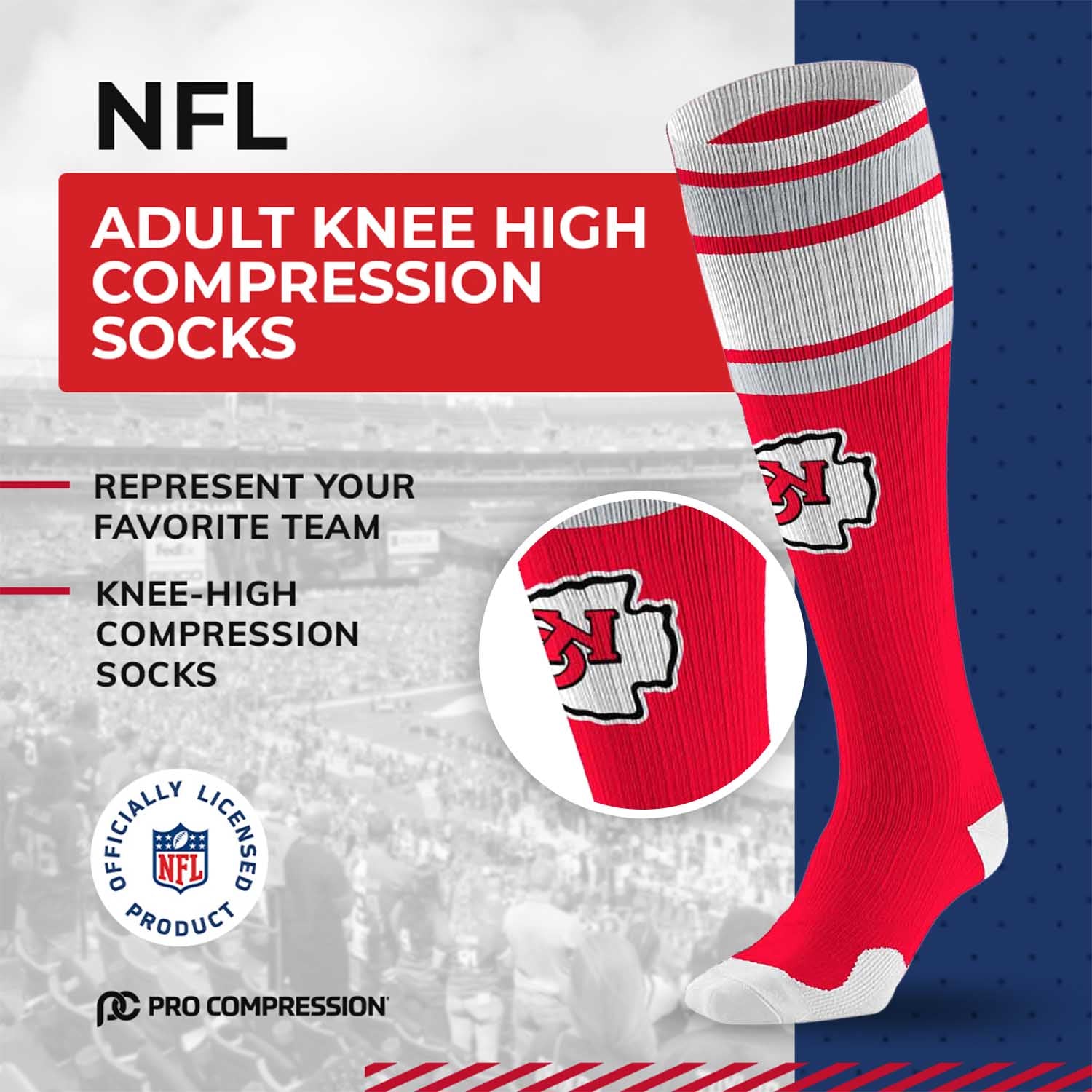 These Kansas City Chiefs NFL knee-high performance socks are designed to support your muscles and tendons during exercise, as well as reduce some soreness and swelling. With a true performance fit, our socks provide support where you need it most for the ultimate in athletics and recovery. Our proprietary blend of materials wicks moisture away from the skin to keep your feet dry and comfortable all day long. Two size options are available, so you can easily find a comfortable fit. Our [team_nickname] socks for women and men are the best performance socks and make great Kansas City Chiefs gifts for men, [team_nickname] gifts, [team_nickname] gear, and [team_nickname] socks. If you are looking for high-quality performance socks, unisex compression socks, [team_nickname] merchandise, or [team_nickname] gear, these football socks are for you!