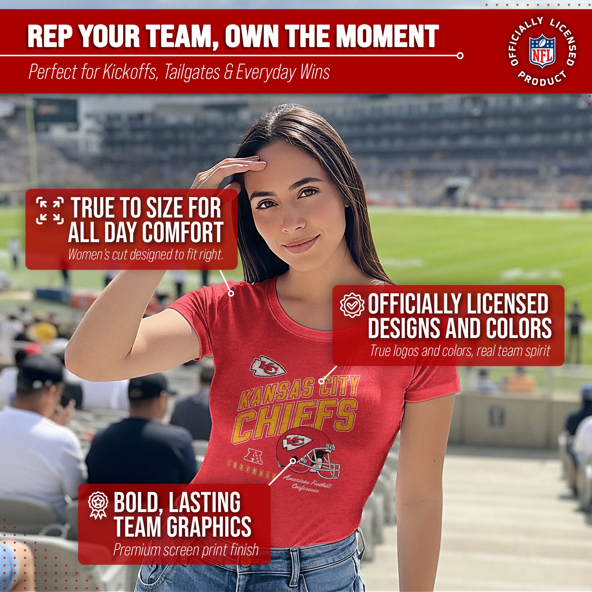 Calling all ladies! Get ready to rock game day with the Women's Team Fan Apparel Distressed Helmet T-Shirt! This comfortable and stylish Kansas City Chiefs womens tee is perfect for any female football fan, whether you're cheering on your favorite team at the stadium or watching from home. Made from a super soft cotton fabric , this shirt will keep you cool and comfortable all game long. The helmet, team name, team logo and official team color adds a touch of retro flair, while the tag-less design ensures itch-free wear. Whether you're a die-hard fan or just love a good simple look, this shirt is perfect for showing off your team spirit. Available in a wide range of women's sizes, it's suitable for all shapes and sizes! So grab your girlfriends and get ready to cheer on your team in style with the Women's Team Fan Apparel Distressed Helmet T-Shirt!