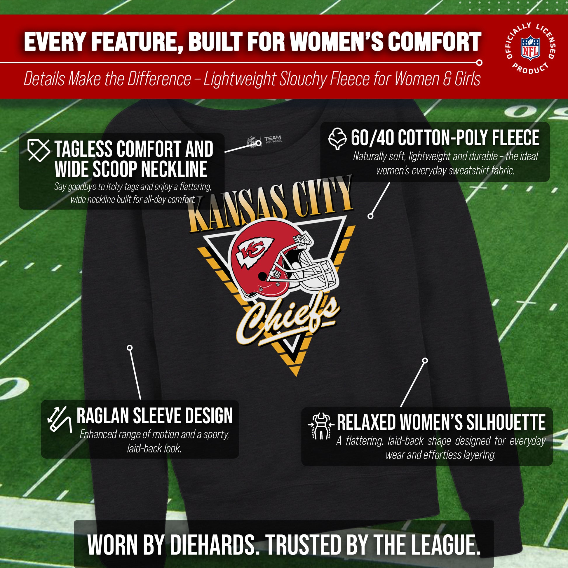 Hey there, fellow lady football fans! Show off your team pride in style with our Team Fan Apparel Kansas City Chiefs NFL Women's Retro Triangle Slouchy Crewneck Fleece Pullover. Made with extra soft cotton polyester fleece material, this long sleeve pullover sweatshirt will keep you warm and cozy on game day or any chilly day. With a tagless design, you won't have to worry about any annoying tags distracting you from cheering on your team. Featuring a retro triangle design and relaxed fit, this pullover adds a touch of fashion to your game day wardrobe. Available in a range of women's sizes, it's the perfect addition to any fan's closet. Whether you're headed to the stadium or watching from home, stay cool and stylish with this must-have piece of Chiefs apparel. Don't let snow or cold weather dampen your team spirit - grab one for yourself or as a gift for the ultimate football-loving lady in your life! Go Chiefs!