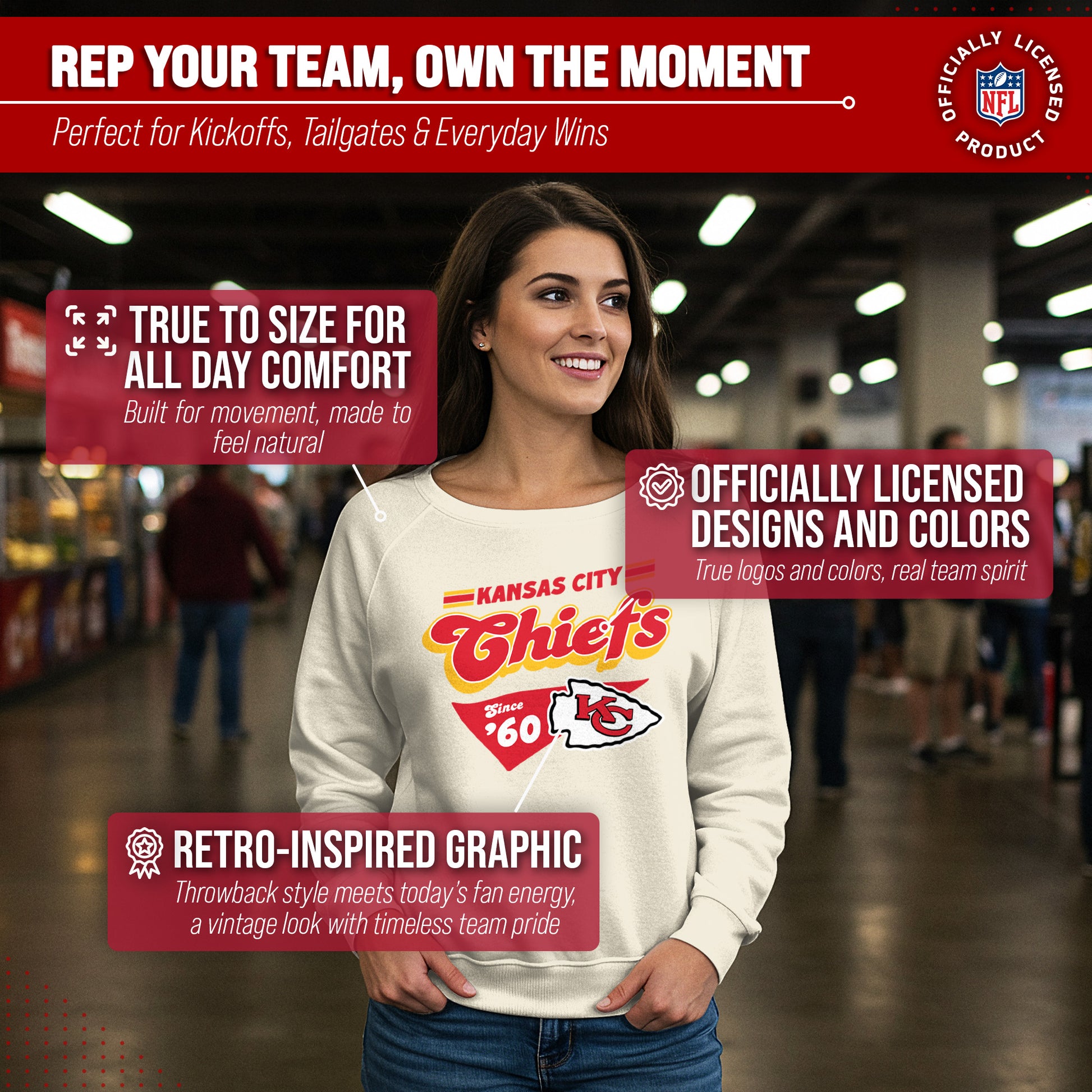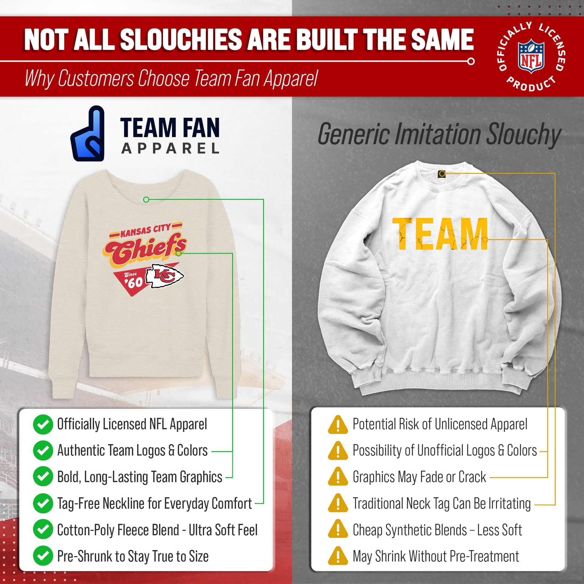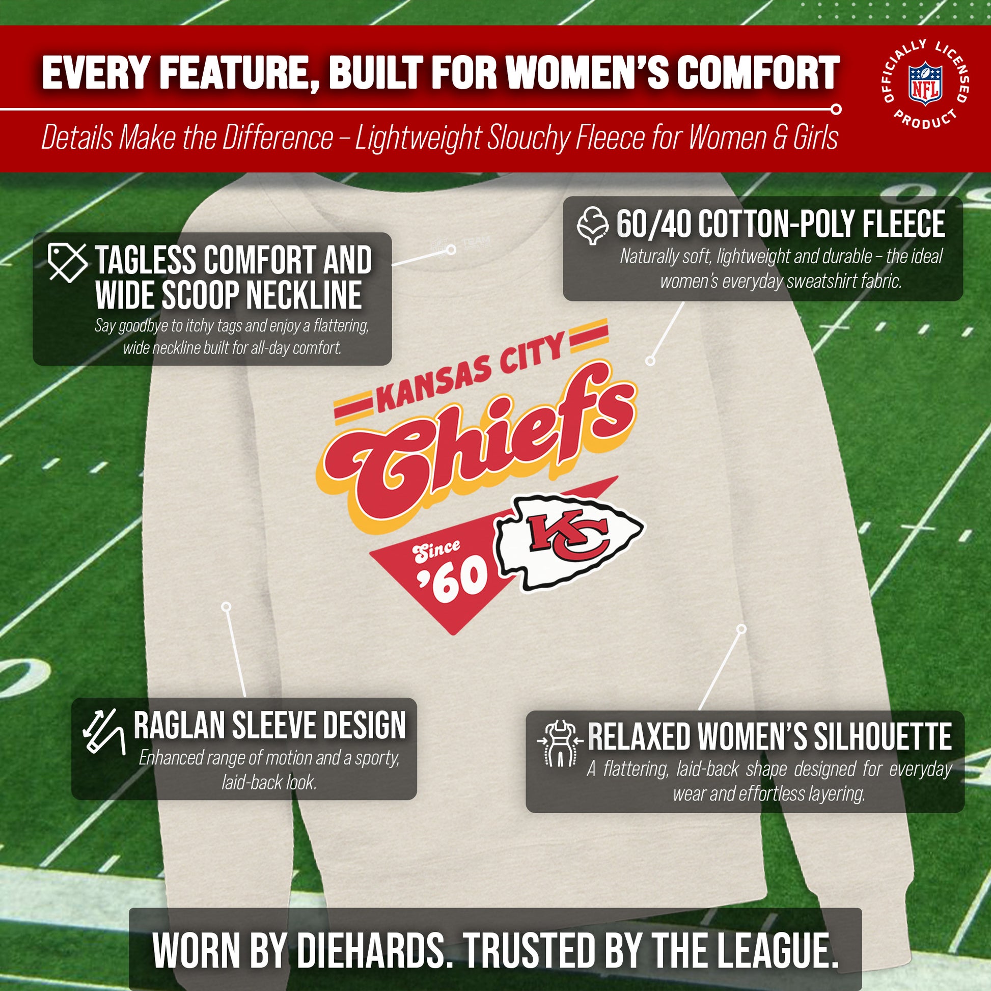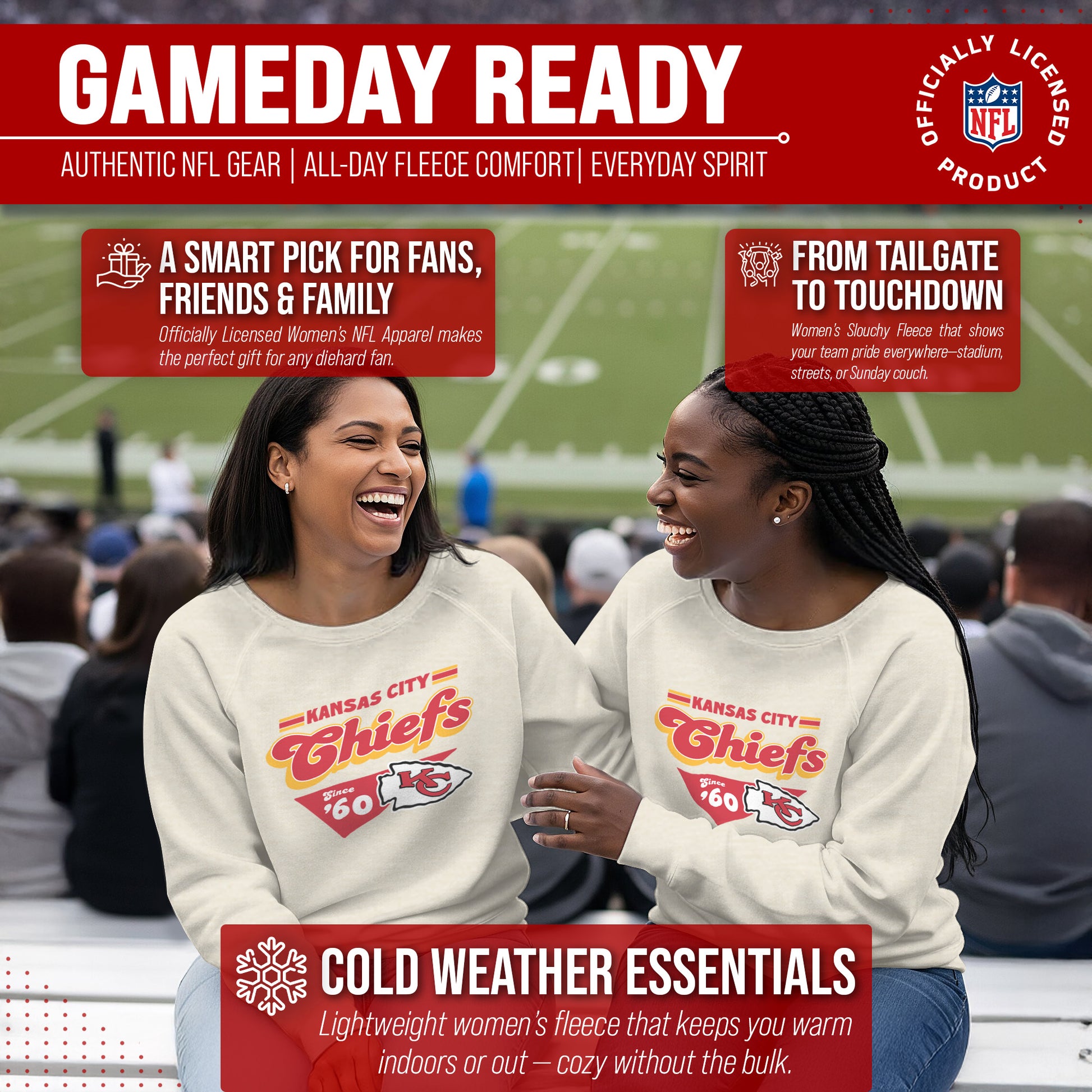 Hey there, fellow lady football fans! Show off your team pride in style with our Team Fan Apparel Kansas City Chiefs NFL Women's Vinntage Charm Slouchy Crewneck Fleece Pullover. Made with extra soft cotton polyester fleece material, this long sleeve pullover sweatshirt will keep you warm and cozy on game day or any chilly day. With a tagless design, you won't have to worry about any annoying tags distracting you from cheering on your team. Featuring a 90's design and relaxed fit, this pullover adds a touch of fashion to your game day wardrobe. Available in a range of women's sizes, it's the perfect addition to any fan's closet. Whether you're headed to the stadium or watching from home, stay cool and stylish with this must-have piece of Chiefs apparel. Don't let snow or cold weather dampen your team spirit - grab one for yourself or as a gift for the ultimate football-loving lady in your life! Go Chiefs!