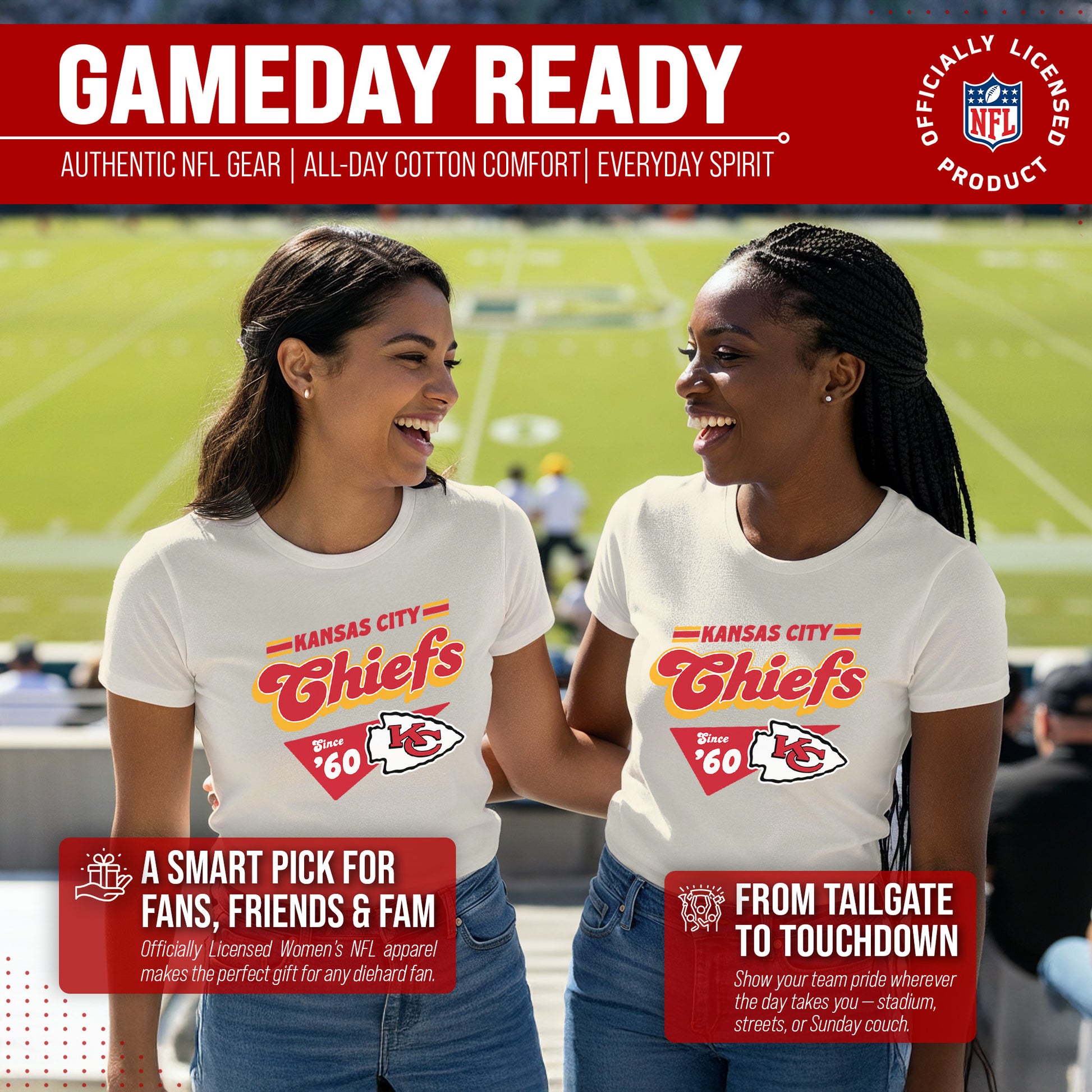 Calling all ladies! Get ready to rock game day with the Women's Team Fan Apparel Vintage Charm T-Shirt! This comfortable and stylish Kansas City Chiefs womens tee is perfect for any female football fan, whether you're cheering on your favorite team at the stadium or watching from home. Made from a super soft cotton fabric , this shirt will keep you cool and comfortable all game long. The pennant design, team name, and team logo adds a touch of retro flair, while the tag-less design ensures itch-free wear. Whether you're a die-hard fan or just love a good simple look, this shirt is perfect for showing off your team spirit. Available in a wide range of women's sizes, it's suitable for all shapes and sizes! The birch-colored garment will match well with everything in your closet! So grab your girlfriends and get ready to cheer on your team in style with the Women's Team Fan Apparel Vintage Charm T-Shirt!