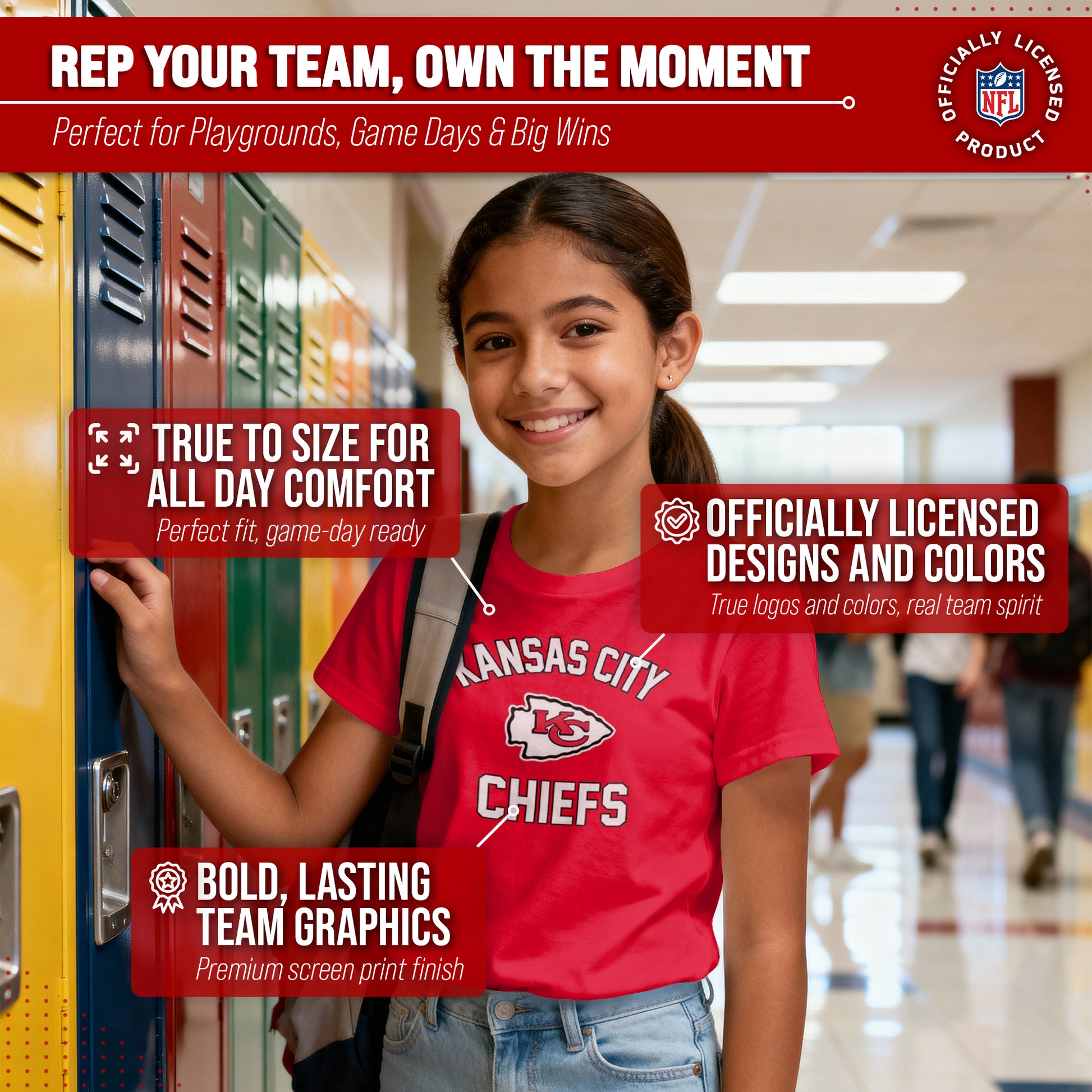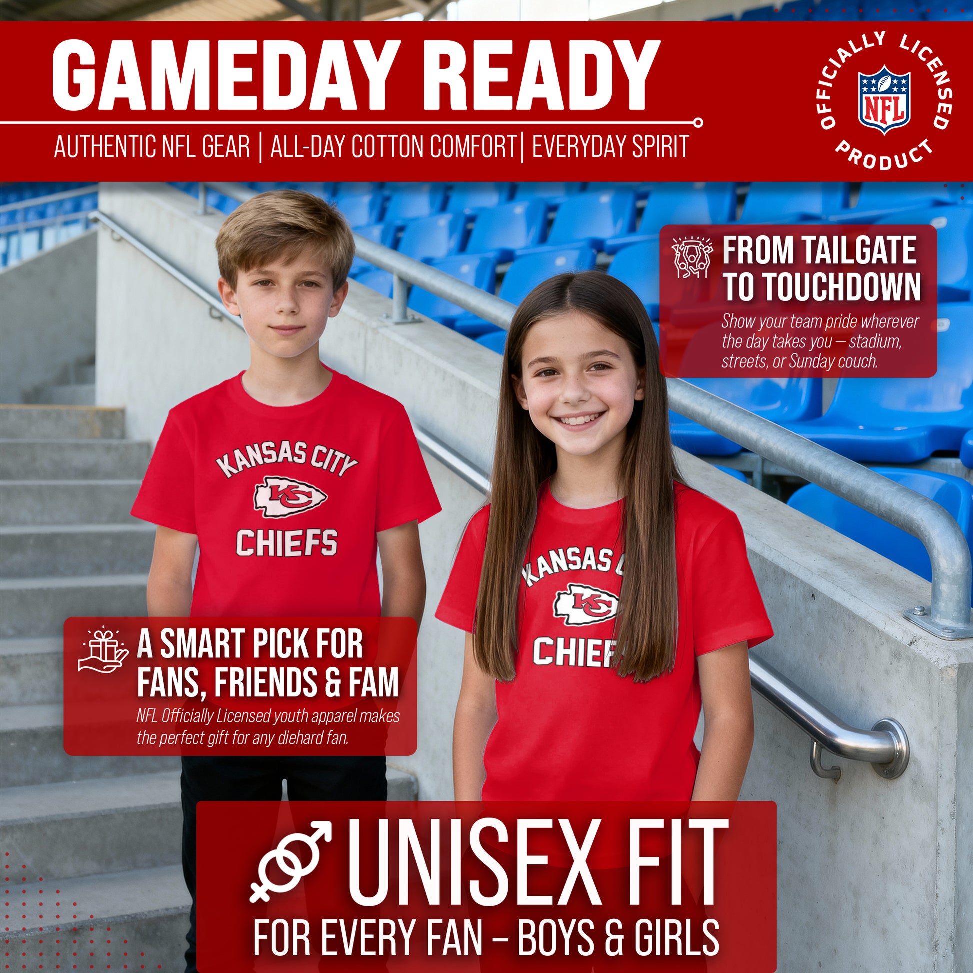 There's nothing more exciting than a much-anticipated gameday. Our Youth Gameday Kansas City Chiefs football tshirt is the ideal shirt to wear on gameday whether you're at the game, or watching from the comfort of your own home. This Kansas City tshirt is super comfortable, runs true to size, and is great for showing team pride all year long! The semi-fitted style makes this the perfect Chiefs youth shirt for both boys and girls. Our shirts really are the perfect fan apparel for school and sports games. The youth gameday shirt is lightweight and ideal for warmer weather or as an extra layer during colder months. Our Chiefs shirts for boys and girls are essential apparel for young football fans. Our tagless Kansas City Chiefs youth shirt ensures the most comfortable fit. This semi-fitted tshirt is made from a 50/50 cotton/polyester blend; contrast shoulder to shoulder neck tape and 1x1 rib knit neck makes for comfortable fit around the neck and shoulders. This high quality shirt for kids features a double-needle sleeve and bottom hems. These are high quality Chiefs graphic shirts for girls and boys. The vivid graphics will stay crisp wear after wear, and year after year. The thermal printed graphics are high definition, official true team colors, and also resist fading. This Kansas City tshirt is made with high stitch density for smoother printing surface. Our official shirts for boys and girls make the best gifts. This piece of Kansas City Chiefs apparel is the perfect birthday or Christmas gift for any young football fan. This tee is absolutely perfect for school, stadium fun, or watching the game at home.