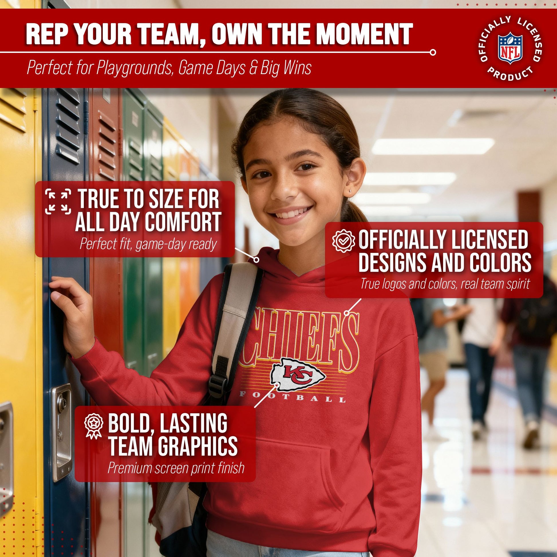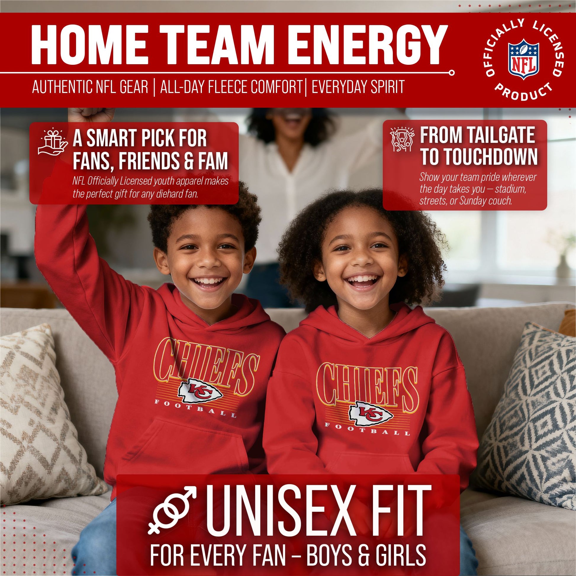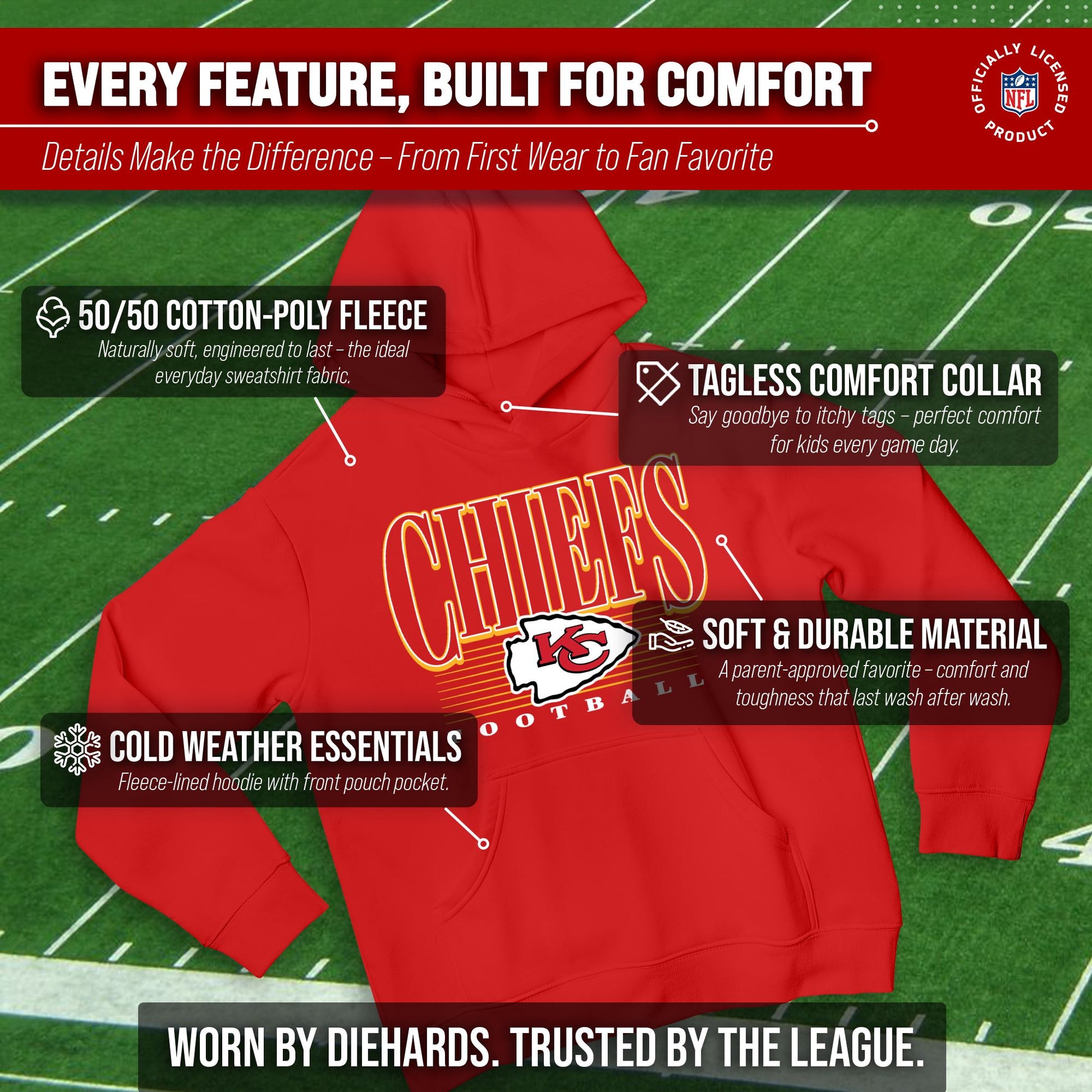 Hey there, young sports fans! Get ready to show off your team spirit with the Team Fan Apparel Kansas City Chiefs Youth Overtime Blueprint Football Fleece Hooded Sweatshirt! This sweatshirt is made from a soft and cozy cotton polyester fleece and is perfect for staying warm on game day or any day. The unisex design makes it suitable for both boys and girls, and its tag-less feature ensures ultimate comfort all day long. Featuring an original outlined design with their vintage logo that proudly displays the team's colors, this youth hoodie will be turning heads everywhere it's worn. The front pouch pocket will keep you warm on those cold game days as you cheer on your Chiefs! Just pull it on and go! So whether you're at the stadium or hanging out with friends, make sure you're representing your team in style with our NFL youth apparel. Printed and designed in the USA, have confidence your sweatshirt will last! Order now and get your future pro geared up to be the next super fan!