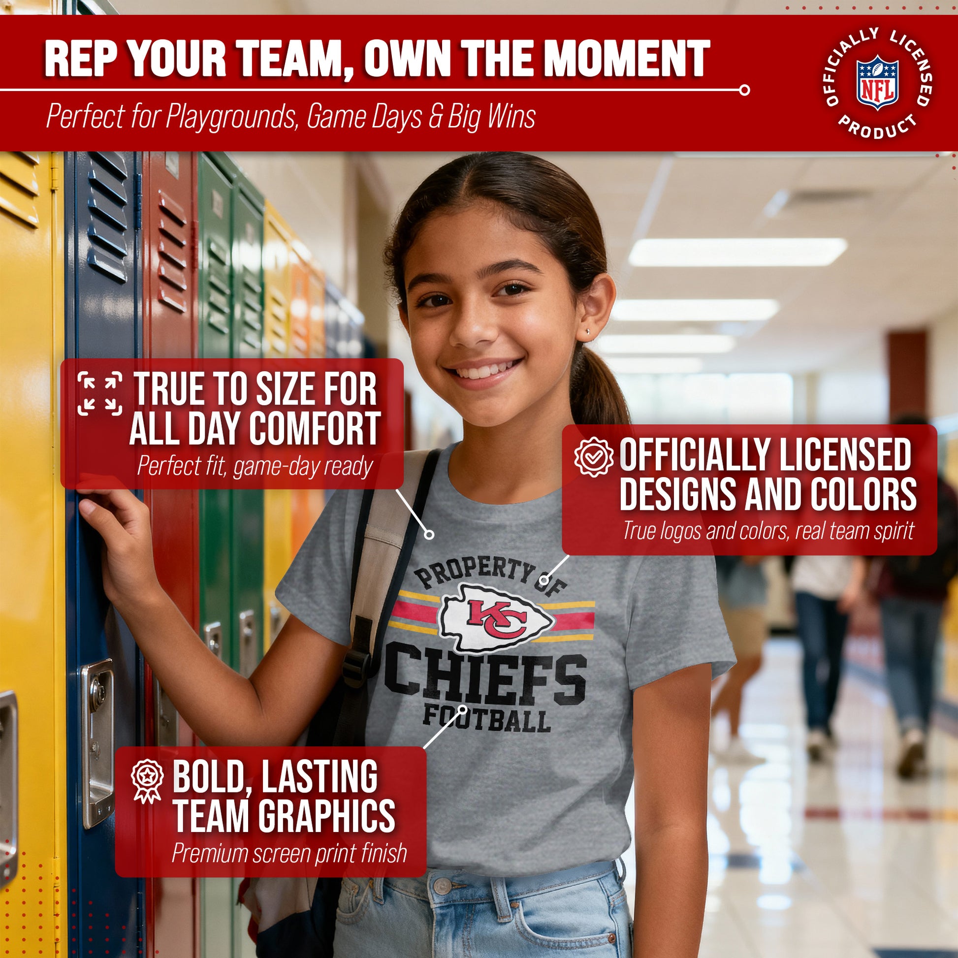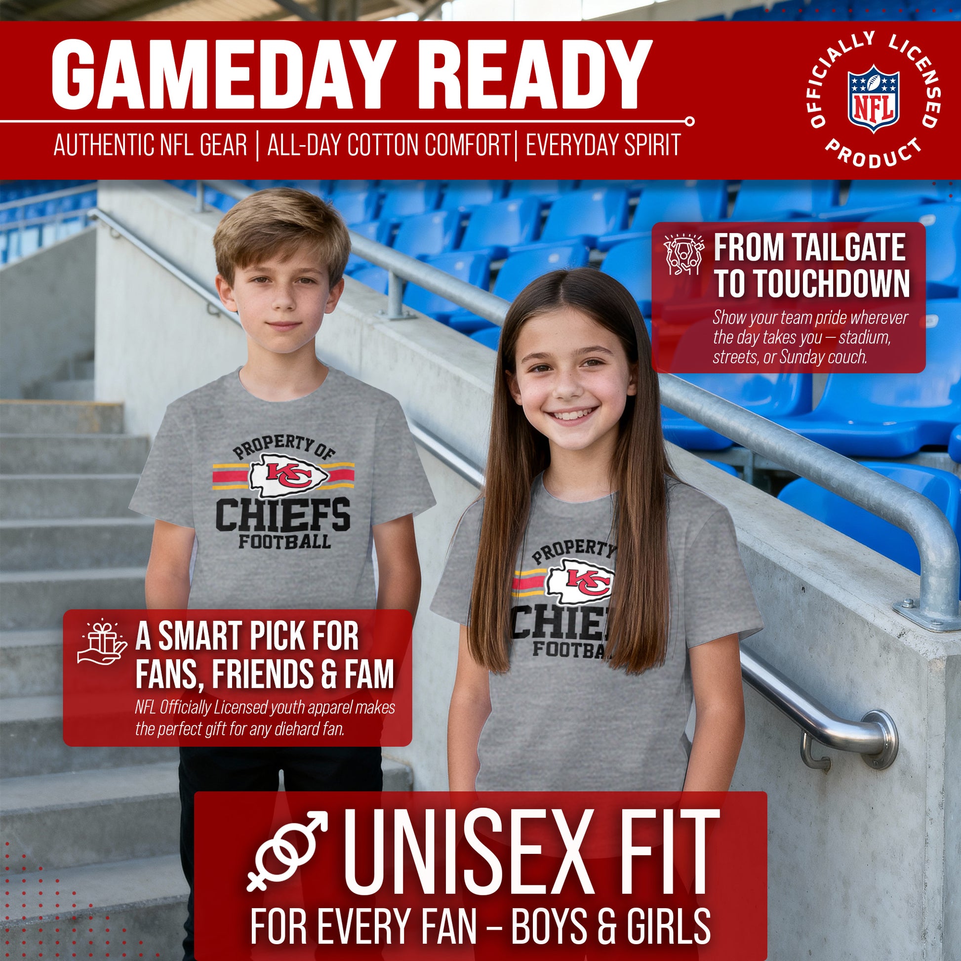 This Property of Kansas City Chiefs youth tshirt is made from 50% ringspun cotton and 50% polyester. Our soft Chiefs tshirt is beyond comfortable and light enough to keep you cool on gameday. This and soft enough that you'll want to wear it every day. Tagless pro football t-shirt ensures comfortability and avoids neck irritation. This tee is perfect for sensitive skin. The soft material of this short sleeve shirt is skin-friendly and adjusts according to your body shape; dual blend material leaves a trendy look without that irritating, heavy printed feel. This pro football tee for kids features official Property of graphics. Our high-quality tshirts are designed and printed in the USA. These high quality shirts are made with stitch density for smoother printing surface. This Property of Kansas City shirt gives the look only a true fan can accomplish. This is essential kids apparel for any football or sports fan. Our graphic shirts for boys and girls will make you stand out on gameday. This lightweight t-shirt is perfect for watching the game, wearing to school, or for a birthday gift. It's perfect for Chiefs football games. This short sleeve tee is a great addition to any young superfan's wardrobe. Our pro football short sleeve shirts offer a unisex fit that is ideal for both boys and girls. This Property of Kansas City Chiefs tshirt is perfect for school, big games, or when you just want to show off your team spirit. These festive Property of Program shirts are the ideal Chiefs gifts for boys and girls pro football teams.
