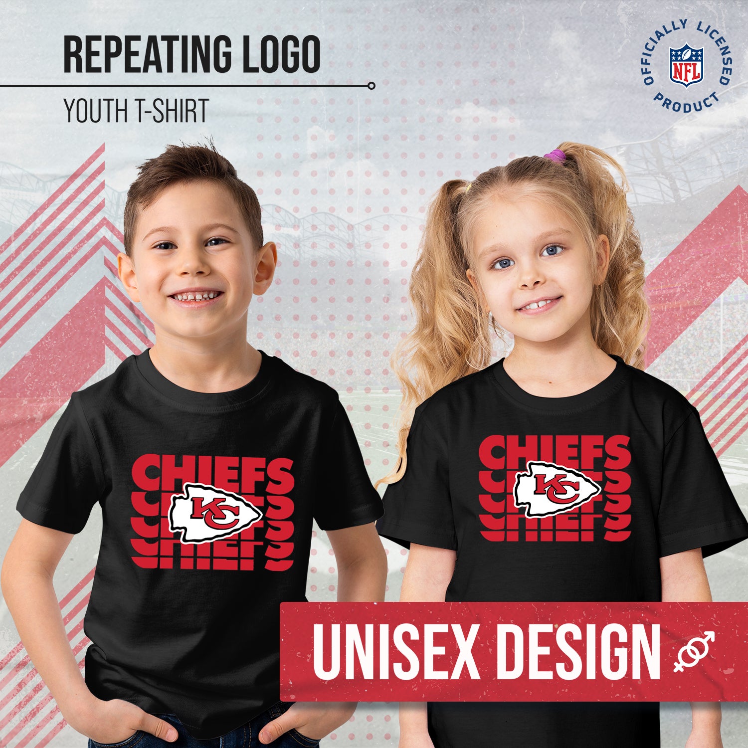 Hey there, young sports fan! Get ready to show off your team spirit with this awesome Chiefs Youth Repeating Logo Football T-Shirt. This unisex shirt is perfect for both boys and girls who love their favorite NFL team. And the best part? It's officially licensed by the league, so you know you're getting top-quality gear. Not only is this shirt stylish with its unique repeating logo design, but it's also super comfortable to wear. The lightweight and soft fabric will keep you feeling cool and cozy all day long. Plus, it's tag-free for added comfort - no more annoying tags scratching at your neck! Available in a range of youth sizes to fit kids of all ages, this t-shirt is the perfect addition to any fan's wardrobe. So whether you're cheering on your team from the stands or just hanging out with friends, make sure you're representing in style with this Kansas City Chiefs NFL t-shirt. Order yours today and get ready to root for your team in the coolest gear around!