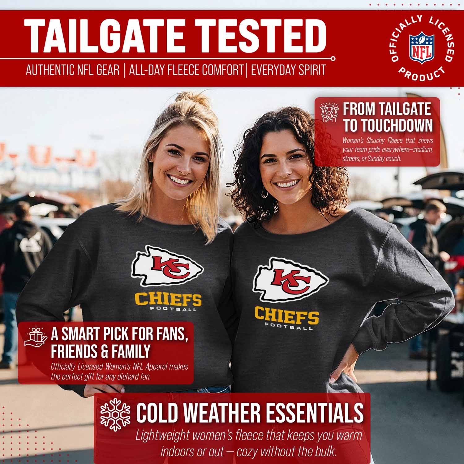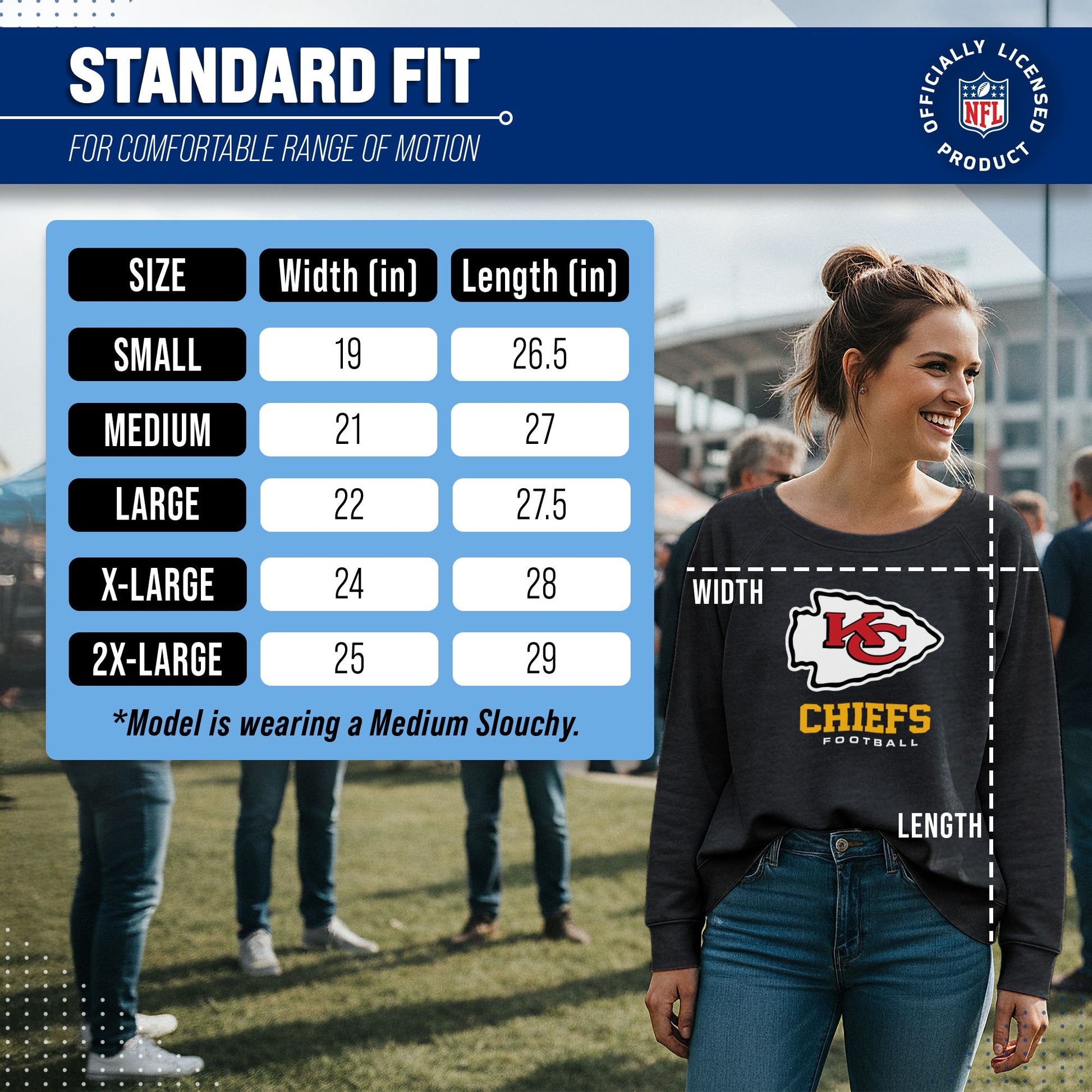 Score with Team Fan Apparel, the ultimate destination for officially licensed NFL apparel for men and women. We use only the highest-quality screen printing techniques to bring you the most comfortable, durable, and stylish clothing possible. Go ahead and show your team pride at the big game or any time! This premium womens slouchy charcoal crewneck comes in small, medium, large, XL, and XXL. So needless to say, it fits Kansas City Chiefs fans of all types! Maybe you aren't a Chiefs fan but you know someone who is? Don't worry! This high-quality crewneck is soft, lightweight, breathable, and a GREAT gift for any birthday, anniversary, Mother's day, Valentine's day, or Christmas gift! So, if you want to stand out as the #1 female fan at the next big game or watch party, you're going to want to be wearing one of these Kansas City Chiefs Women's Big Logo pullover crewnecks.