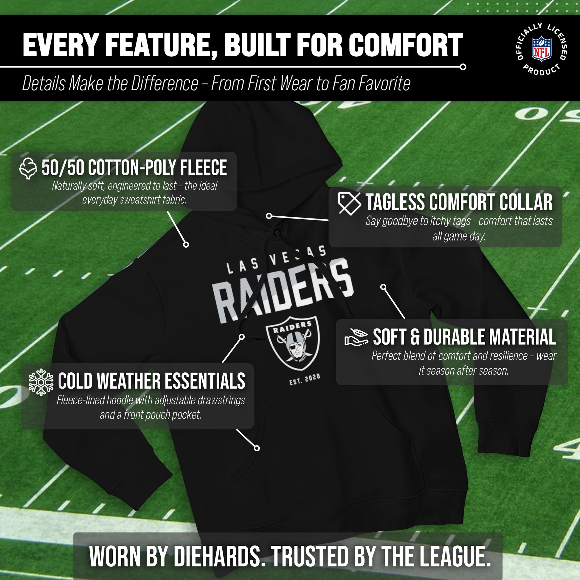 Score with Team Fan Apparel, the ultimate destination for officially licensed NFL apparel for men and women. We use only the highest quality screen printing techniques to bring you the most comfortable, durable, and stylish clothing possible. Go ahead and show your team pride at the big game or any time! This premium hooded sweatshirt fits both male and female adults and comes in small, medium, large, XL, and XXL. So needless to say, it fits Las Vegas Raiders fans of all types! Maybe you aren't a Raiders fan but you know someone who is? Don't worry! This high-quality sweatshirt is soft, lightweight but cozy, breathable and a GREAT gift for any birthday, anniversary, or Christmas gift; Father's Day, Mother's day, you name it! The front pouch pocket, drawstring hood, and soft fleece will keep you warm and keep your fandom hot! So, if you want to stand out as the #1 fan at the next big game, tailgate or watch party, you're going to want to be wearing one of these diagonal fade hooded sweatshirts