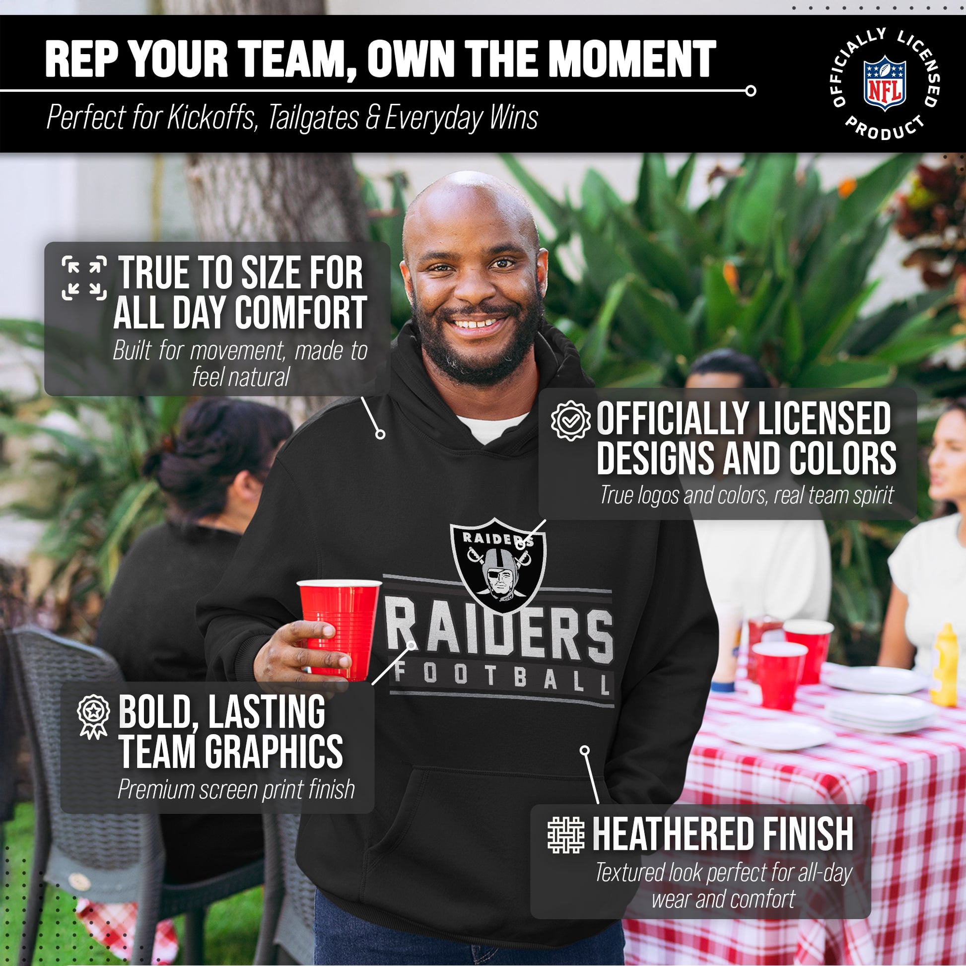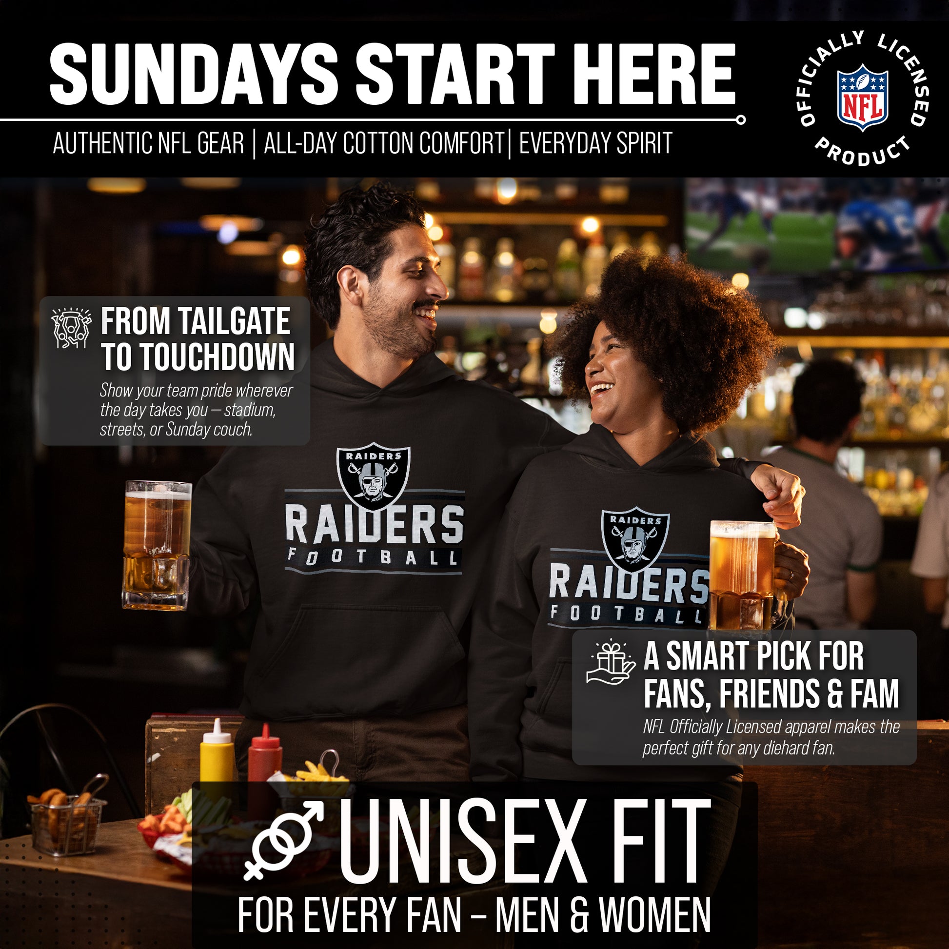 The True Fan womens and mens Las Vegas Raiders hoodies are the ultimate light, soft, & comfortable sweatshirts. These Las Vegas Raiders pullover hoodies are the most versatile football apparel. Let us help you celebrate your team pride with our durable and lightweight Las Vegas Raiders hoodies for men and women. This sweatshirt features a quality, screen printed wordmark that will last. The official wordmark design gives you the look of a loyal and seasoned sports fan and the unique, dual-blended material gives a trendy, distressed look without that heavy printed feel. Made of 50% ringspun cotton and 50% polyester, the dual blend material is extremely soft and smooth. These Las Vegas Raiders hoodies for men and women come without a tag, so you'll never feel irritated by tags again! This comfortable Las Vegas hoodie makes the best birthday, Christmas, or graduation gifts for Raiders fans.