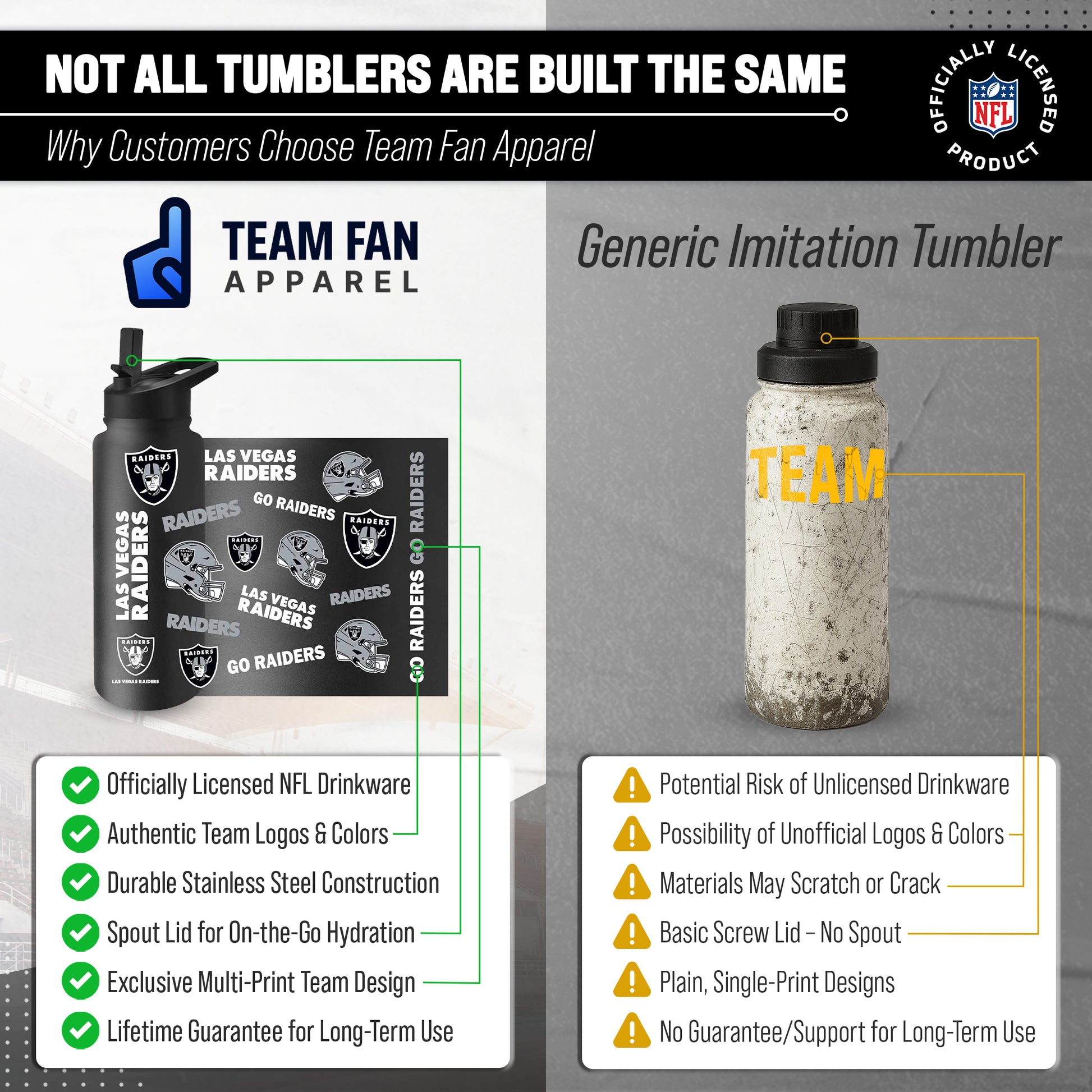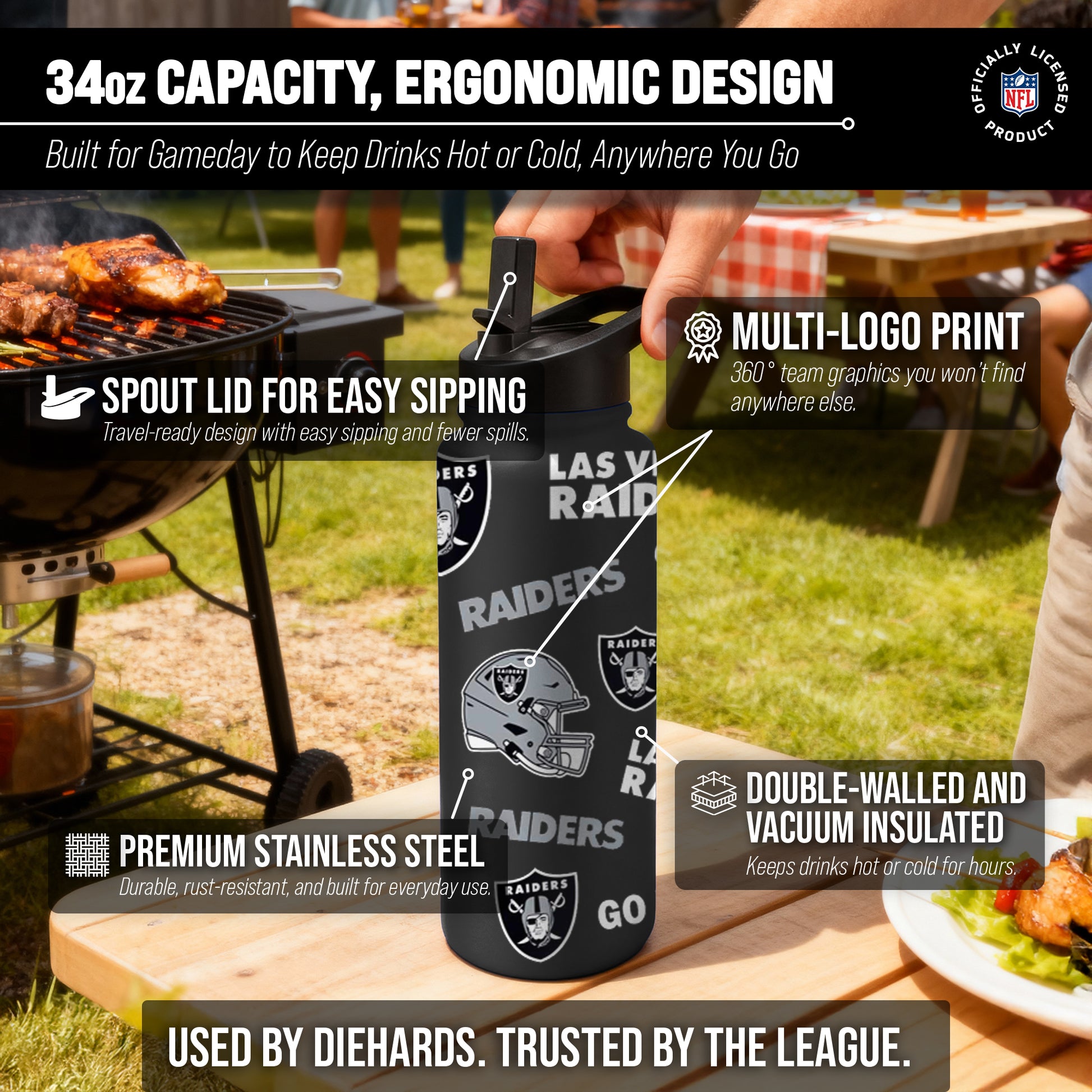 Keep Your Las Vegas Raiders Team Spirit and Drinks Handy On-the-Go with the NFL Native Quencher Water Bottle! Whether you're heading to the gym or tailgating at the game, this 34oz Raiders water bottle is the perfect companion for any fan. Made from durable stainless steel, it's designed to keep your drinks hot or cold for hours. The no-leak dual option lid allows you to sip through a straw or drink straight from the spout. But it's not just for water! This versatile bottle can also hold your favorite coffee, tea, & more. With its insulated design, your beverages will stay at their desired temperature until you're ready for them. Featuring your team's logo & colors, this water bottle proudly displays your loyalty while keeping you hydrated. And when it's time for a refill, simply take off the lid and fill up again. Cheers to staying hydrated in style with the Las Vegas Raiders Water Bottle! Hand wash only! Great for yourself or any fan in your life, especially for on-the-go and travel!