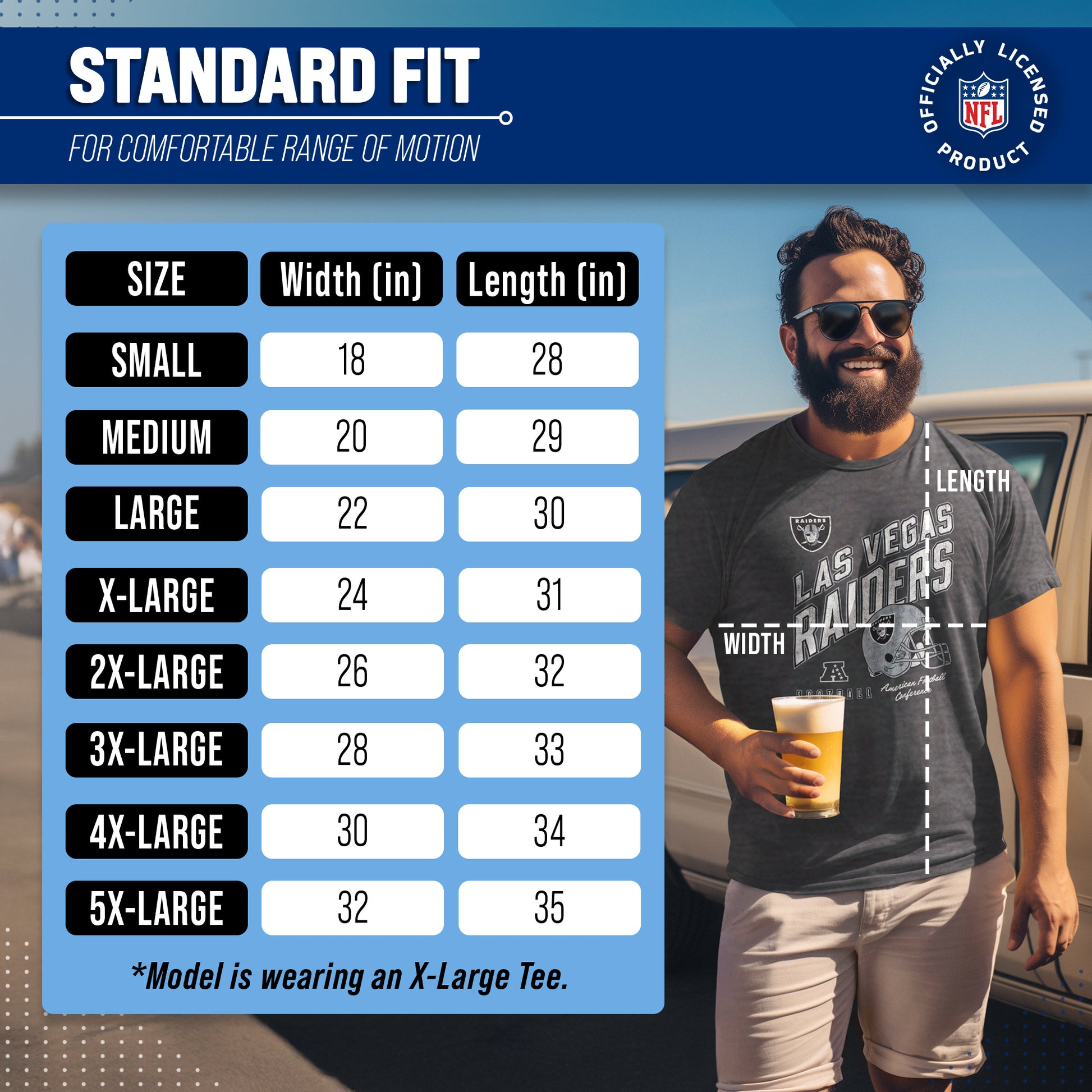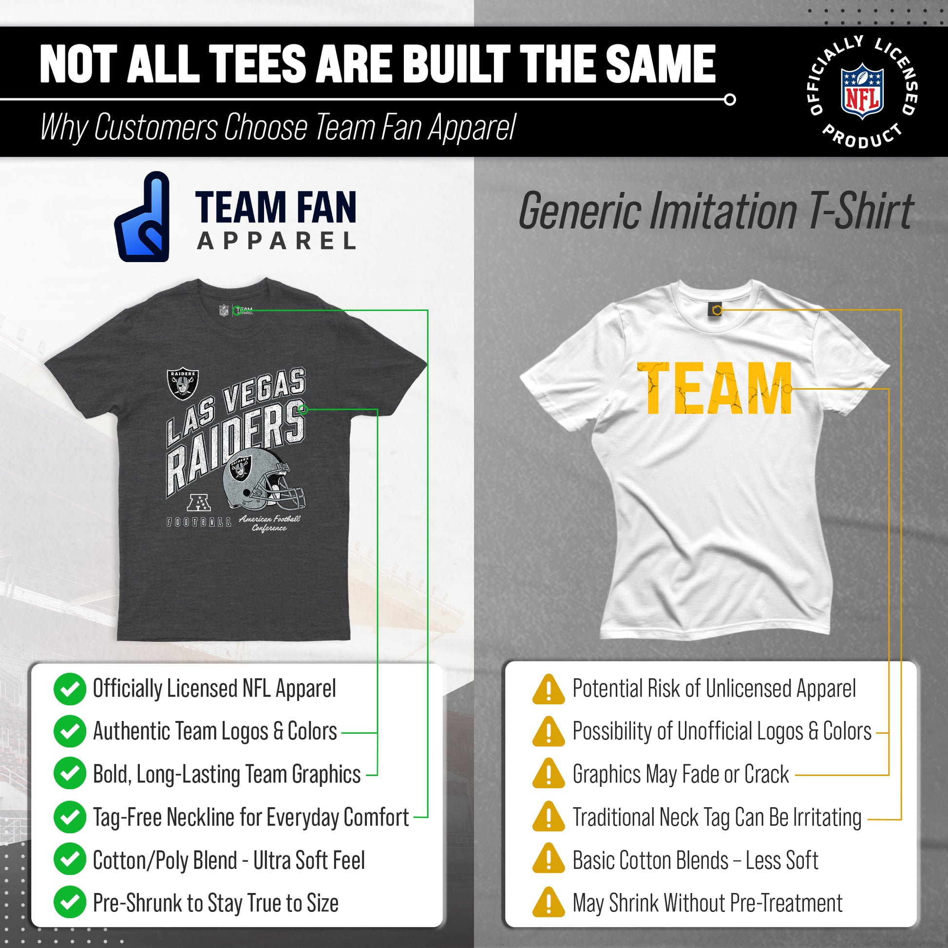 Show off your team spirit in style with our Team Fan Apparel Las Vegas Raiders NFL Distressed Helmet Tag-Less T-Shirt! Made for both men and women, this unisex t-shirt is the perfect addition to any football fan's wardrobe. With its soft and comfortable cotton blend fabric, you'll love wearing it to games or just lounging at home. The tag-less design ensures maximum comfort without any annoying tags scratching at your neck. Featuring a large vibrant helmet design with the team name printed largely, along with the official team logo, this shirt will make you stand out from the crowd and show off your die-hard fandom. It comes in multiple sizes, so you can choose the one that fits best & represents your team spirit. Whether you're cheering on your Raiders at the stadium or watching from home, our NFL Distressed Helmet Tag-Less T-Shirt is a must-have for all fans! So grab yours today and support your team in comfort and style. Go team!