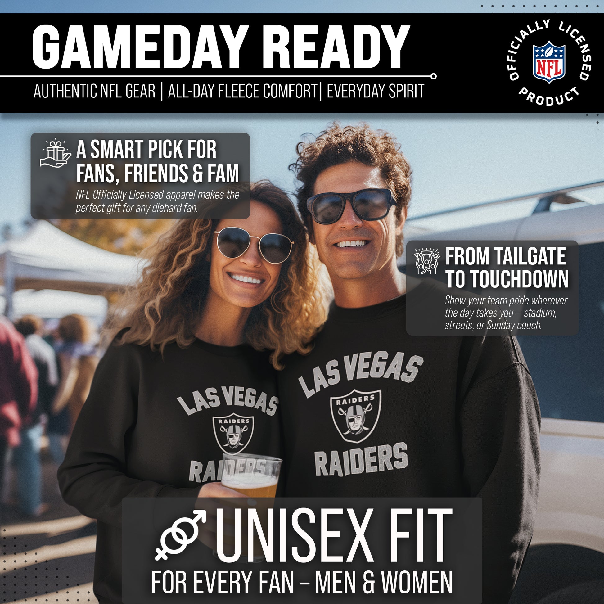 This adult Gameday Las Vegas Raiders football crewneck is the ideal sweatshirt to wear on gameday. Our crewneck sweatshirt is comfortable, runs true to size, and is great for showing team pride all year long! This is the perfect Las Vegas sweatshirt for both men and women. Our Las Vegas Raiders team colored crewneck sweatshirts are the perfect fan apparel for tailgates and sports games. The lightweight crewneck pullover is made of air jet yarn for a softer feel and reduced pilling, which means your crewneck sweatshirt will look new for years to come. You don't have to worry about the Las Vegas graphics fading on your crewneck, either. The pullovers are made with thermal printed graphics that are high definition, true team color, and resist fading! This Las Vegas sweatshirt is ideal for warm or cold weather, which means you can wear it not only all football season, but all year long! Our pro football crewneck sweatshirt features 1x1 rib with spandex for enhanced stretch and recovery. This Las Vegas crewneck sweatshirt has double-needle stitching at shoulders, armholes, neck, waistband, and cuffs. Our comfortable crewneck pullover is made from a cotton poly fleece blend. This tagless sweatshirt ensures the most comfortable fit for men and women. The classic fit of this sweatshirt makes this Las Vegas Raiders crewneck that perfect pullover for Las Vegas men and women fans. Our pro Las Vegas Raiders pullover sweatshirts for men and women make the best Las Vegas gift. Las Vegas Raiders apparel is the perfect birthday gift for any football fan. This Las Vegas Raiders football crewneck sweatshirt is perfect for tailgating, stadium fun, or watching the game at home.