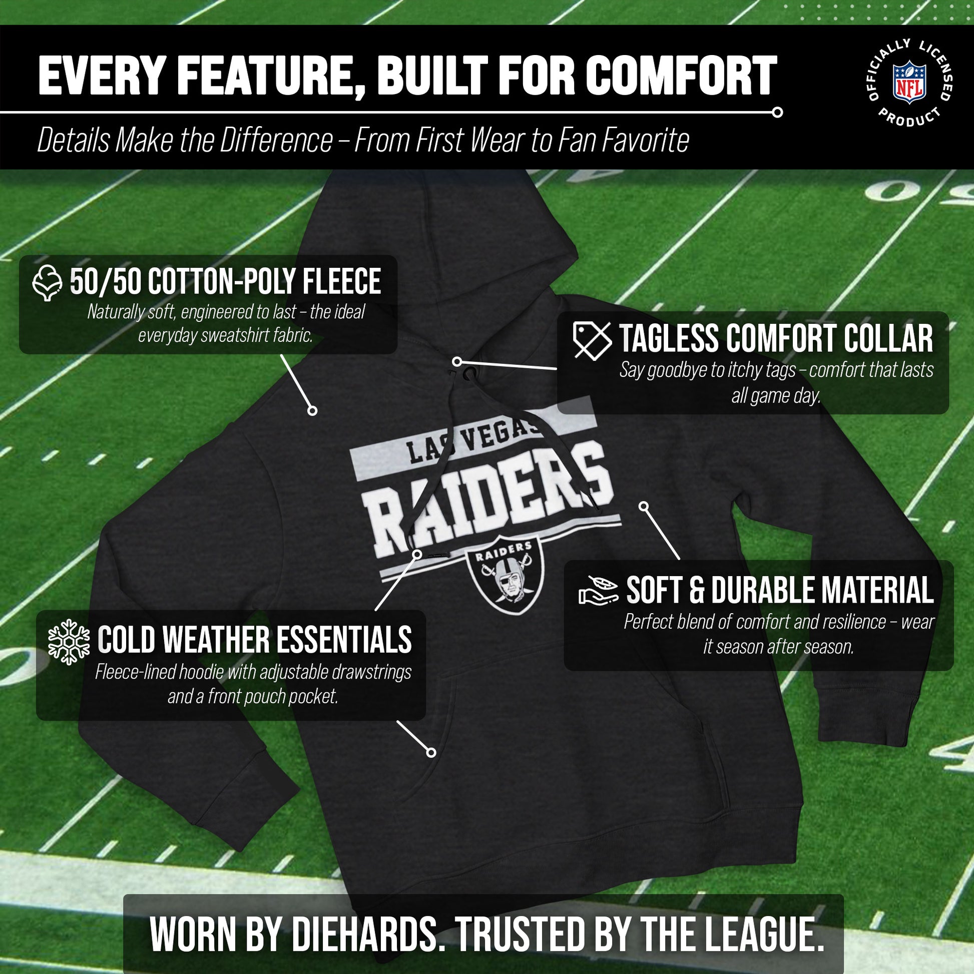 Our Charcoal Gameday Hooded Sweatshirt is a Las Vegas sweatshirt with a warm and toasty 9 oz fleece lining. It's the very best of Las Vegas Raiders apparel, plain and simple. Gear up for your cold weather football game with confidence. Or, for women, bring it with you to games and tie it around your leggings in case the arena is a little chilly. Our football hoodie sweatshirts for men and women are super comfortable, run true to size, and are great for showing your team pride all year long. Plus, the unisex fit is ideal for both men and women and works as an oversized sweatshirt for kids. Las Vegas Raiders sweater for men and women features your teams thermal-printed logo wordmark will stay crisp and clear, wear after wear. All colors and fonts are officially licensed and are of the highest of quality, it even comes with an officially licensed tag. Comes with an officially licensed tag; ribbed cuffs and waistband, double layer hood with drawstrings, spacious front pouch pocket. This football sweatshirt in particular is perfect for tailgates, games, and showing off your team spirit. Gameday hooded [team_ long] sweatshirts make a great birthday, Christmas (or any other holiday), or graduation gift for a sports fan. Gameday charcoal hood is essential apparel for protecting yourself and your loved ones from the elements. The fleece material will keep you warm through the colder months, and the no-zip design allows you to pullover and feel embraced like a big oversized blanket. The Las Vegas Raiders charcoal crew necks are pre-shrunk and are made from a dual blend of 50% cotton and 50% polyester that is ideal for that tailgate or game day when the temperature drops. Pair with your other favorite Las Vegas game day apparel! Say goodbye to cheap sweatshirts. Our charcoal sweatshirts for women and men help you gear up and get ready to cheer your team to victory.