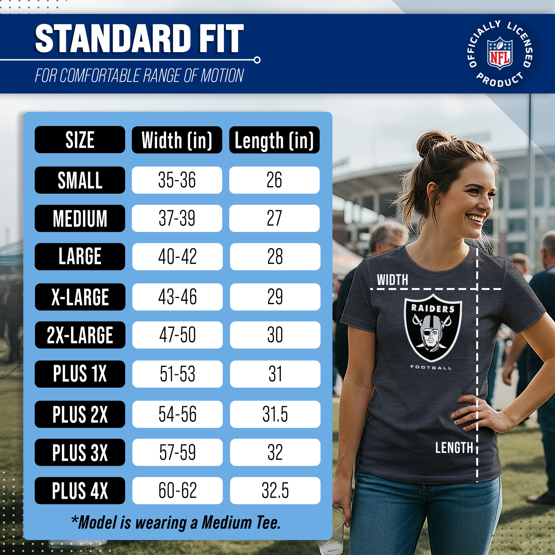 Score with Team Fan Apparel, the ultimate destination for officially licensed NFL apparel for men and women. We use only the highest-quality screen printing techniques to bring you the most comfortable, durable, and stylish clothing possible. Go ahead and show your team pride at the big game or any time! This premium womens t-shirt comes in small, medium, large, XL, and XXL. So needless to say, it fits Las Vegas Raiders fans of all types! Maybe you aren't a Raiders fan but you know someone who is? Don't worry! This high-quality t-shirt is soft, lightweight, breathable, and a GREAT gift for any birthday, anniversary, Mother's day, Valentine's day, or Christmas gift! So, if you want to stand out as the #1 female fan at the next big game or watch party, you're going to want to be wearing one of these Las Vegas Raiders Women's Big Logo t-shirts.