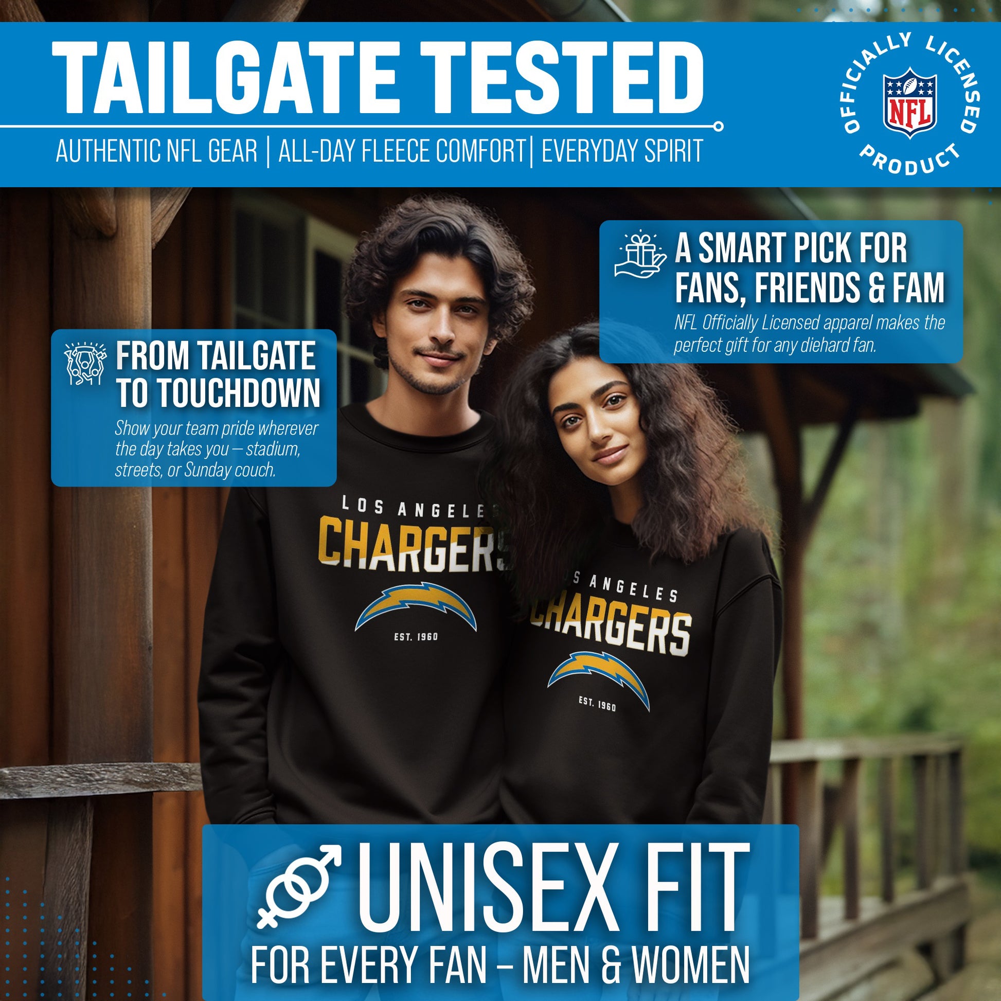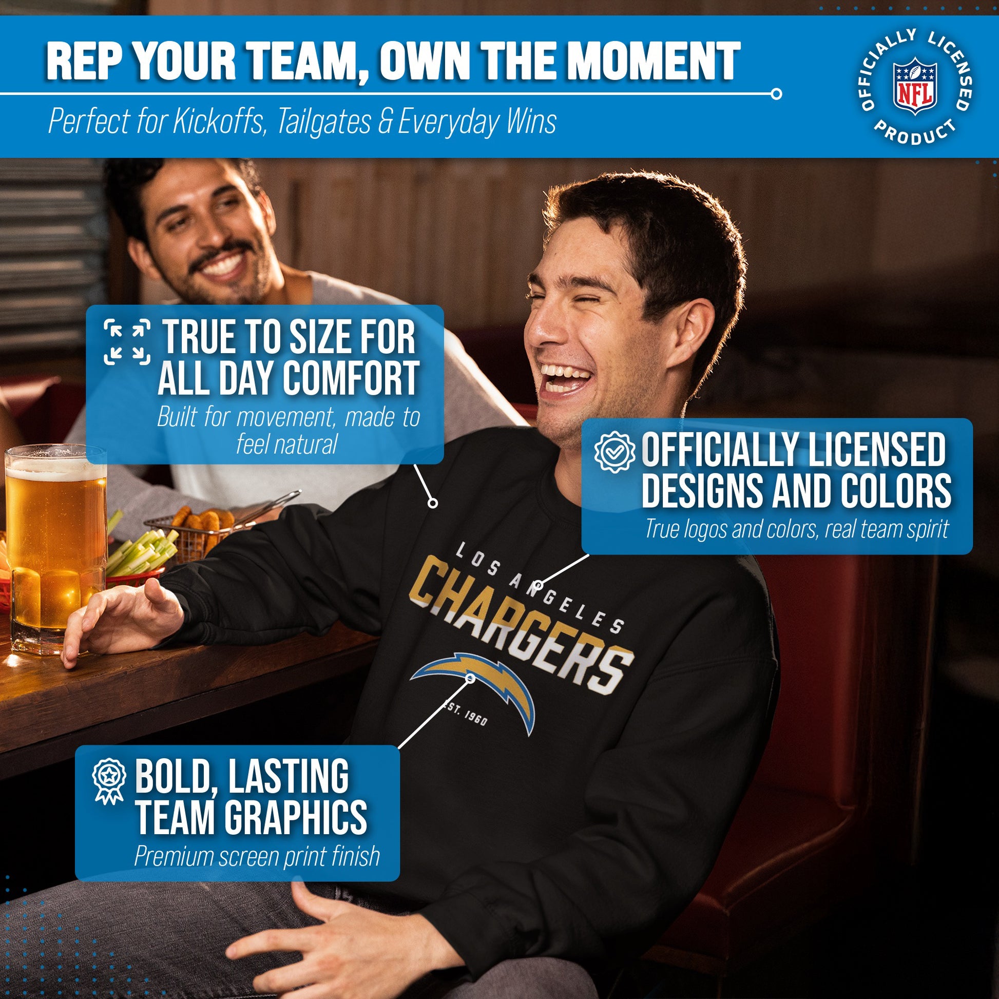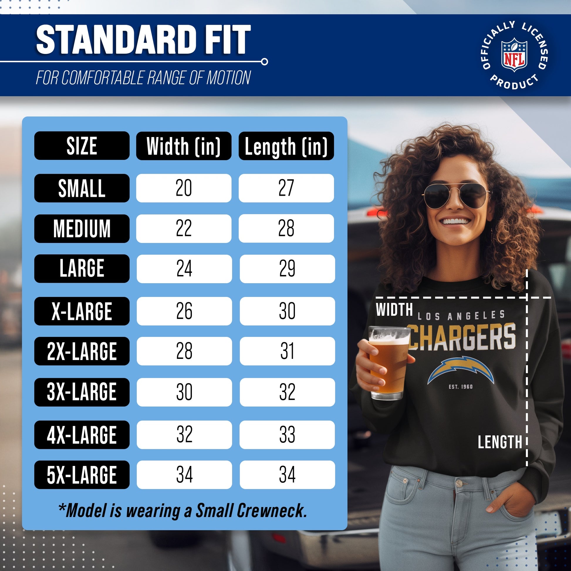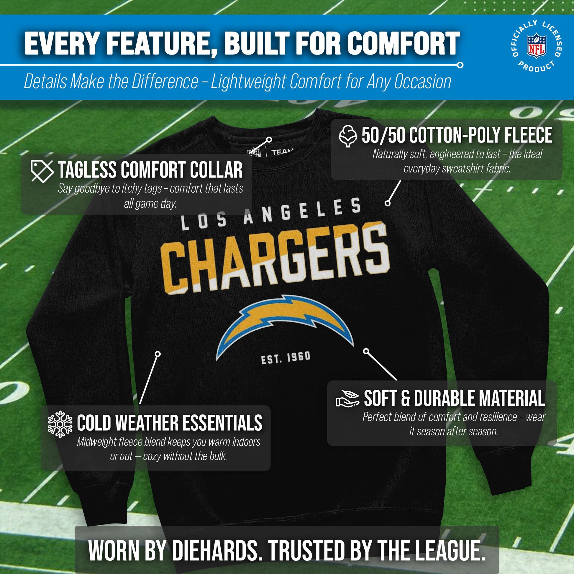 Score with Team Fan Apparel, the ultimate destination for officially licensed NFL apparel for men and women. We use only the highest quality screen printing techniques to bring you the most comfortable, durable, and stylish clothing possible. Go ahead and show your team pride at the big game or any time! This premium crewneck fits both male and female adults and comes in small, medium, large, XL, and XXL. So needless to say, it fits Los Angeles Chargers fans of all types! Maybe you aren't a Chargers fan but you know someone who is? Don't worry! This high-quality crewneck is soft, lightweight, breathable and a GREAT gift for any birthday, anniversary, Father's Day, Mother's day, you name it! So, if you want to stand out as the #1 fan at the next big game or watch party, you're going to want to be wearing one of these great football crews.