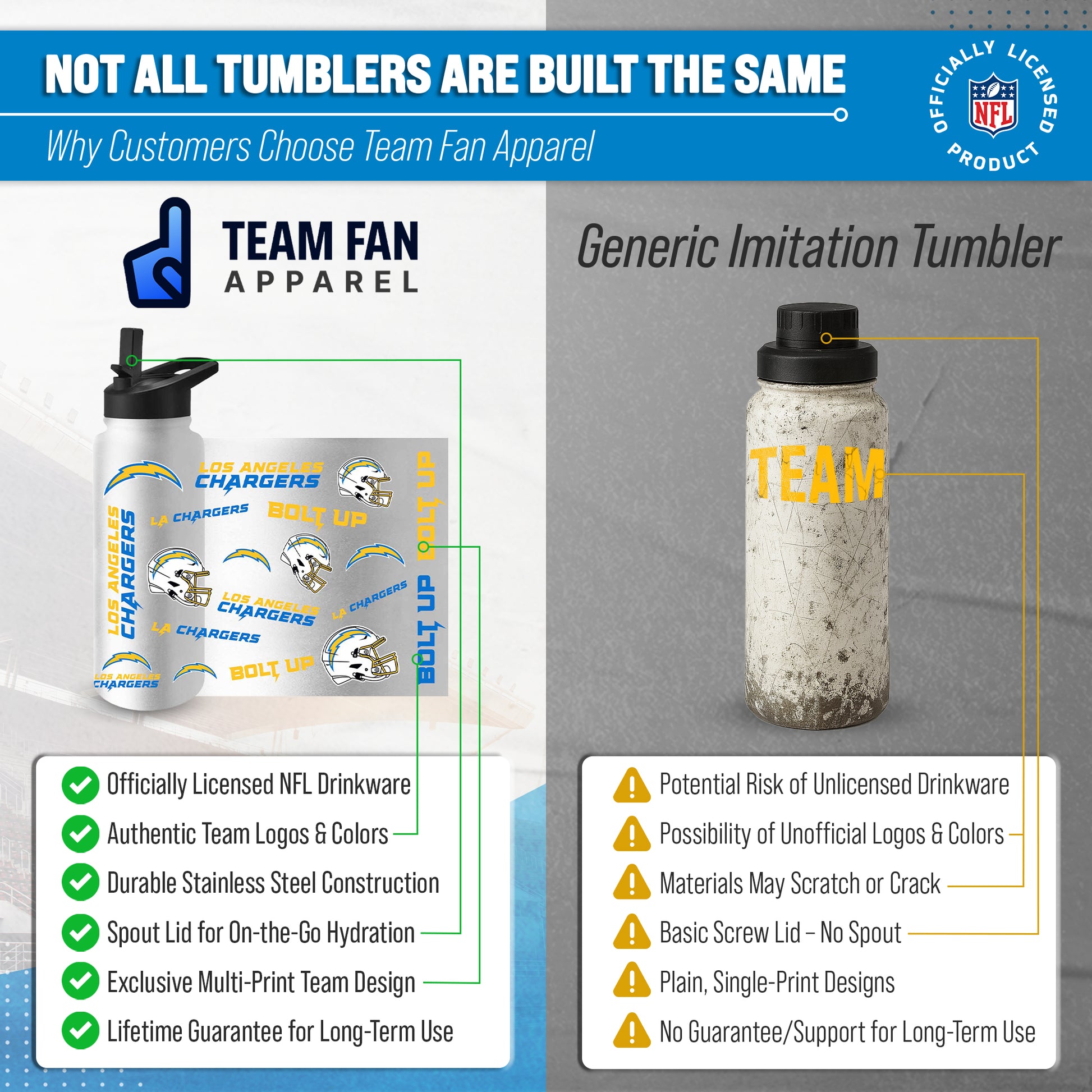 Keep Your Los Angeles Chargers Team Spirit and Drinks Handy On-the-Go with the NFL Native Quencher Water Bottle! Whether you're heading to the gym or tailgating at the game, this 34oz Chargers water bottle is the perfect companion for any fan. Made from durable stainless steel, it's designed to keep your drinks hot or cold for hours. The no-leak dual option lid allows you to sip through a straw or drink straight from the spout. But it's not just for water! This versatile bottle can also hold your favorite coffee, tea, & more. With its insulated design, your beverages will stay at their desired temperature until you're ready for them. Featuring your team's logo & colors, this water bottle proudly displays your loyalty while keeping you hydrated. And when it's time for a refill, simply take off the lid and fill up again. Cheers to staying hydrated in style with the Los Angeles Chargers Water Bottle! Hand wash only! Great for yourself or any fan in your life, especially for on-the-go and travel!