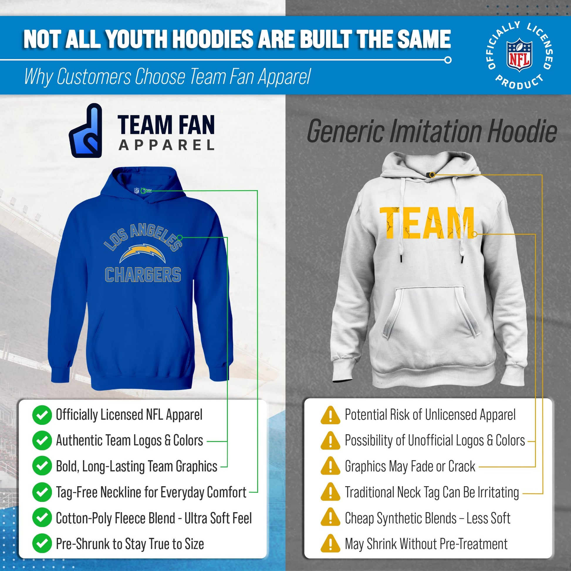Our youth gameday Los Angeles Chargers football pullover hoodie with a front pouch pocket is the ideal sweatshirt to wear on gameday. This Chargers hoodie for kids is comfortable and great for showing team pride all year long. This is an essential piece of girls and boys football apparel for pro football fans. Our team-colored hoodie sweatshirts are the perfect fan apparel for school and sports games. This hooded pullover with a pocket is ideal for warm or cold weather games. Chargers football pullover hoodie is made from a cotton poly blend material with raglan sleeves. These youth pro football sweatshirts have high quality features. Our youth gameday pullover hoodies feature 1x1 ribbing at cuffs and waistband. This Los Angeles hoodie youth sweatshirt has a twill neck tape. The raglan sleeves add a sophisticated look to these pro football team hoodies for boys and girls. This tagless sweatshirt ensures the most comfortable fit for boys and girls. The standard fit makes our football team hoodies for boys and girls the perfect kids sweatshirt for young fans. The thermal printed graphics are high definition, true to authentic team color, and resist fading. Our hoodies also make the best Chargers gifts for boys and girls. Youth football apparel is the perfect birthday gift for any professional sports fan. Our youth football team hoodies for boys and girls are great for wearing to school, the stadium, or while you're watching the game at home.
