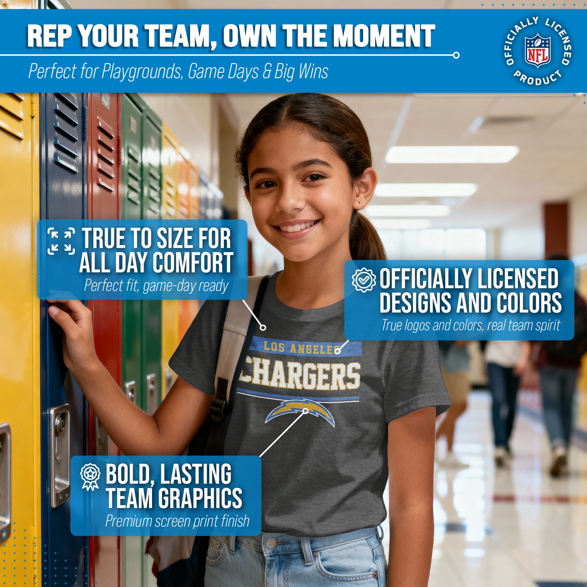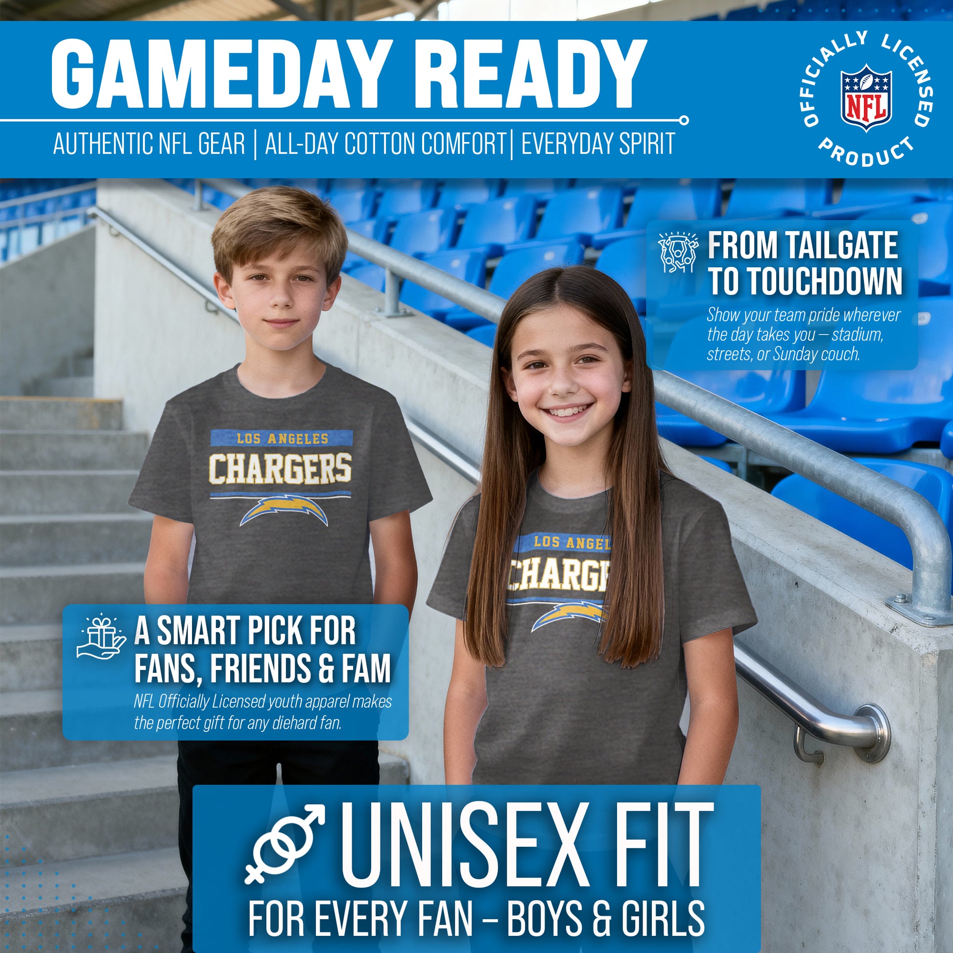 Heather/charcoal wordmark girls and boys Los Angeles Chargers t shirts are the ultimate light, soft, and comfortable tee. These Chargers tshirts for kids are the most versatile football apparel. Let us help you celebrate and showcase team pride with our durable and lightweight t shirts for boys and girls. This tee features a quality, thermal printed wordmark that will last wear after wear. The official wordmark design gives you the look of a loyal and seasoned sports fan and the unique heather, dual-blended material gives a trendy, distressed look without that heavy printed feel. Made of 50% cotton and 50% polyester, the dual blend material is extremely soft, smooth and comfortable. These Los Angeles Chargers youth shirts for boys and girls comes without a tag, so you'll never feel annoyed or irritated by those pesky neck tags again! This tee is essential apparel for any football fan. This classic Los Angeles youth t shirt will stand out and is perfect for gameday, hanging out with friends, or wearing to school. The unisex fit and design makes it ideal for both boys and girls! Quality Chargers t shirt makes the best birthday, or Christmas gifts for young fans; Our Los Angeles Chargers shirts for kids run true to size. All quality logos and colors are officially licensed and are of the highest quality. Show off your team pride with this official short sleeve shirt!