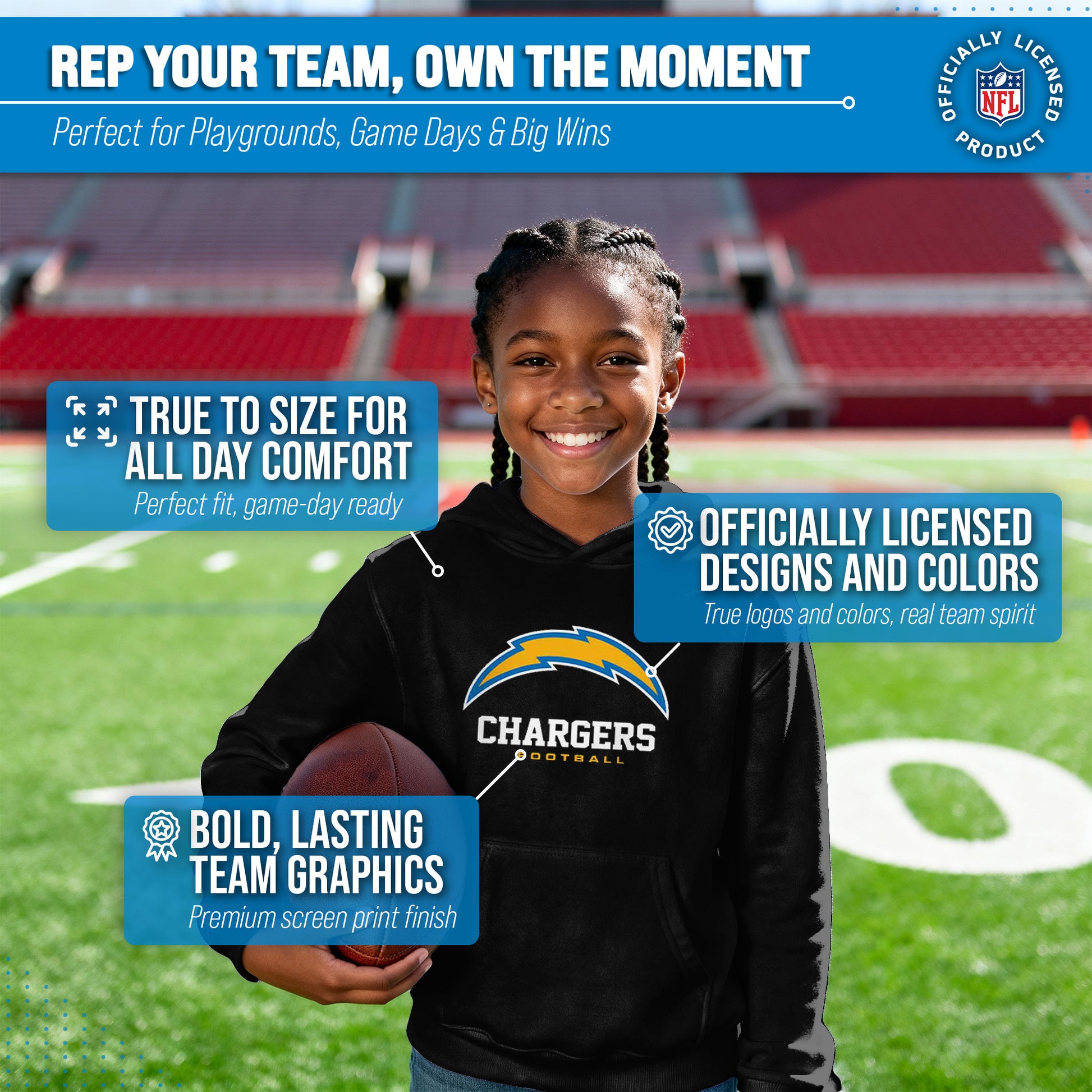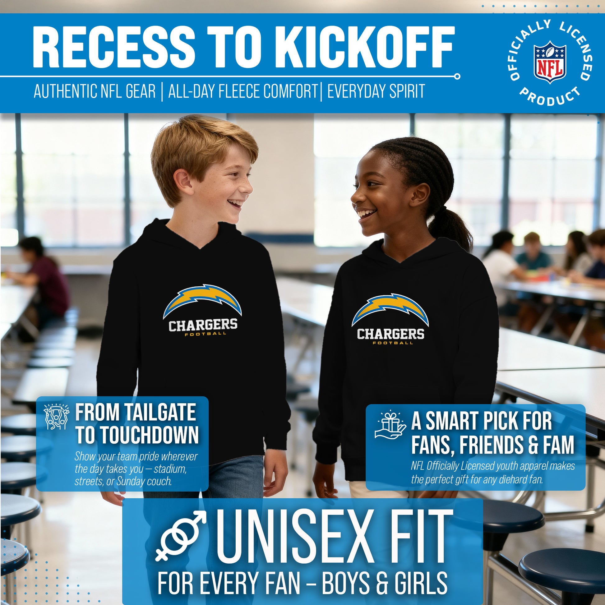 Los Angeles Chargers Youth NFL Ultimate Fan Logo Fleece Hooded Sweatshirt -Tagless Football Pullover For Kids - Black