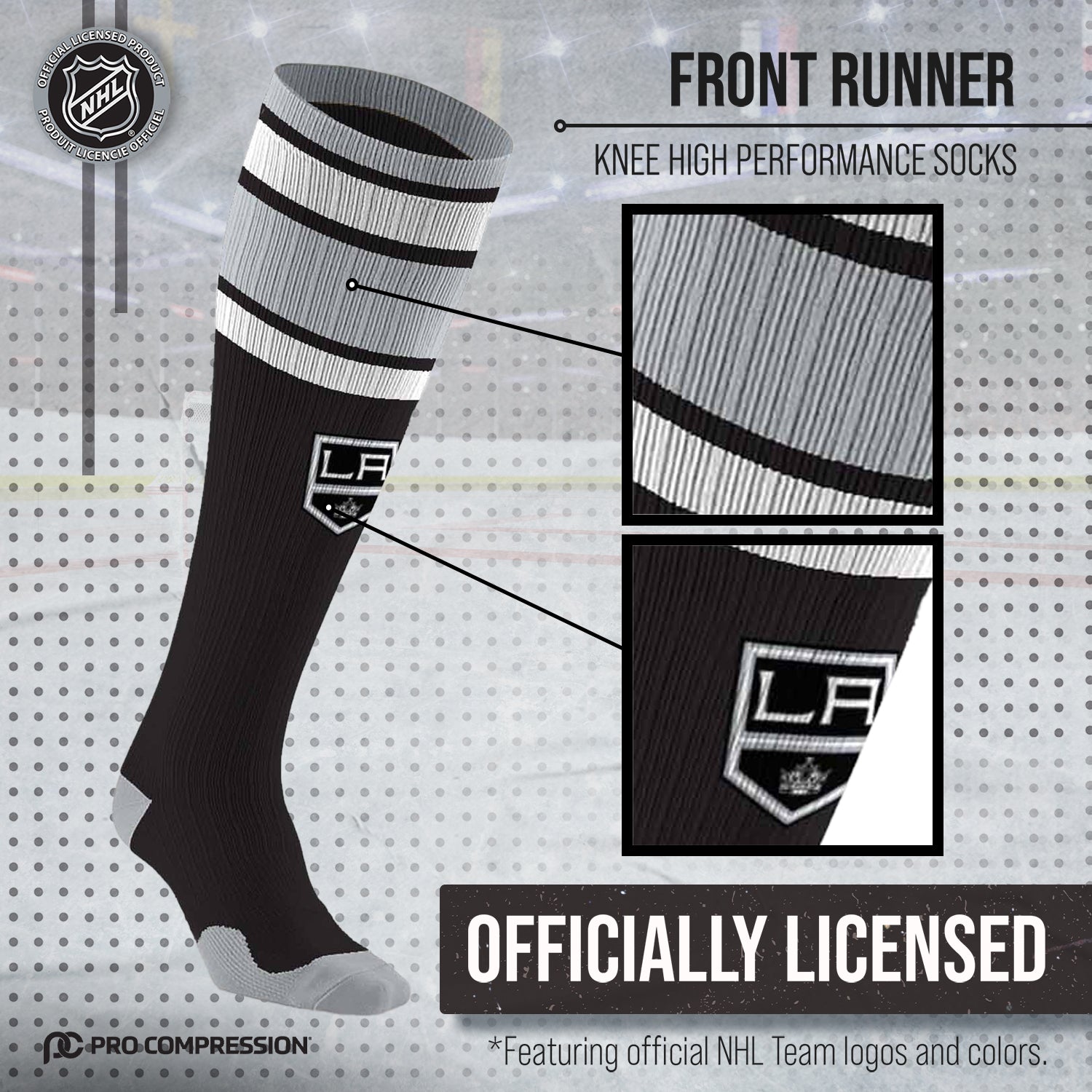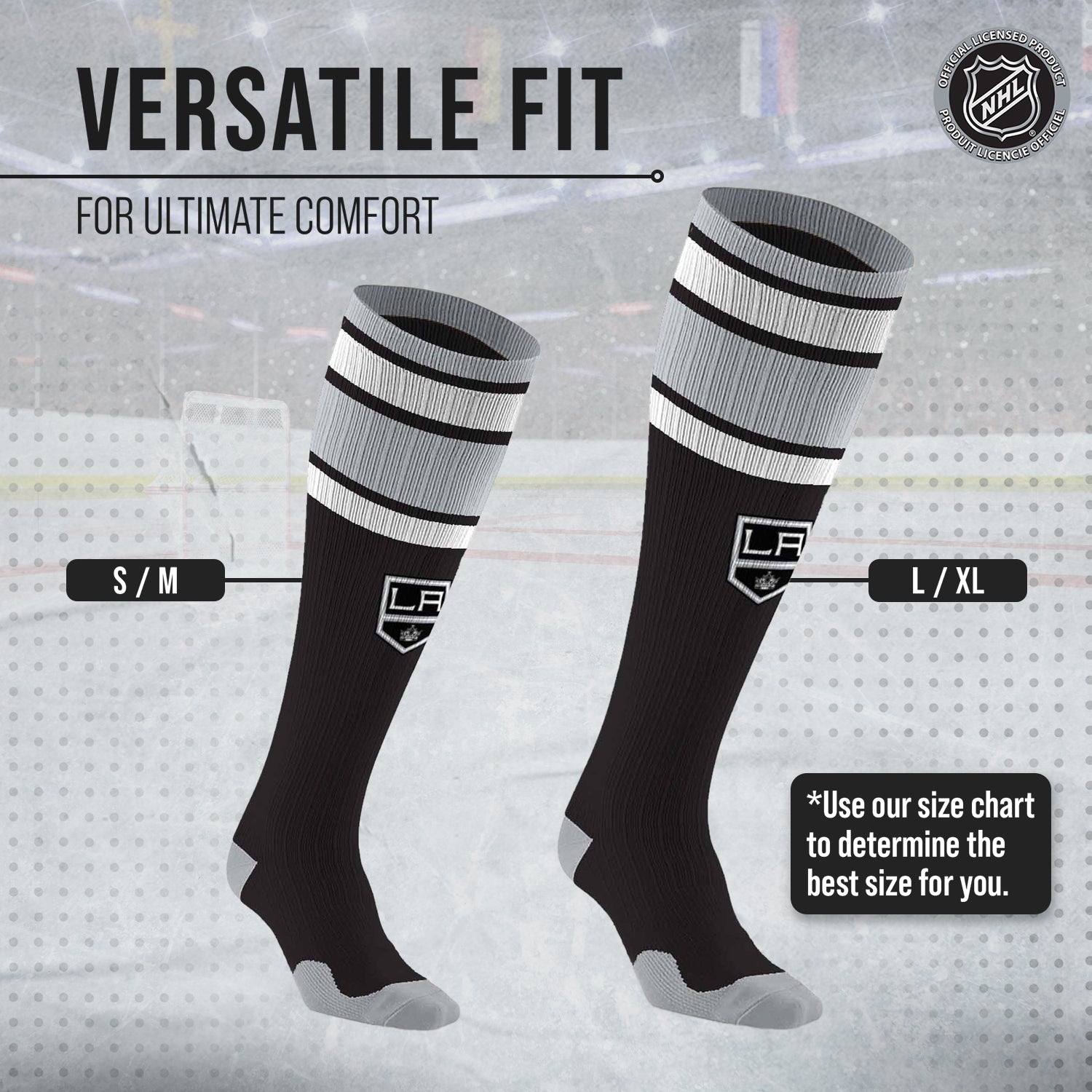 These Los Angeles Kings NHL knee-high performance socks are designed to support your muscles and tendons during exercise, as well as reduce soreness and swelling. With a true performance fit, our socks provide support where you need it most for the ultimate in athletics and recovery. Our proprietary blend of materials wicks moisture away from the skin to keep your feet dry and comfortable all day long. Two size options are available, so you can easily find a comfortable fit. Our Kings socks for women and men are the best performance socks and make great Los Angeles Kings gifts for men, Kings gifts, Kings gear, and Kings socks. If you are looking for high-quality performance socks, unisex compression socks, Kings merchandise, or Kings gear, these hockey socks are for you!