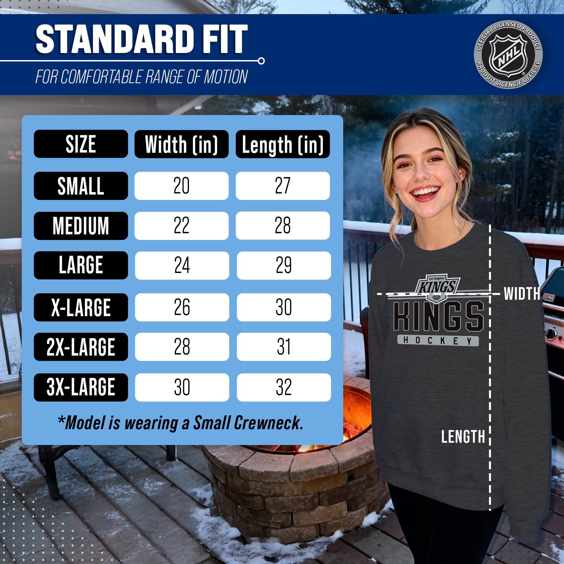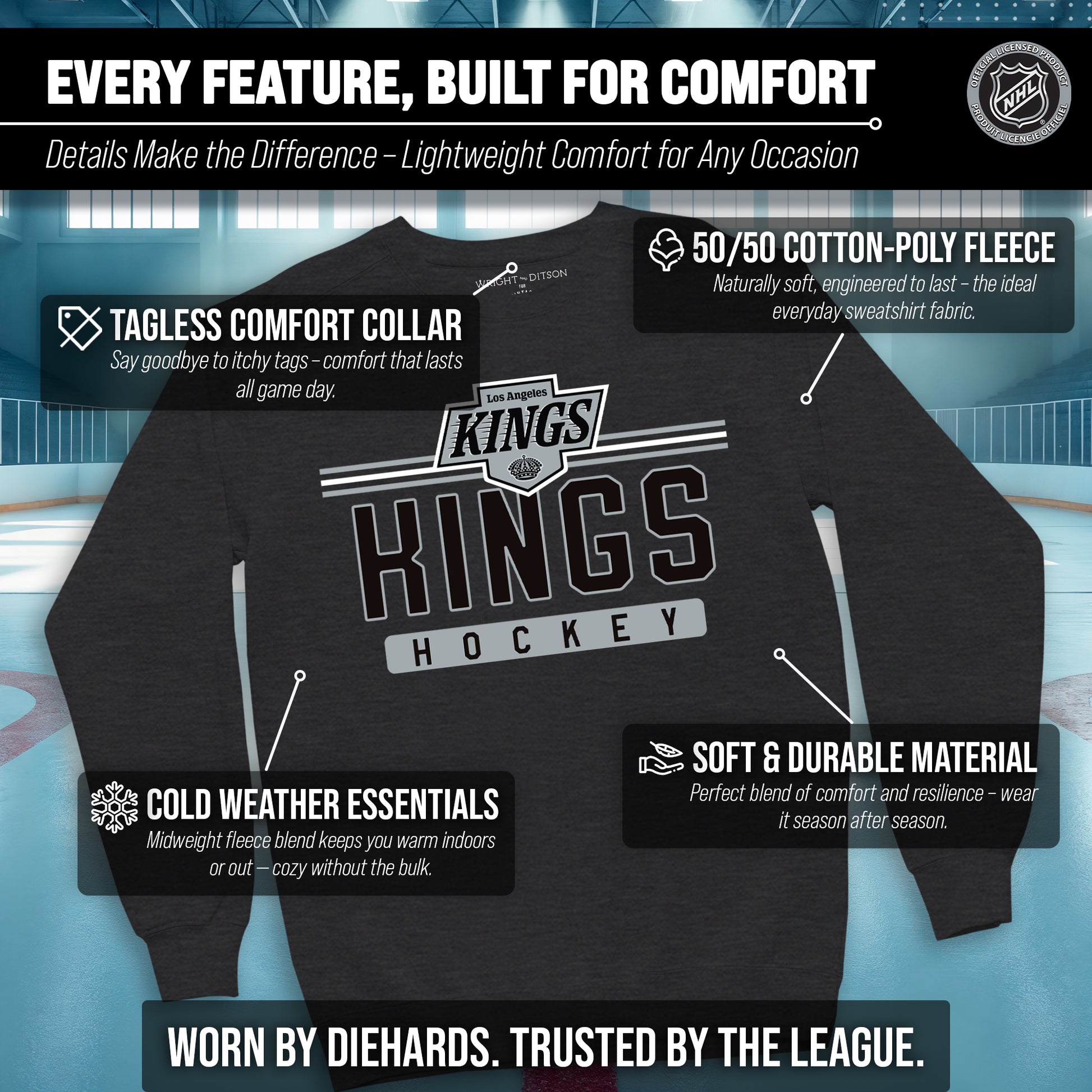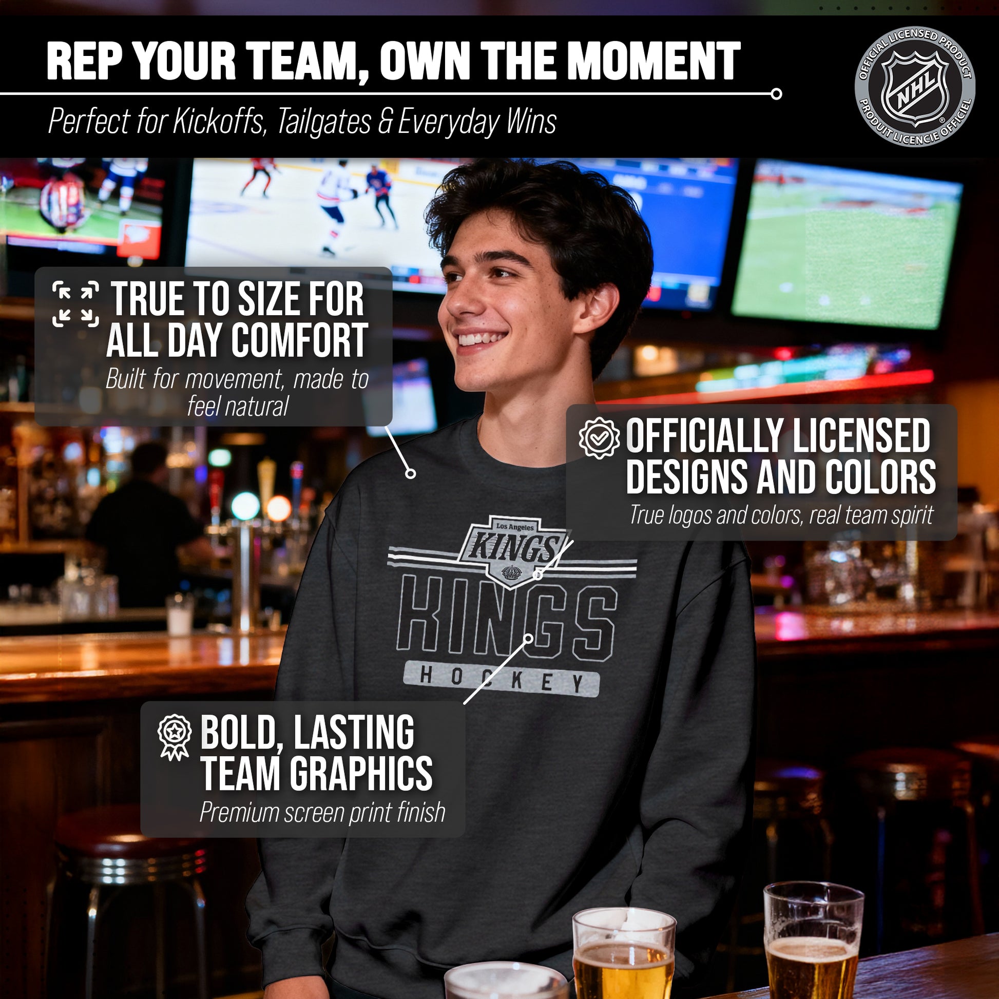 Score with Team Fan Apparel, the ultimate destination for officially licensed NHL apparel for men and women. Designed and printed in the USA, we use only the highest quality screen printing techniques to bring you the most comfortable, durable, and stylish clothing possible. Go ahead and show your team pride at the big game or any time! This premium crewneck fits both male and female adults and comes in small, medium, large, XL, and XXL. So needless to say, it fits Los Angeles Kings fans of all types! Maybe you aren't a Kings fan but you know someone who is? Don't worry! This high-quality crewneck is soft, lightweight, breathable, and a GREAT gift for any birthday, anniversary, Father's Day, Mother's day, you name it! So, if you want to stand out as the #1 fan at the next big game or watch party, you're going to want to be wearing one of these hockey t-shirts.