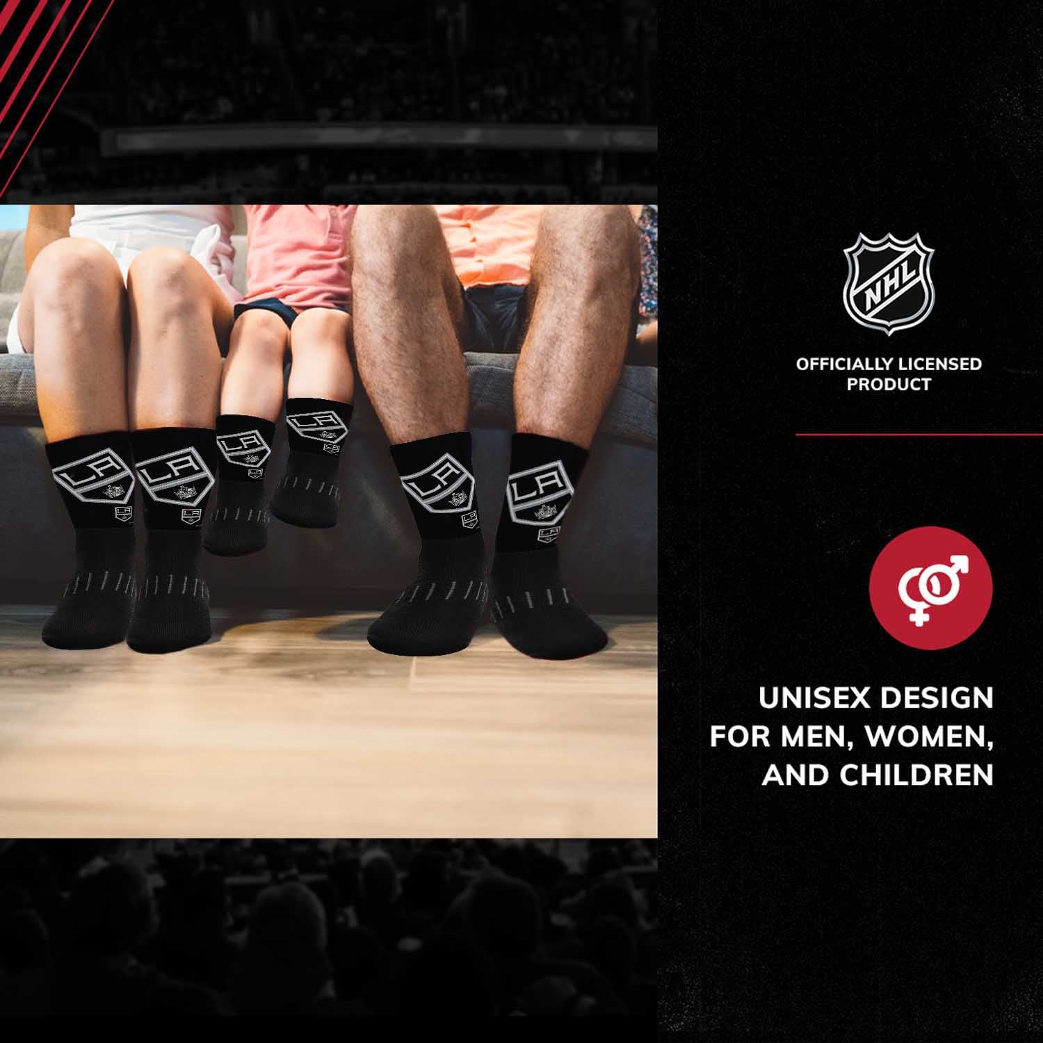 These youth Zoom Los Angeles Kings socks for children are great for showing off their Los Angeles pride from head to toe. The unisex Los Angeles youth socks are comfortable, and are available in a range of sizes. The crew length and poly-spandex blend featuring a supportive formed heel make them a comfortable choice for showcasing your love for your team all year long. Los Angeles socks are great additions to a collection of Los Angeles Kings stuff. Wear them with shorts, your favorite jersey, and Los Angeles Kings shoes for a superfan look, or rock them in the office for an alternative to argyle on casual Friday. On a lazy day, wear them with your underwear or pajamas and Los Angeles Kings house shoes while you put your feet up and enjoy a game in the house. Zoom socks make great gifts for all young hockey fans, combine them with other Los Angeles Kings items for the perfect birthday or graduation gift. The officially-licensed team logo, colors, and graphics make these socks the ones kids prefer. Fabric content is 95% polyester, 2% nylon, 2% rubber, and 1% spandex. Machine washable, tumble dry low.