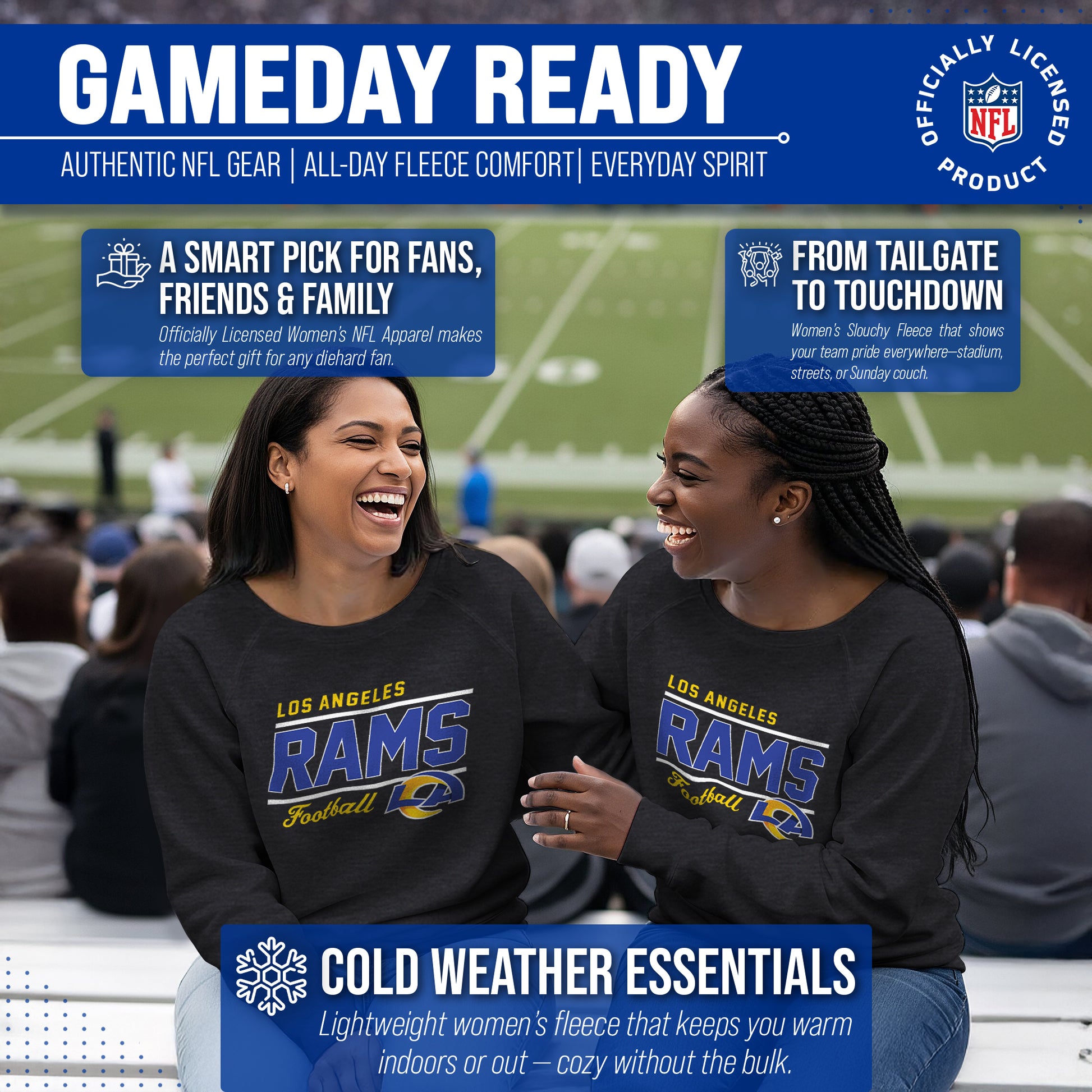 Our officially licensed Los Angeles Rams long sleeve crew neck pullover is super comfortable, runs true to size, and is great for showing off your Rams pride. The high-quality thermal printed logo will look fresh after years of wear, making it a great alternative to wearing a Los Angeles Rams womens jersey. Our womens long sleeve Gameday crewneck has a relaxed fit for a casual, comfortable look. The long sleeve Rams crew will look great with shorts at tailgates in warmer months, or with jeans or leggings when it gets cooler. Layer it with a hoodie or even a Los Angeles football jersey when the weather gets cold. Available in plus sizes up to 3XW, this is a Los Angeles Rams pullover that women who are plus size or straight size will feel comfortable in. If you're looking to give the gift of ladies Rams apparel, our long sleeved Los Angeles Rams Slouchy Crew is the perfect gift. Officially licensed to ensure no counterfeit designs or colors, these Los Angeles crews for women are perfect for super fans. Made from a cotton poly blend to keep you comfortable, the womens raglan long sleeve Gameday Slouchy Crew will definitely become one of your favorite pieces of Los Angeles Rams apparel.