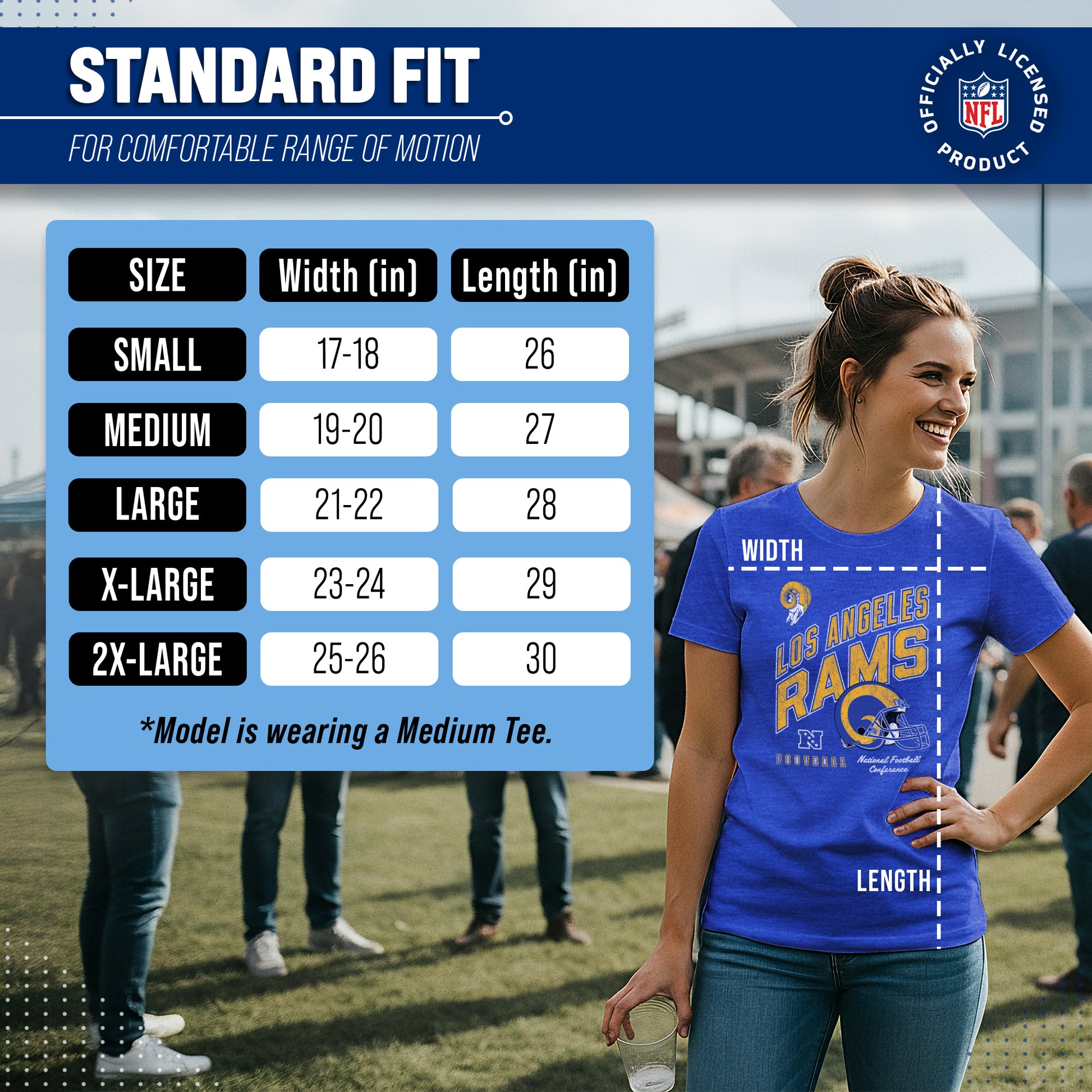 Calling all ladies! Get ready to rock game day with the Women's Team Fan Apparel Distressed Helmet T-Shirt! This comfortable and stylish Los Angeles Rams womens tee is perfect for any female football fan, whether you're cheering on your favorite team at the stadium or watching from home. Made from a super soft cotton fabric , this shirt will keep you cool and comfortable all game long. The helmet, team name, team logo and official team color adds a touch of retro flair, while the tag-less design ensures itch-free wear. Whether you're a die-hard fan or just love a good simple look, this shirt is perfect for showing off your team spirit. Available in a wide range of women's sizes, it's suitable for all shapes and sizes! So grab your girlfriends and get ready to cheer on your team in style with the Women's Team Fan Apparel Distressed Helmet T-Shirt!
