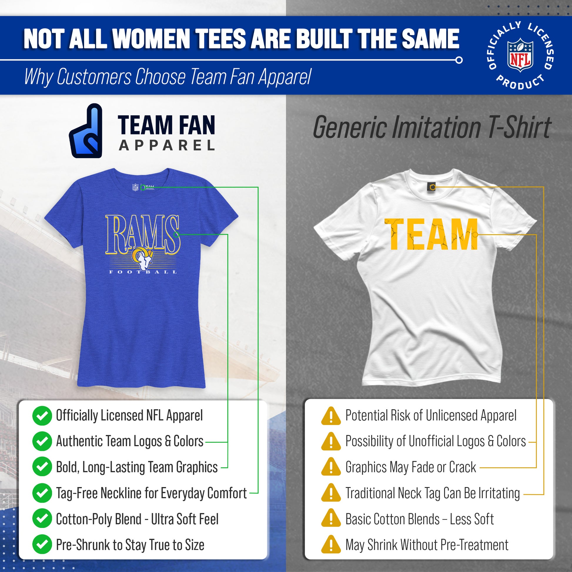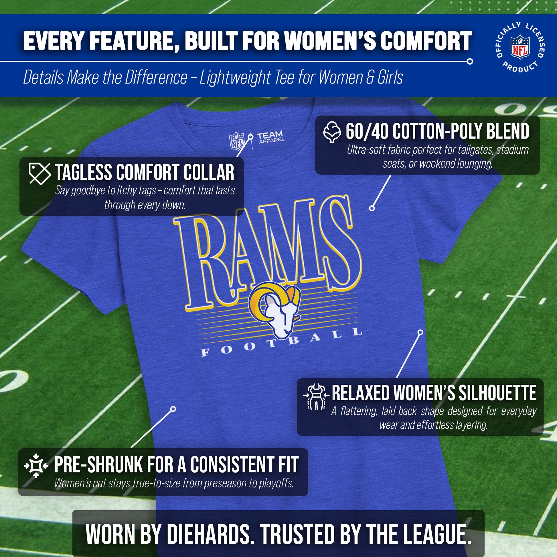 Calling all ladies! Get ready to rock game day with the Women's Team Fan Apparel Overtime Blueprint T-Shirt! This comfortable and stylish Los Angeles Rams womens tee is perfect for any female football fan, whether you're cheering on your favorite team at the stadium or watching from home. Made from a super soft cotton fabric , this shirt will keep you cool and comfortable all game long. The text, logo and official team color adds a touch of retro flair, while the tag-less design ensures itch-free wear. Whether you're a die-hard fan or just love a good classic look, this shirt is perfect for showing off your team spirit. Available in a wide range of women's sizes, it's suitable for all shapes and sizes! So grab your girlfriends and get ready to cheer on your team in style with the Women's Team Fan Apparel Overtime Blueprint T-Shirt!