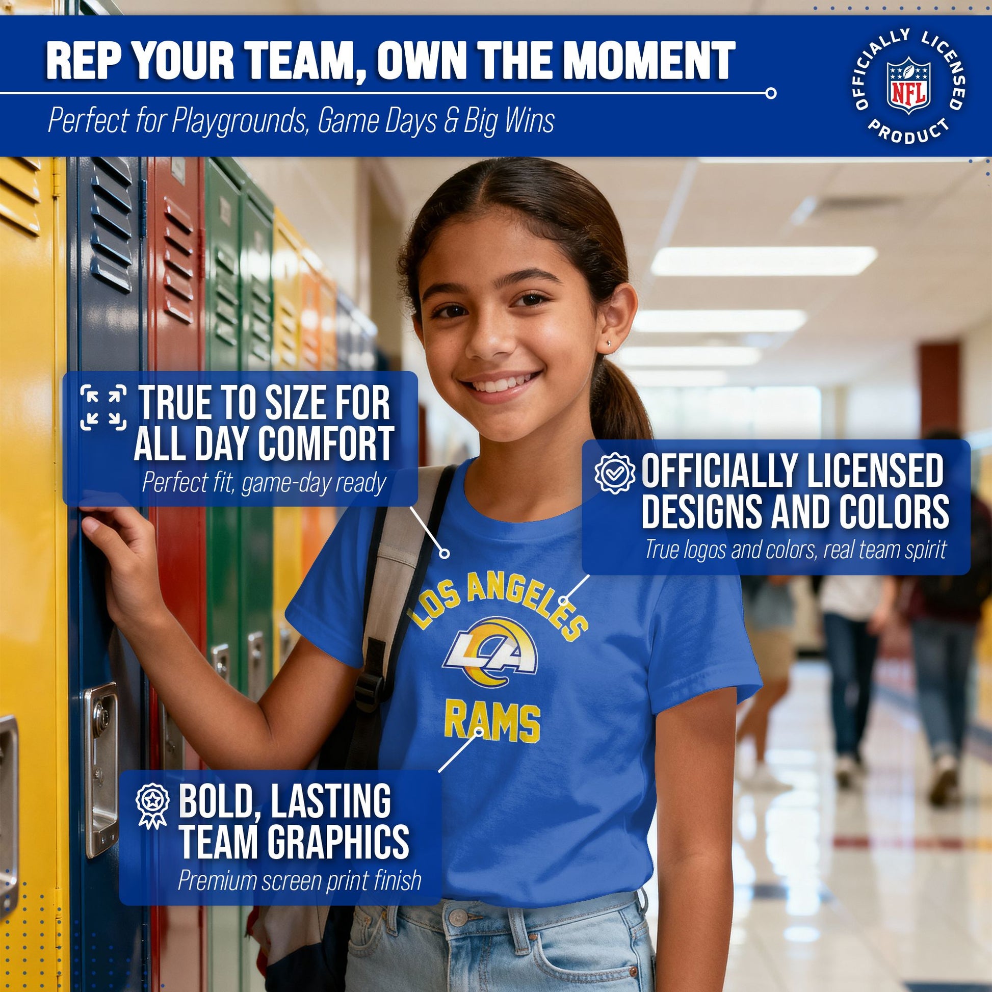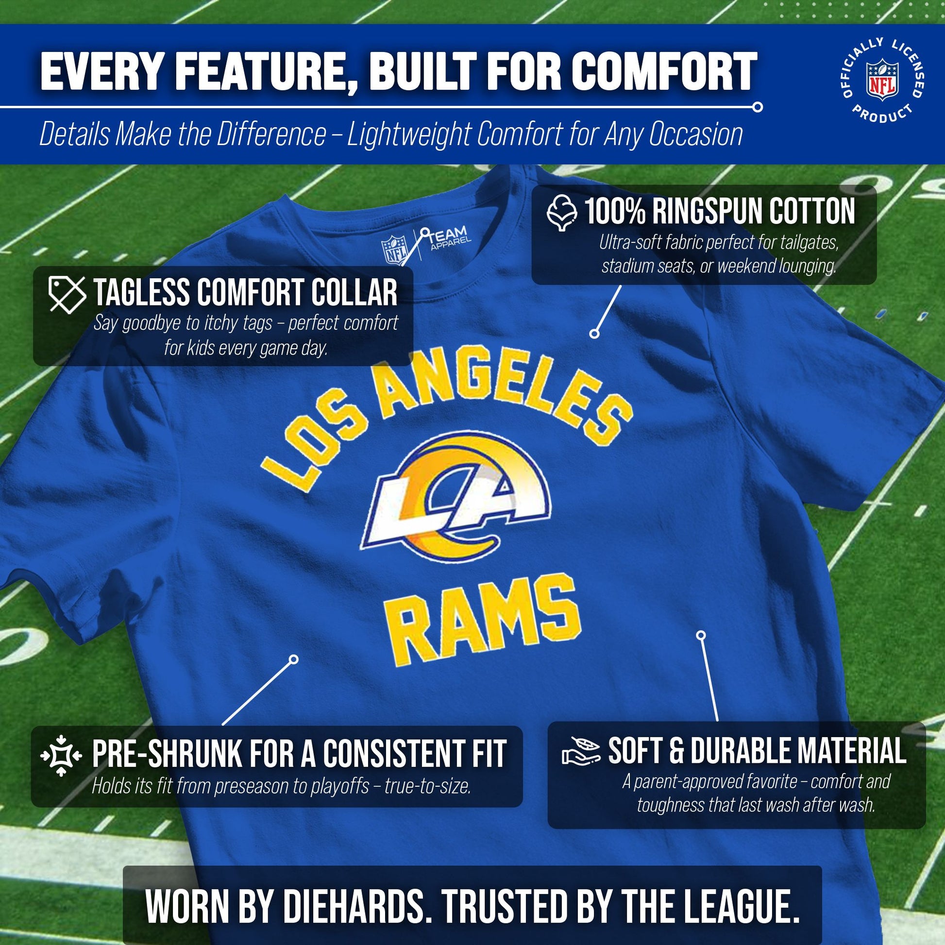 There's nothing more exciting than a much-anticipated gameday. Our Youth Gameday Los Angeles Rams football tshirt is the ideal shirt to wear on gameday whether you're at the game, or watching from the comfort of your own home. This Los Angeles tshirt is super comfortable, runs true to size, and is great for showing team pride all year long! The semi-fitted style makes this the perfect Rams youth shirt for both boys and girls. Our shirts really are the perfect fan apparel for school and sports games. The youth gameday shirt is lightweight and ideal for warmer weather or as an extra layer during colder months. Our Rams shirts for boys and girls are essential apparel for young football fans. Our tagless Los Angeles Rams youth shirt ensures the most comfortable fit. This semi-fitted tshirt is made from a 50/50 cotton/polyester blend; contrast shoulder to shoulder neck tape and 1x1 rib knit neck makes for comfortable fit around the neck and shoulders. This high quality shirt for kids features a double-needle sleeve and bottom hems. These are high quality Rams graphic shirts for girls and boys. The vivid graphics will stay crisp wear after wear, and year after year. The thermal printed graphics are high definition, official true team colors, and also resist fading. This Los Angeles tshirt is made with high stitch density for smoother printing surface. Our official shirts for boys and girls make the best gifts. This piece of Los Angeles Rams apparel is the perfect birthday or Christmas gift for any young football fan. This tee is absolutely perfect for school, stadium fun, or watching the game at home.