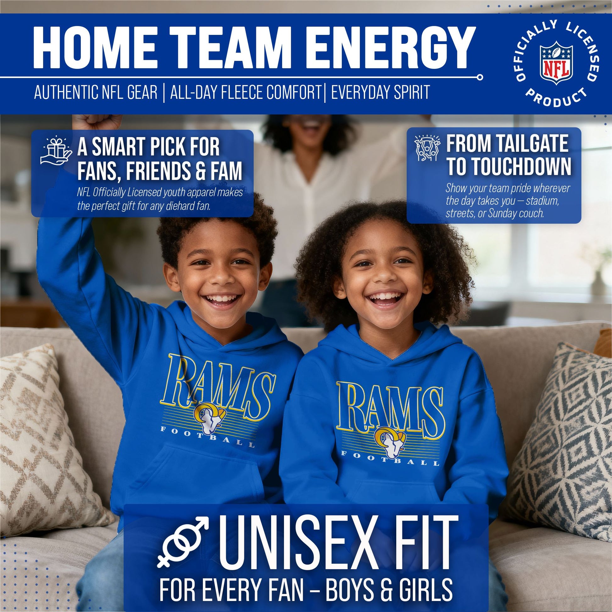 Hey there, young sports fans! Get ready to show off your team spirit with the Team Fan Apparel Los Angeles Rams Youth Overtime Blueprint Football Fleece Hooded Sweatshirt! This sweatshirt is made from a soft and cozy cotton polyester fleece and is perfect for staying warm on game day or any day. The unisex design makes it suitable for both boys and girls, and its tag-less feature ensures ultimate comfort all day long. Featuring an original outlined design with their vintage logo that proudly displays the team's colors, this youth hoodie will be turning heads everywhere it's worn. The front pouch pocket will keep you warm on those cold game days as you cheer on your Rams! Just pull it on and go! So whether you're at the stadium or hanging out with friends, make sure you're representing your team in style with our NFL youth apparel. Printed and designed in the USA, have confidence your sweatshirt will last! Order now and get your future pro geared up to be the next super fan!