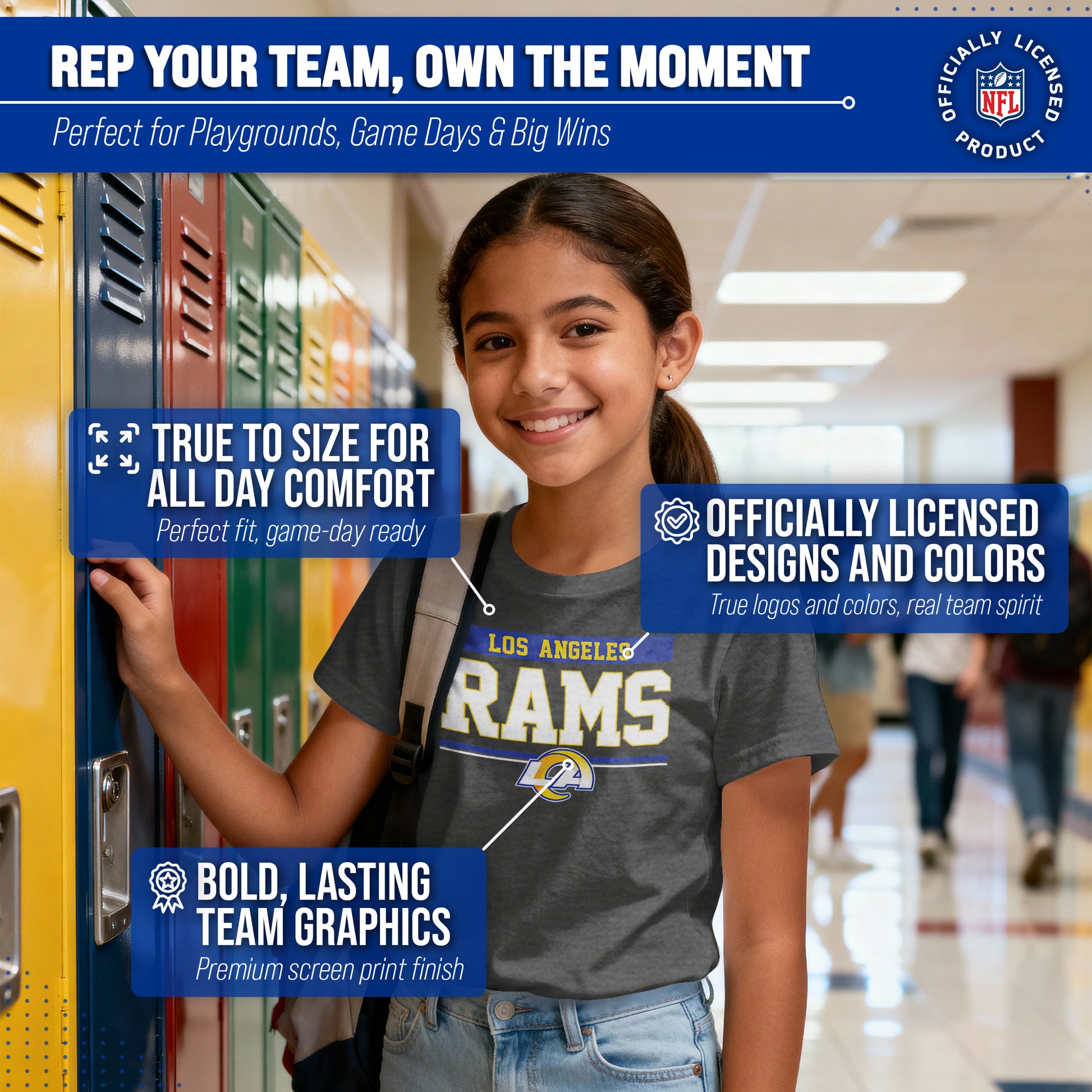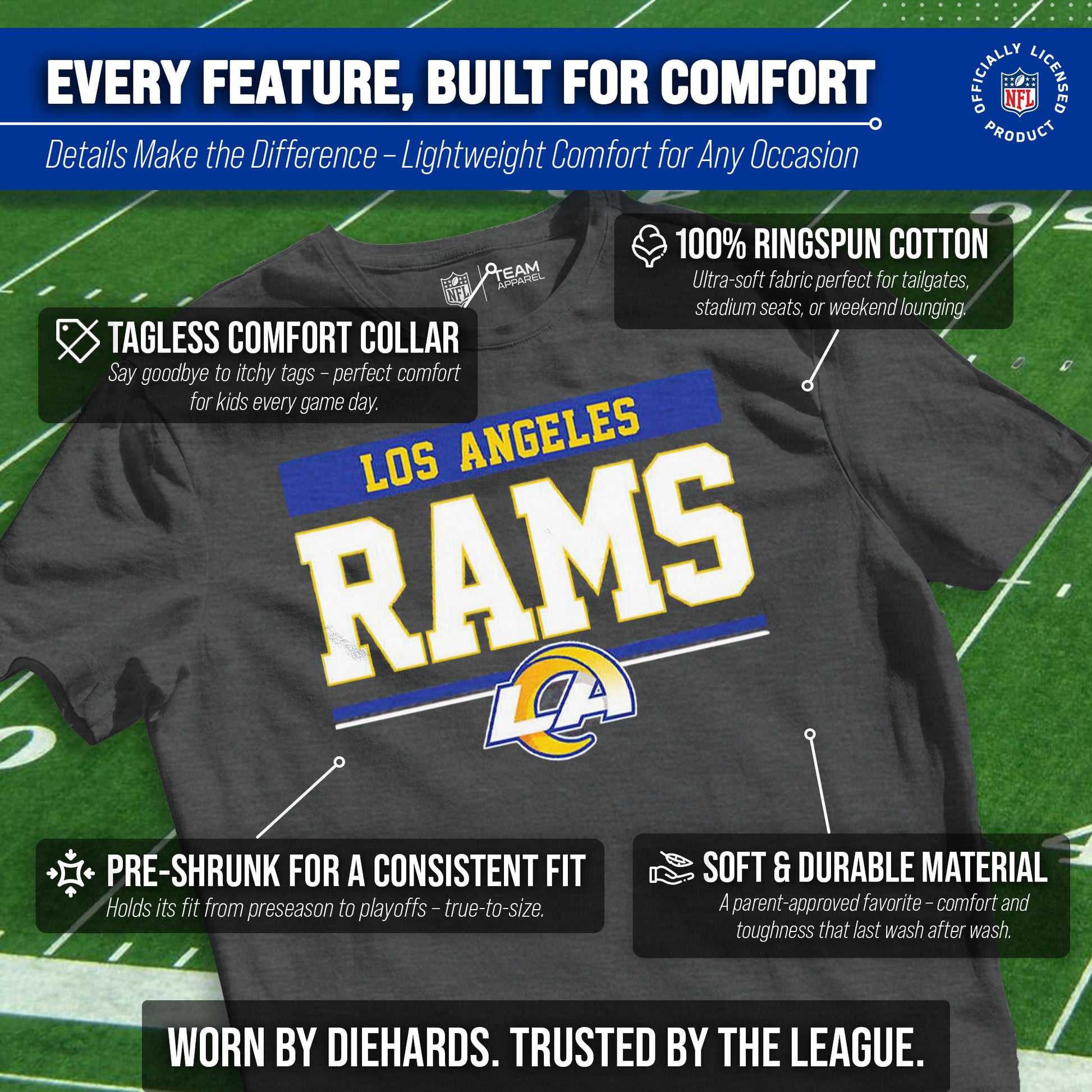 Heather/charcoal wordmark girls and boys Los Angeles Rams t shirts are the ultimate light, soft, and comfortable tee. These Rams tshirts for kids are the most versatile football apparel. Let us help you celebrate and showcase team pride with our durable and lightweight t shirts for boys and girls. This tee features a quality, thermal printed wordmark that will last wear after wear. The official wordmark design gives you the look of a loyal and seasoned sports fan and the unique heather, dual-blended material gives a trendy, distressed look without that heavy printed feel. Made of 50% cotton and 50% polyester, the dual blend material is extremely soft, smooth and comfortable. These Los Angeles Rams youth shirts for boys and girls comes without a tag, so you'll never feel annoyed or irritated by those pesky neck tags again! This tee is essential apparel for any football fan. This classic Los Angeles youth t shirt will stand out and is perfect for gameday, hanging out with friends, or wearing to school. The unisex fit and design makes it ideal for both boys and girls! Quality Rams t shirt makes the best birthday, or Christmas gifts for young fans; Our Los Angeles Rams shirts for kids run true to size. All quality logos and colors are officially licensed and are of the highest quality. Show off your team pride with this official short sleeve shirt!